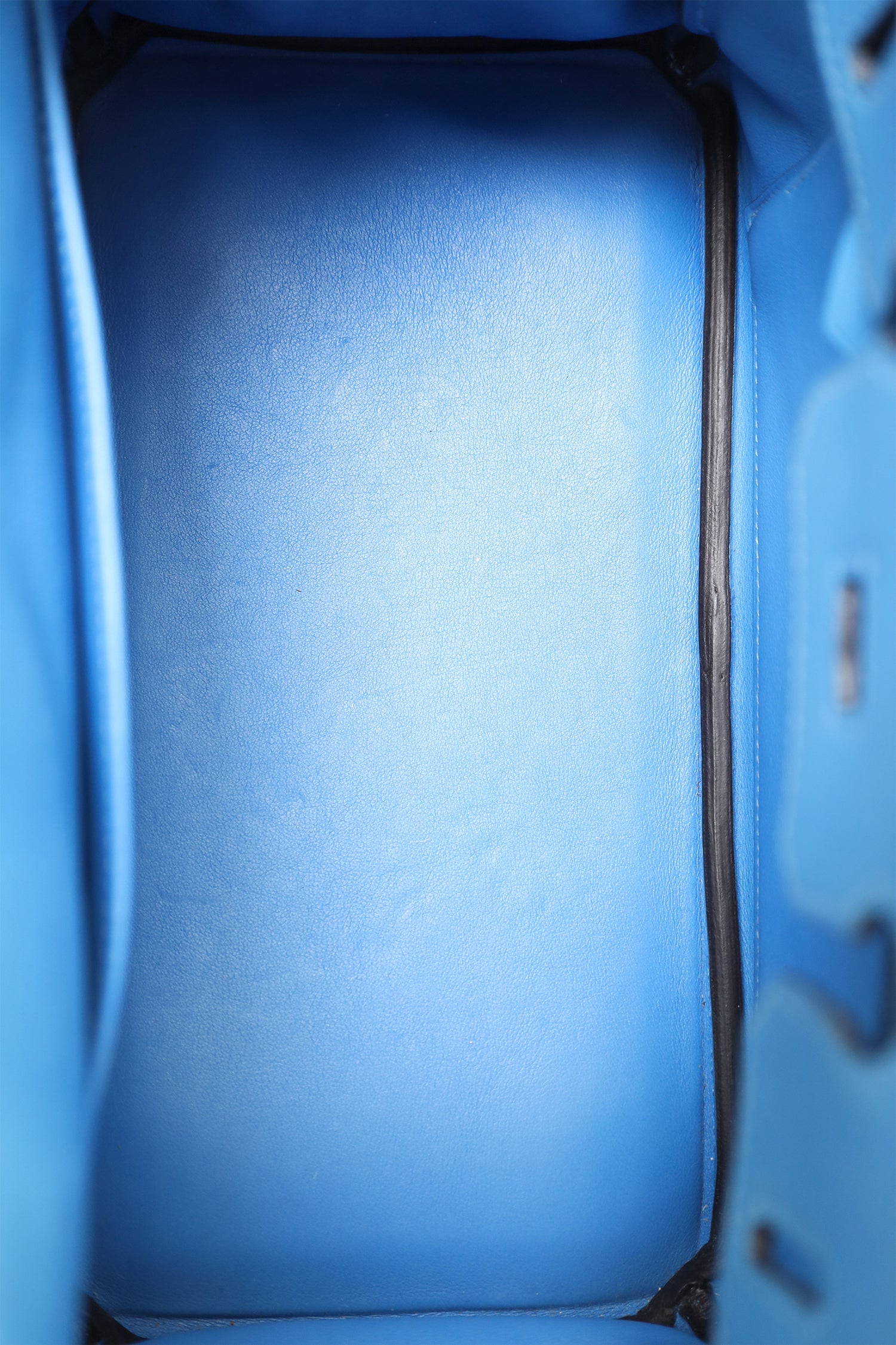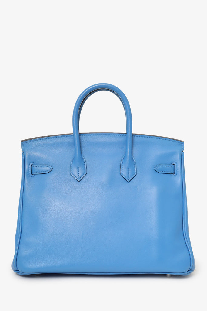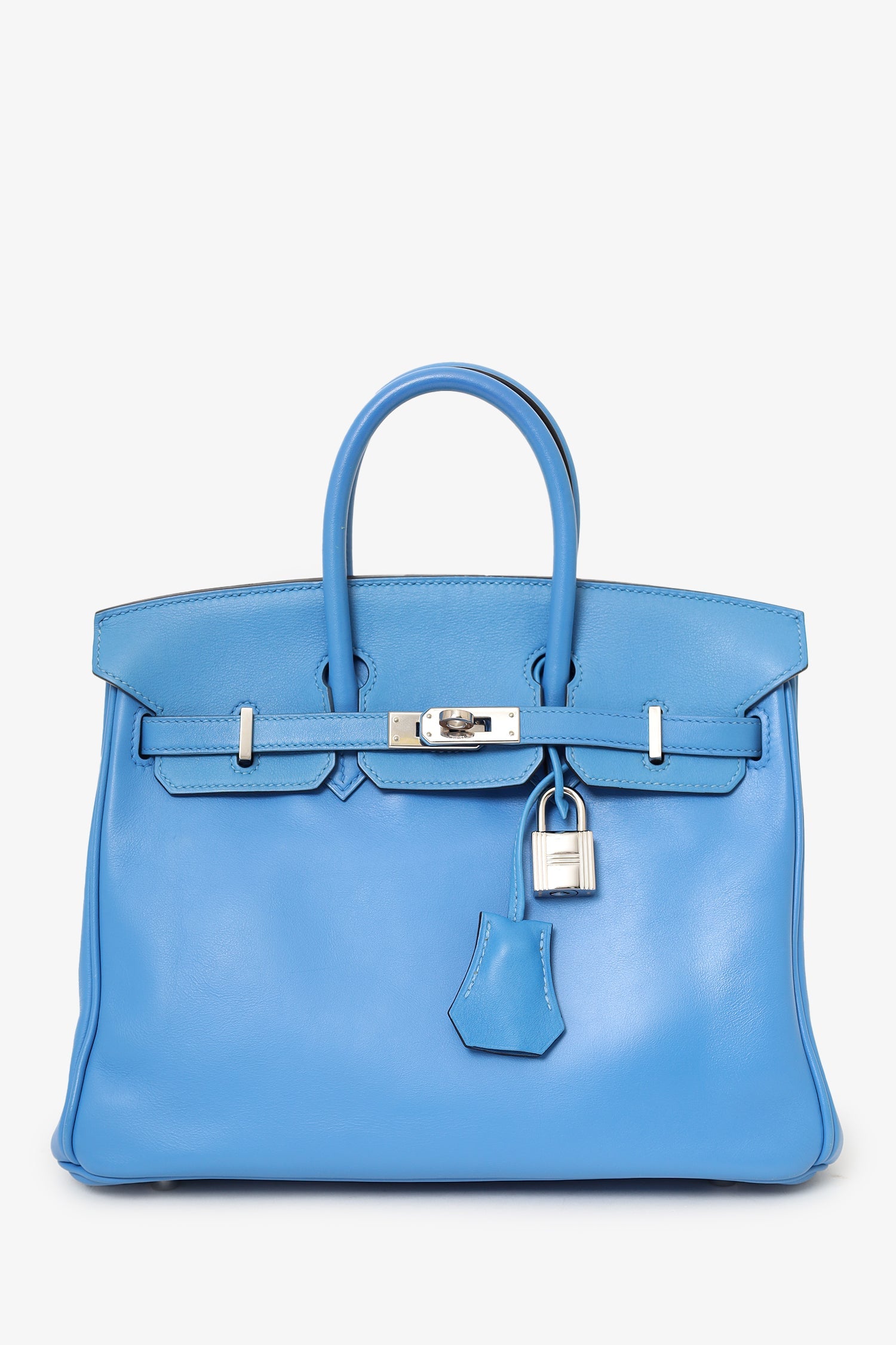 Hermes 2015 Blue Swift Leather Birkin 25. Front fold-over flap and side straps with turn-lock closure. Twin top handles. Protective studs on bottom. Interior zip and slip pocket. Includes clochette. Silver-tone hardware. Tonal stitching.