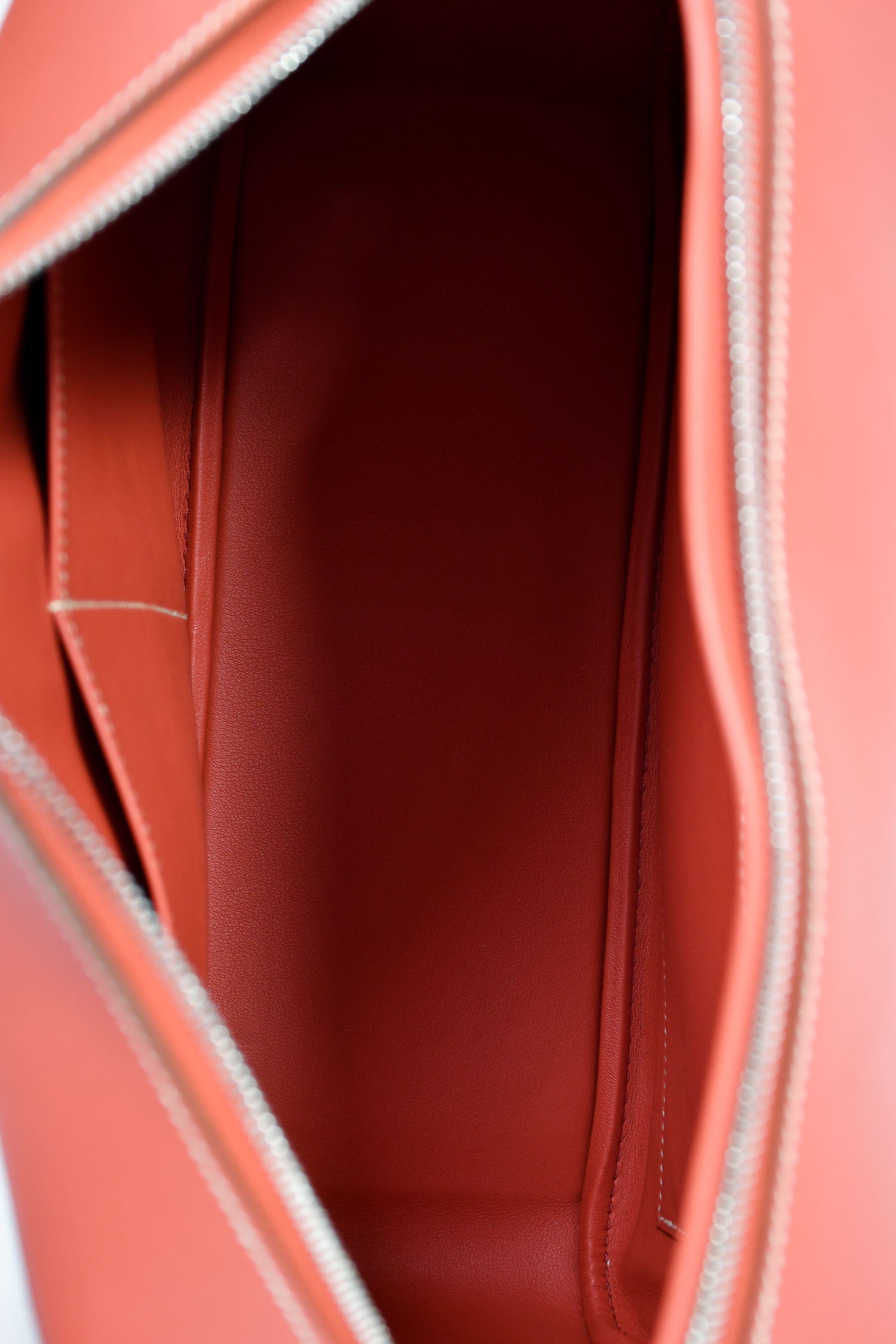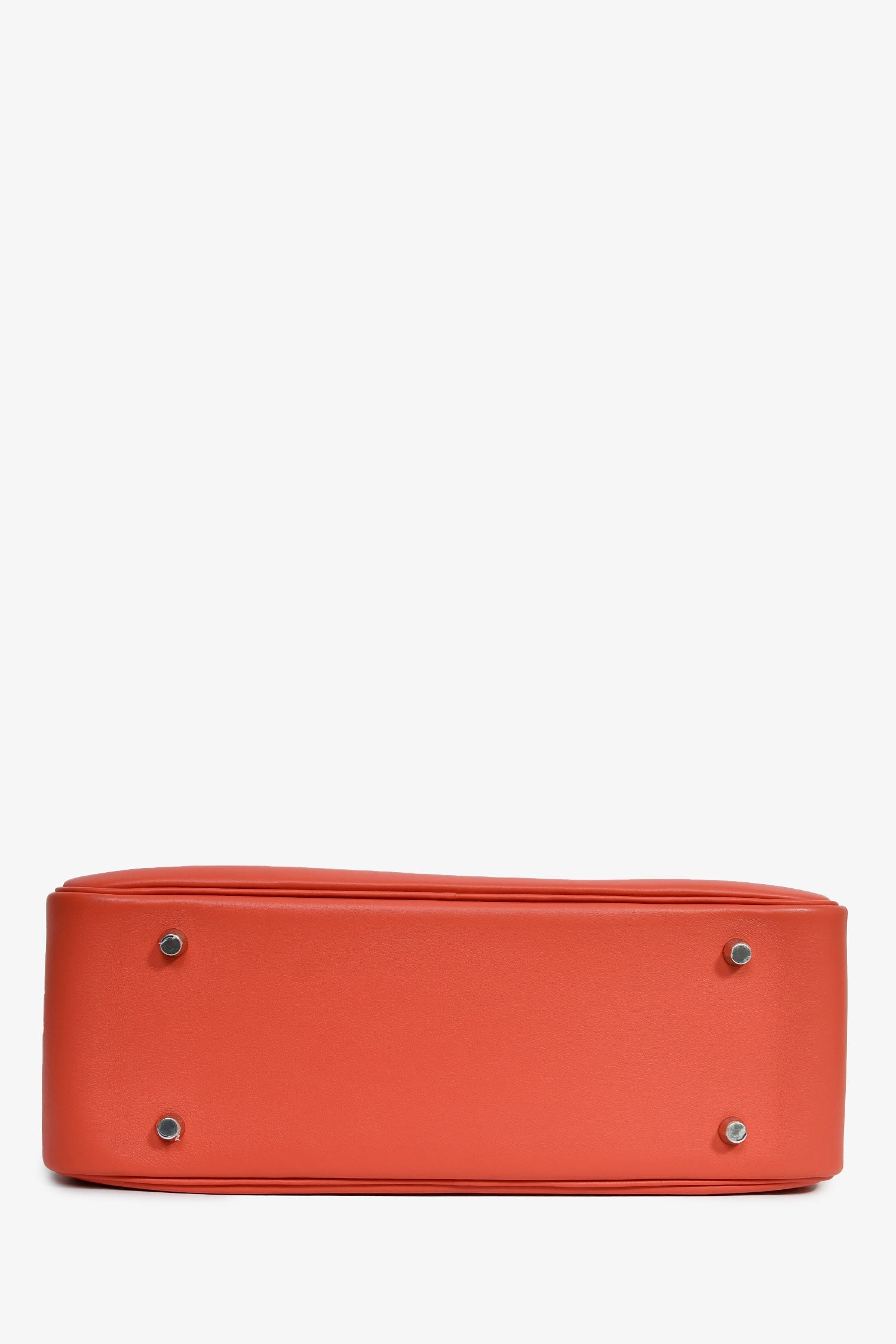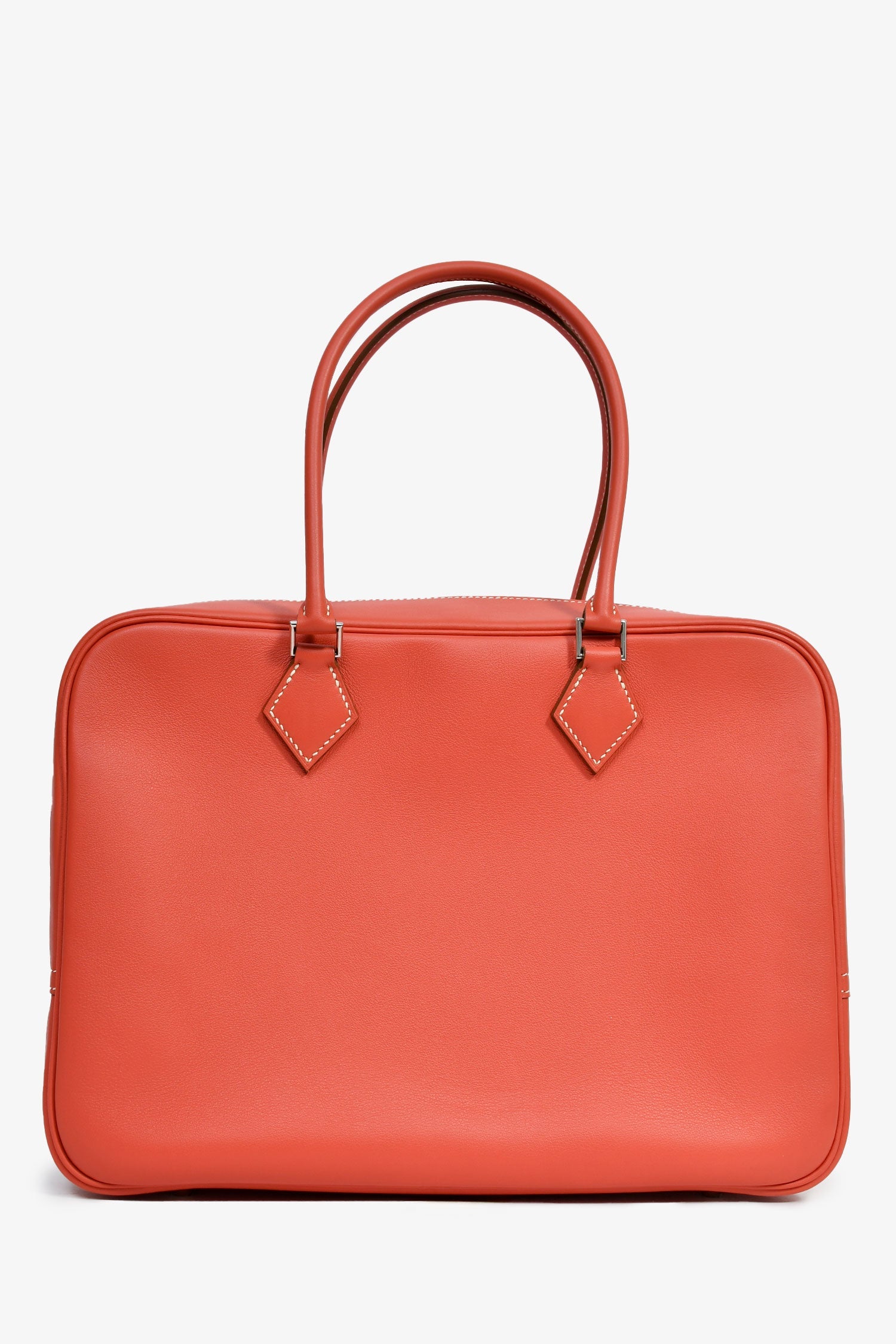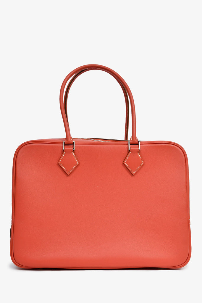 Hermès 2015 Orange Evercolour Leather Plume 32 Top Handle Bag. Top zip closure. Dual rolled handles. Three interior wall slip pockets. Protective metal bottom. Silver-tone hardware. Tonal stitching.