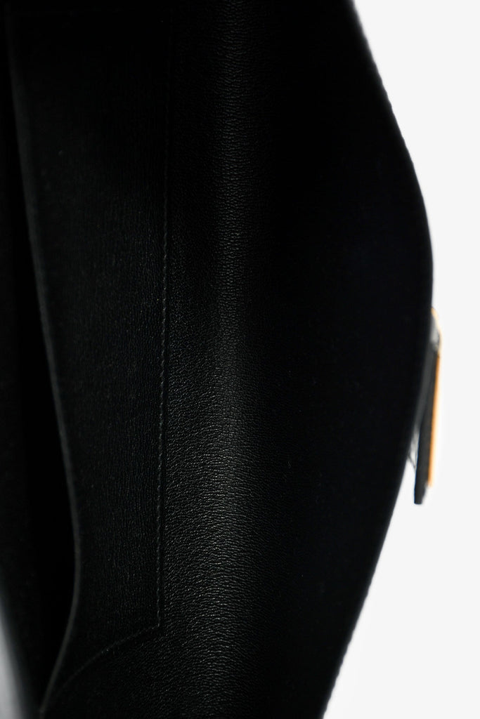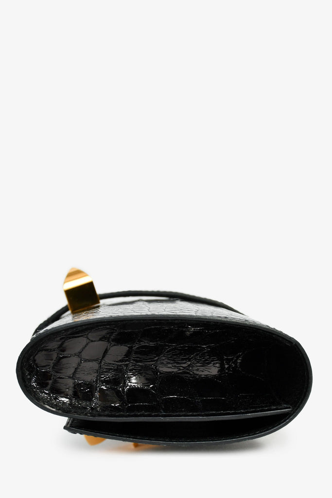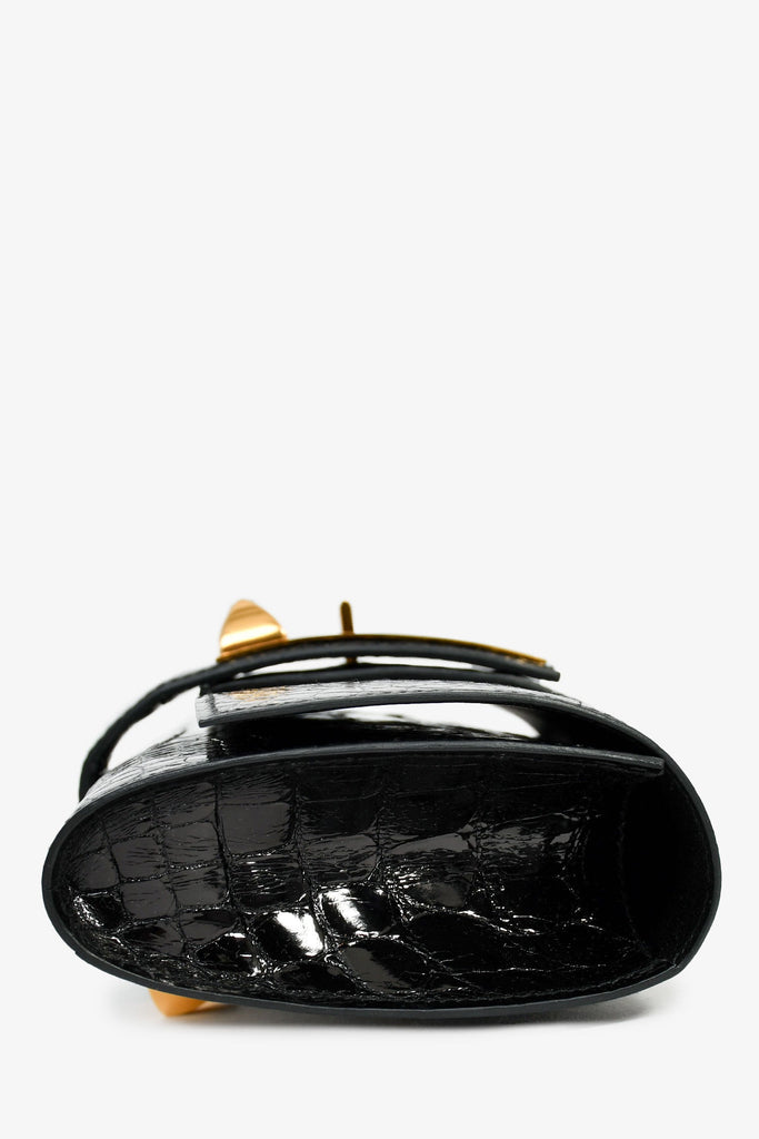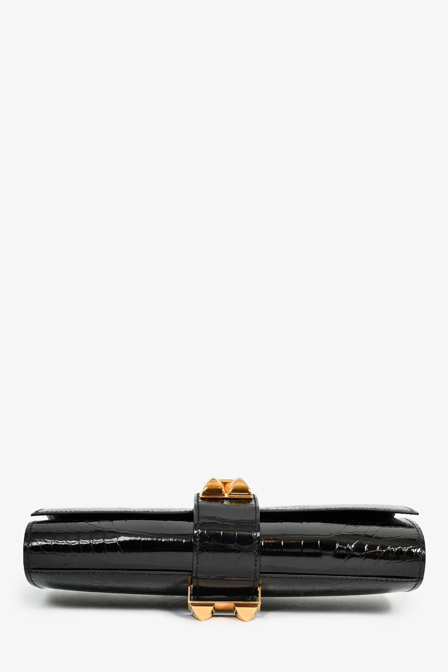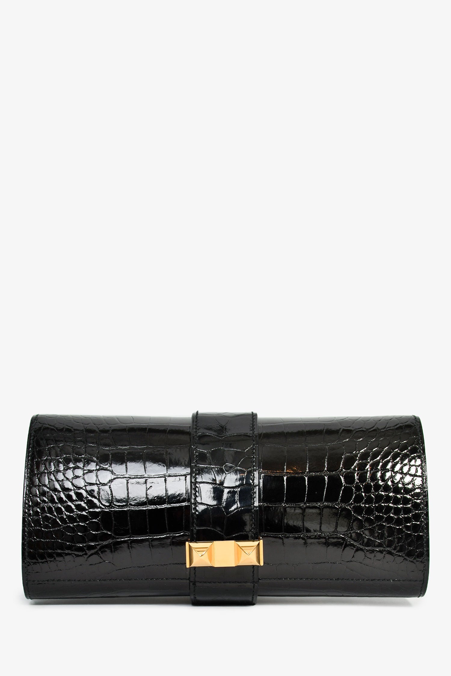Hermes 2016 Black Alligator 'Medor' 23 Clutch. Gold-tone hardware. Leather-lined interior with a slip pocket. Wrap-around strap with a pull-through closure. Tonal stitching.