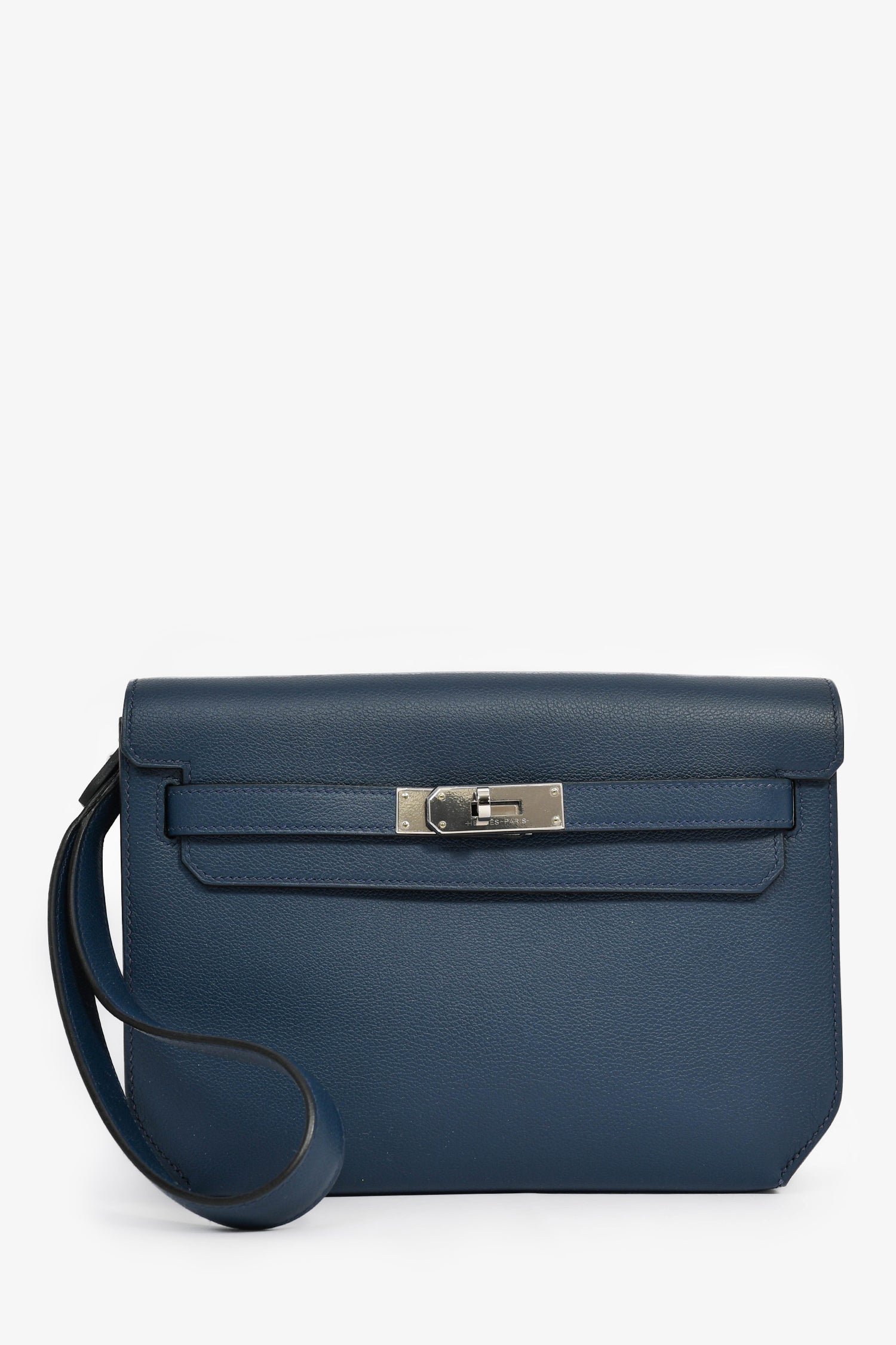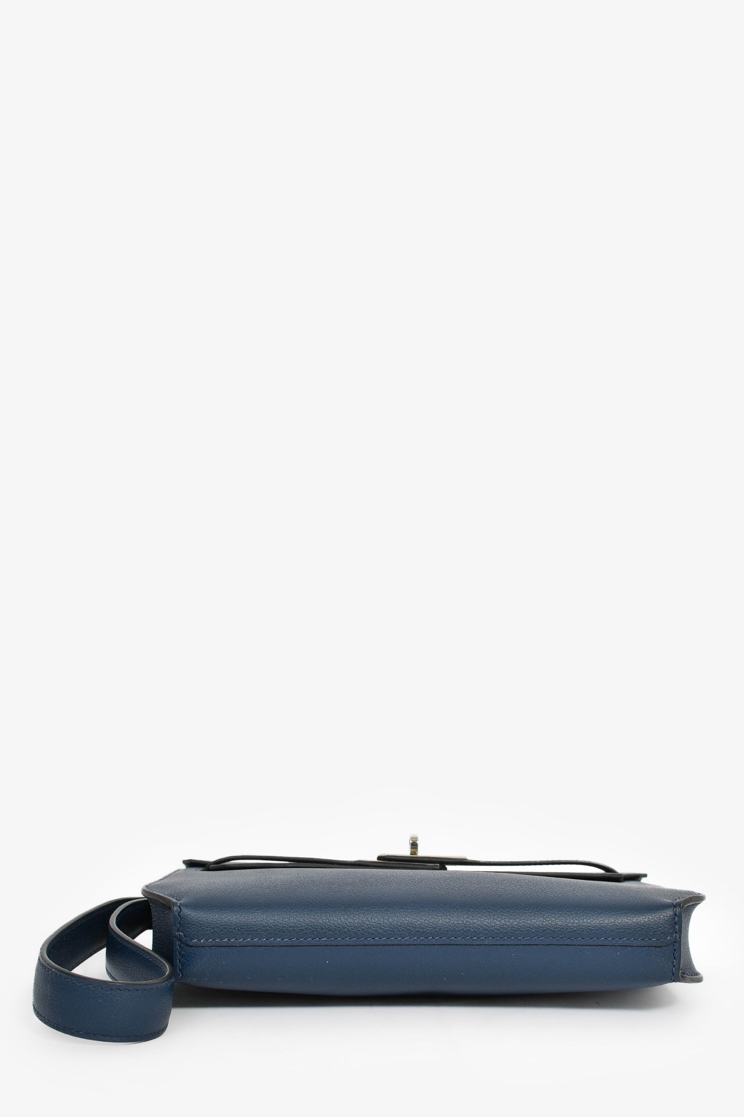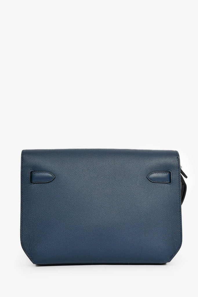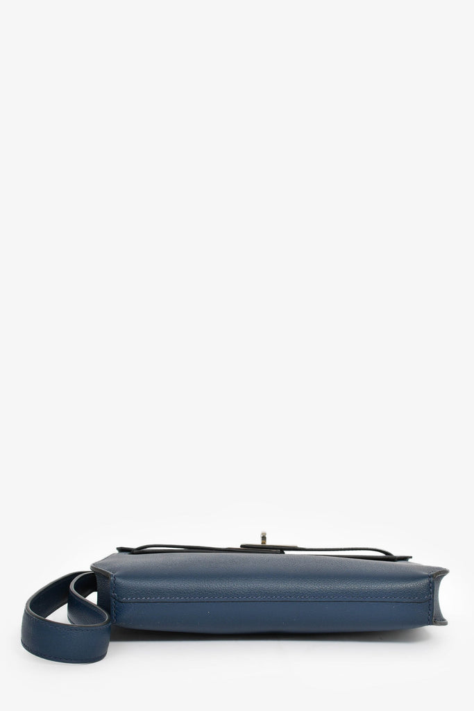 Hermès 2019 Navy Blue Epsom Leather Kelly Dépêches 25. Front fold-over straps with turn-lock closure. Front slip pocket. Open interior. Silver-tone hardware. Wrist strap.