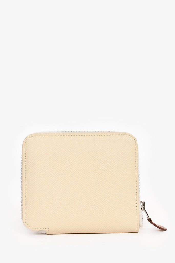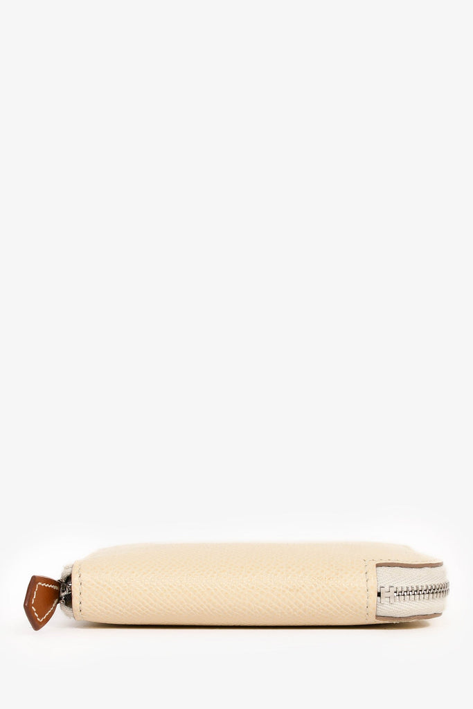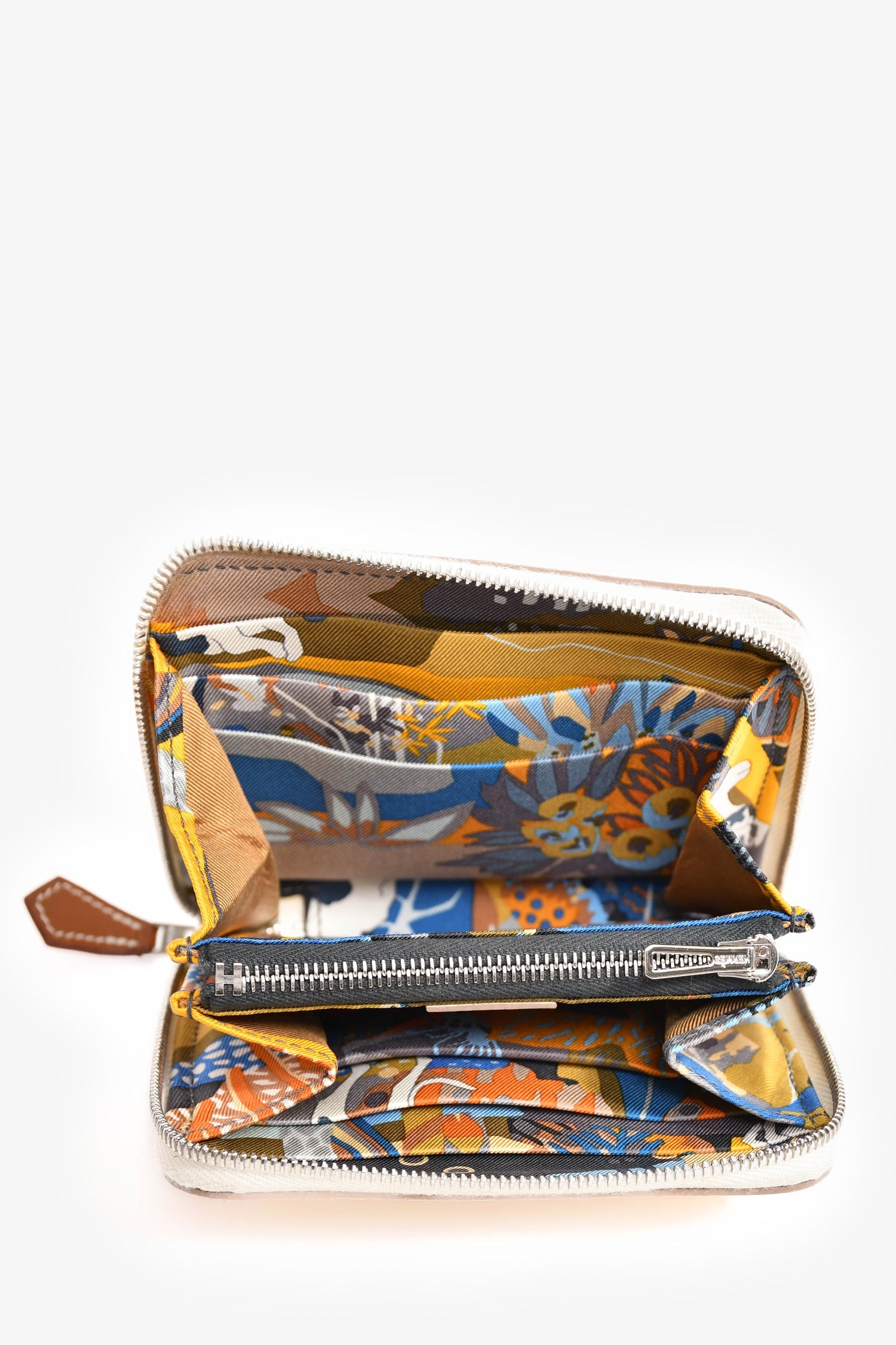 Hermès 2019 White Leather 'Silk In' Compact Wallet. Top zip closure. Textile-lined interior. 6 card slots. 3 main compartments; 2 open, 1 with zip closure. Silver-tone hardware. Tonal stitching.