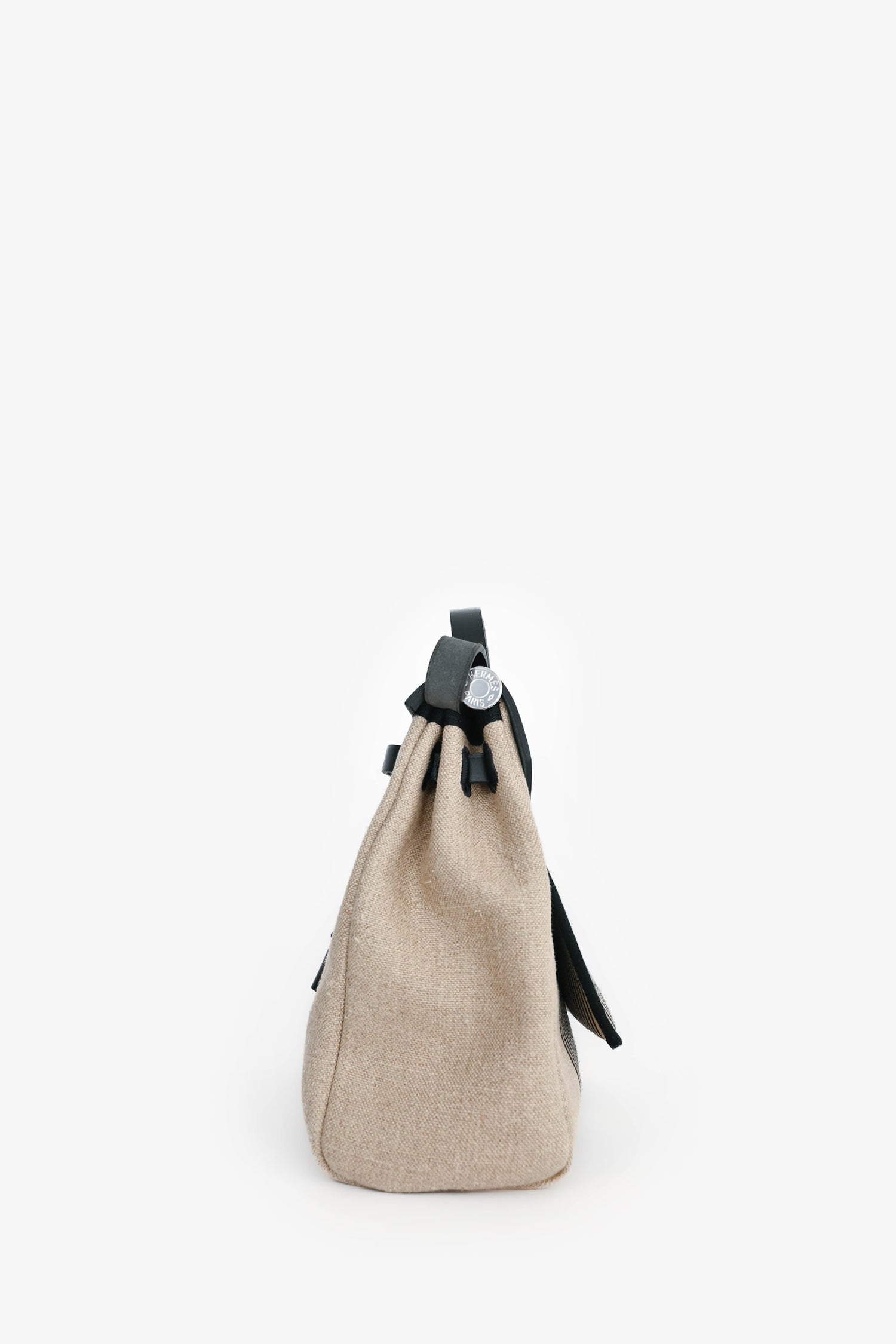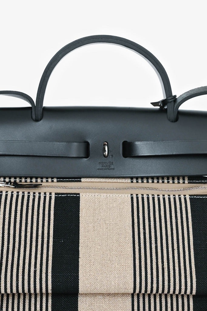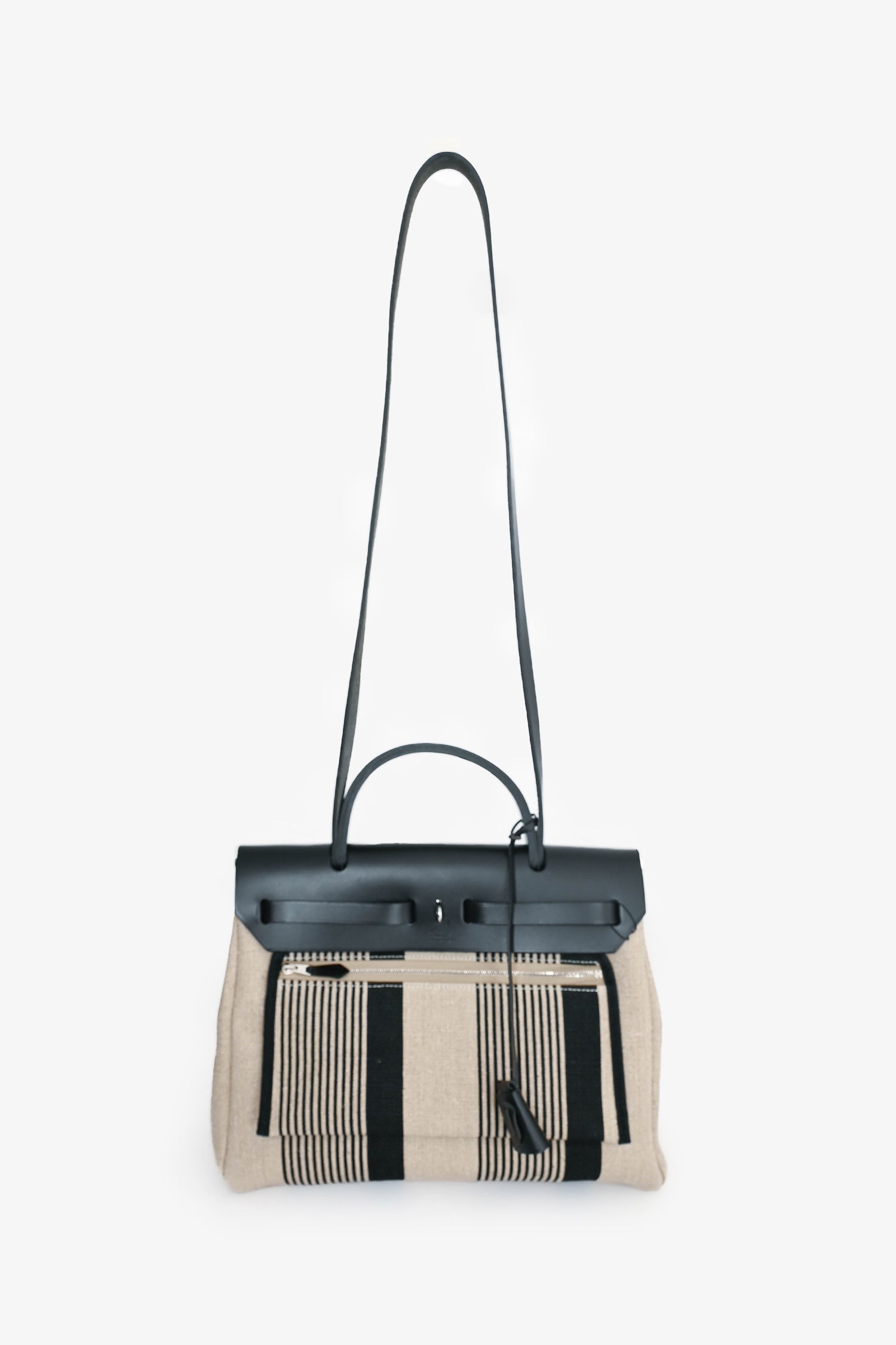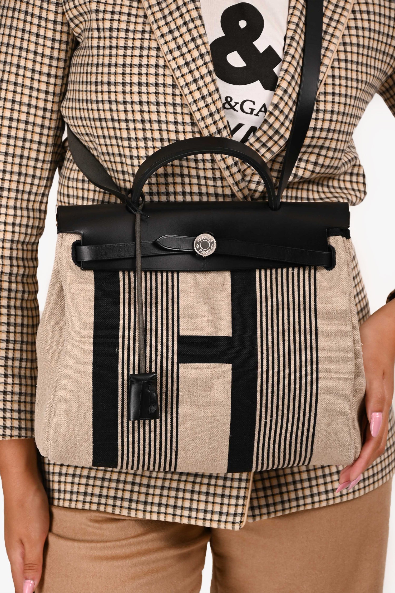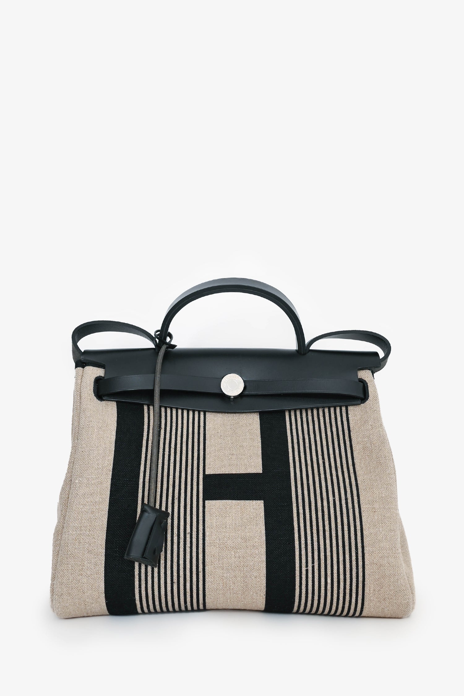 Hermès 2020 Cream/Black Toile H Vibration Herbag Zip 31 with Pouch. Front fold-over flap with strap closures. Top handle. Interior zip pouch. Silver-tone hardware. Exterior rear zip pocket. Detachable clochette.