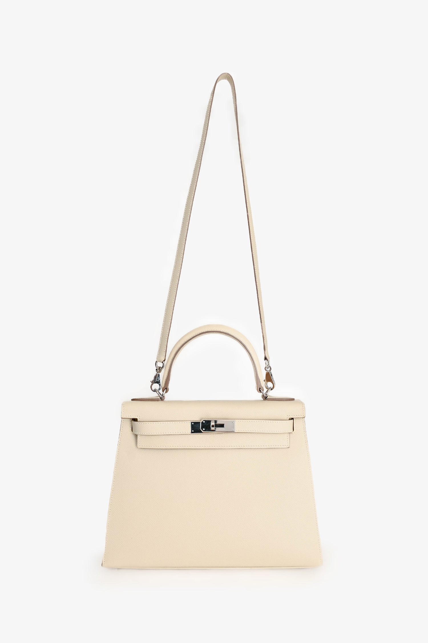Hermès 2021 Chalk White Epsom Leather Kelly Sellier 28. Single top handle with removable and adjustable shoulder strap. Front flap with signature turn-lock closure. Comes with clochette with keys and padlock. Leather-lined interior with zip and slip pockets. Tonal stitching.