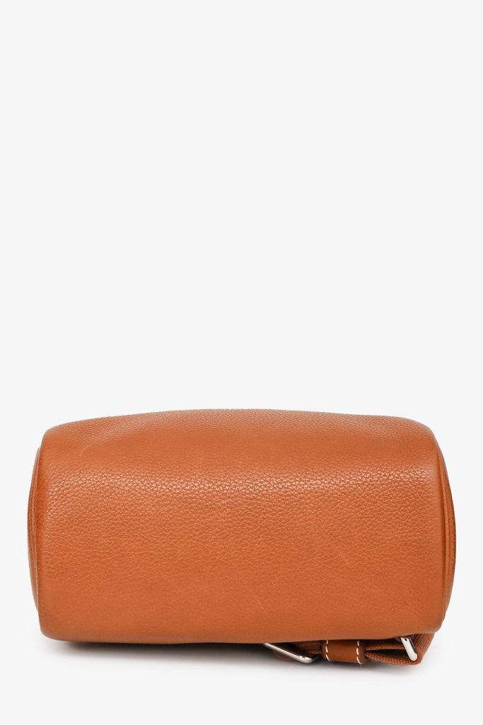 Hermès 2022 Barenia Leather Hac A Dos PM Backpack. Structured silhouette. Adjustable single crossbody strap. Palladium-tone hardware. Interior leather slip pocket. Tonal stitching.