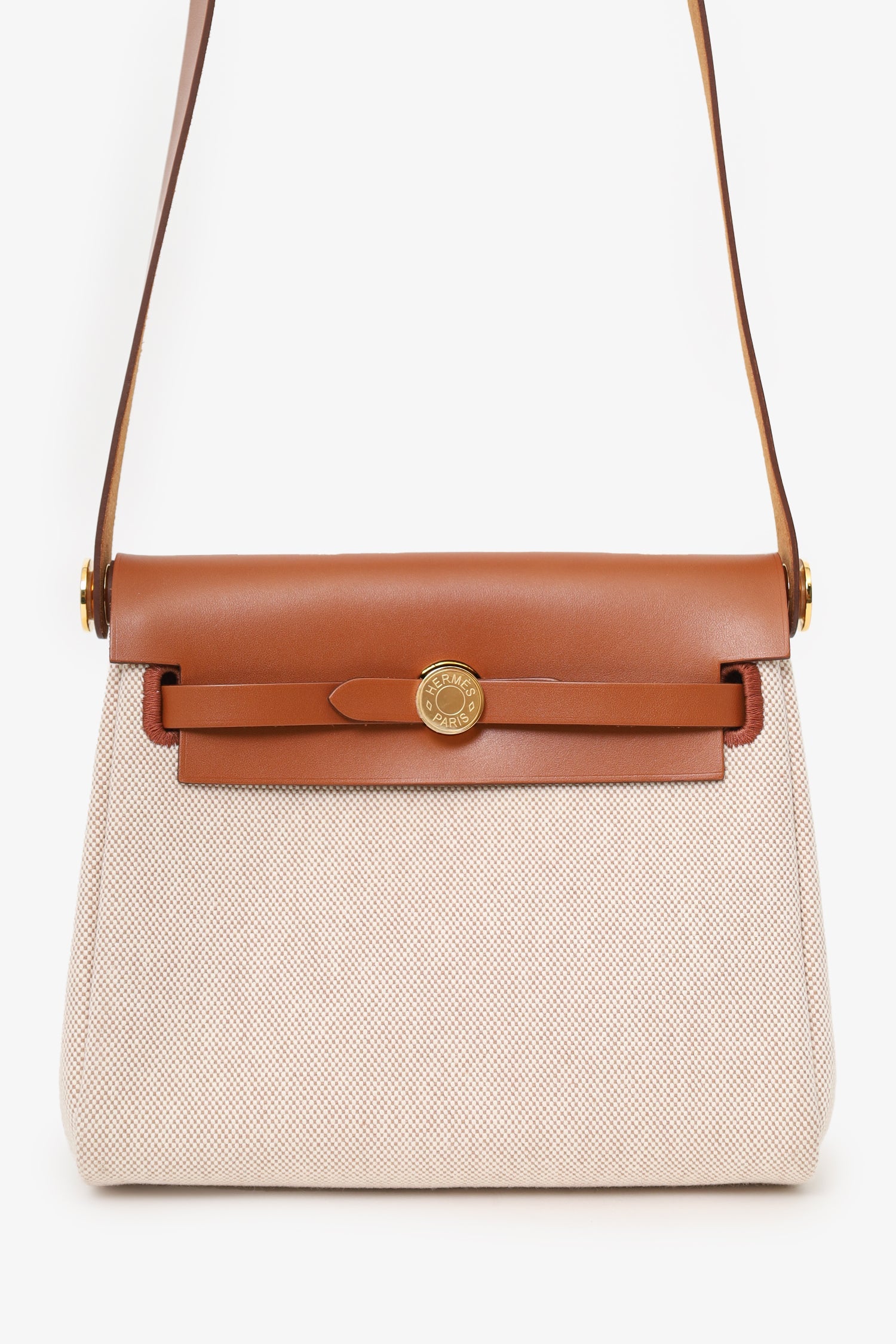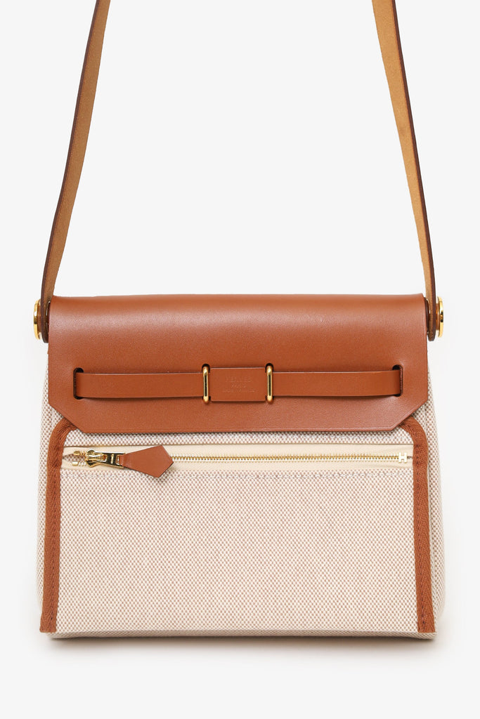 Hermès 2025 Ecru/Beige Toile H Canvas/Fauve Vache Hunter Mini Herbag 20. Front fold over flap with 2 pull-through straps. Single exterior rear zip compartment. Leather crossbody strap. Open interior. Tonal stitching. Gold-tone hardware.