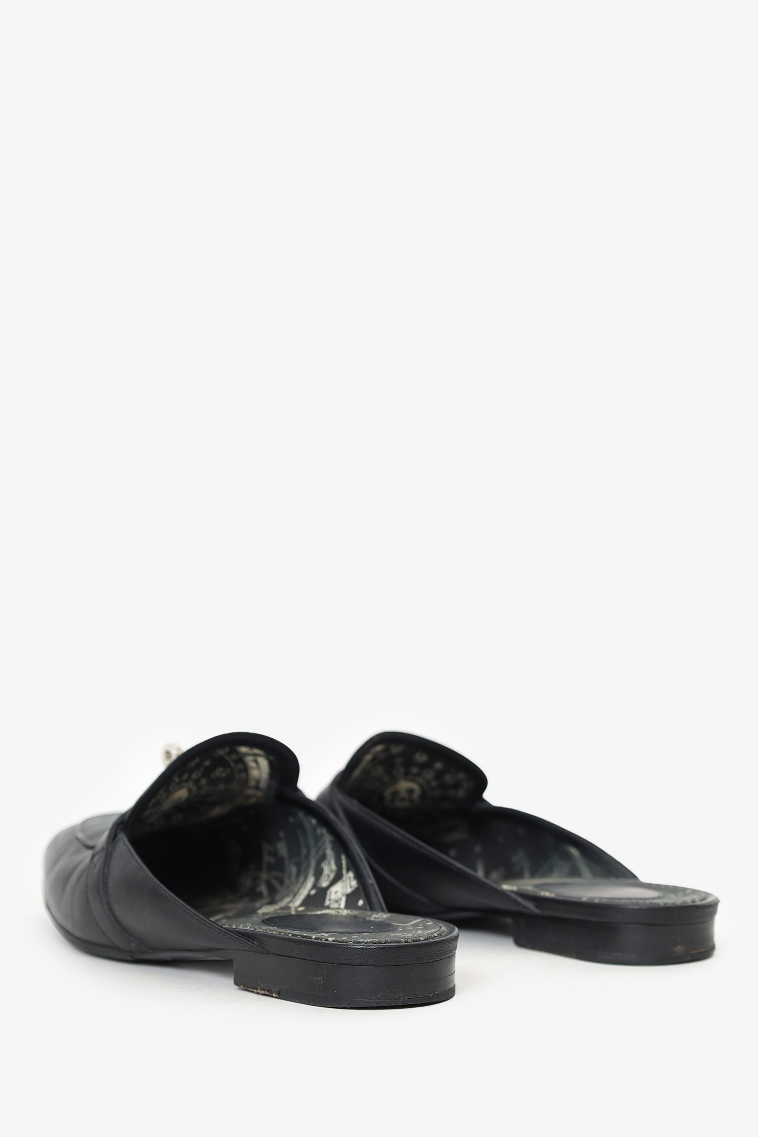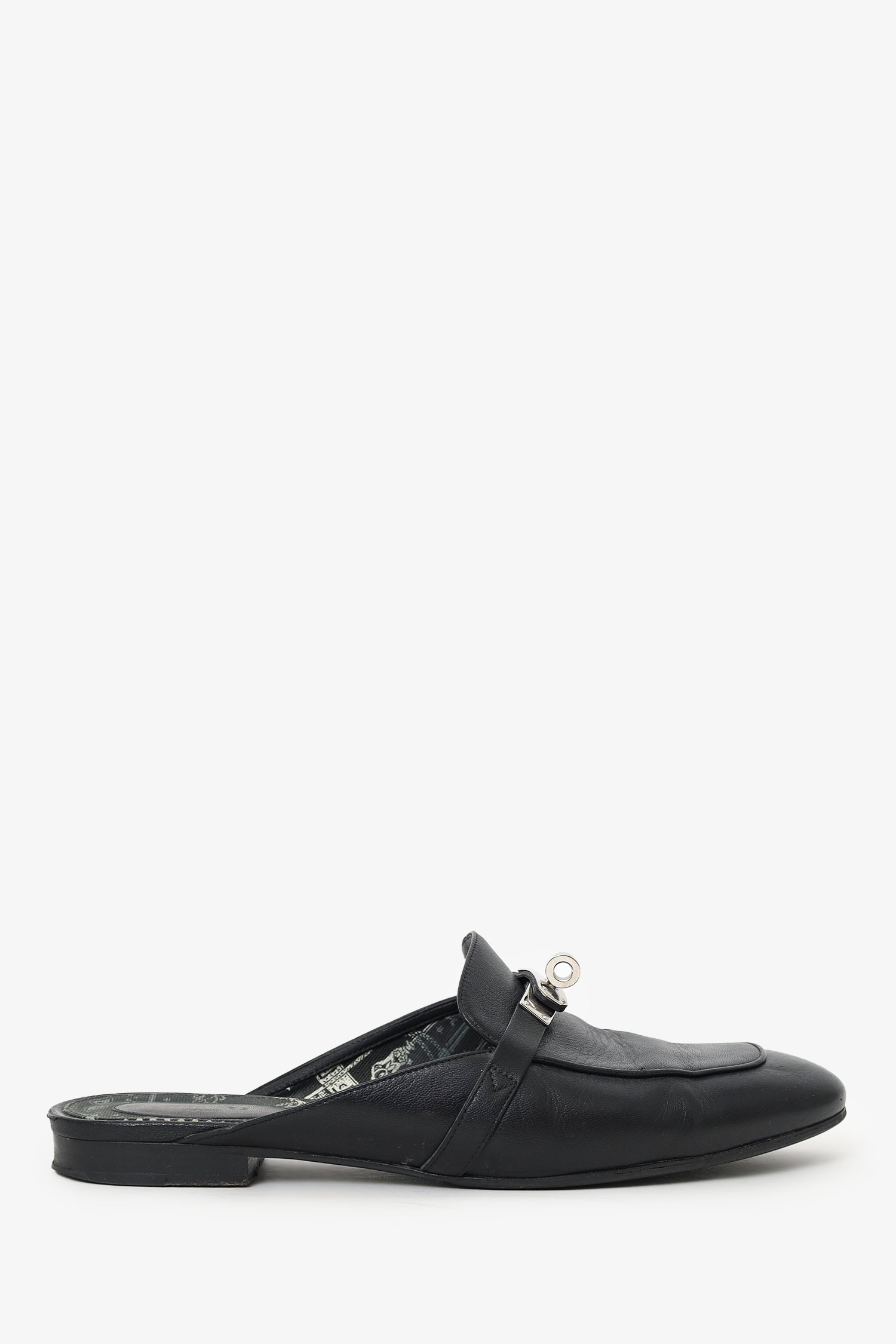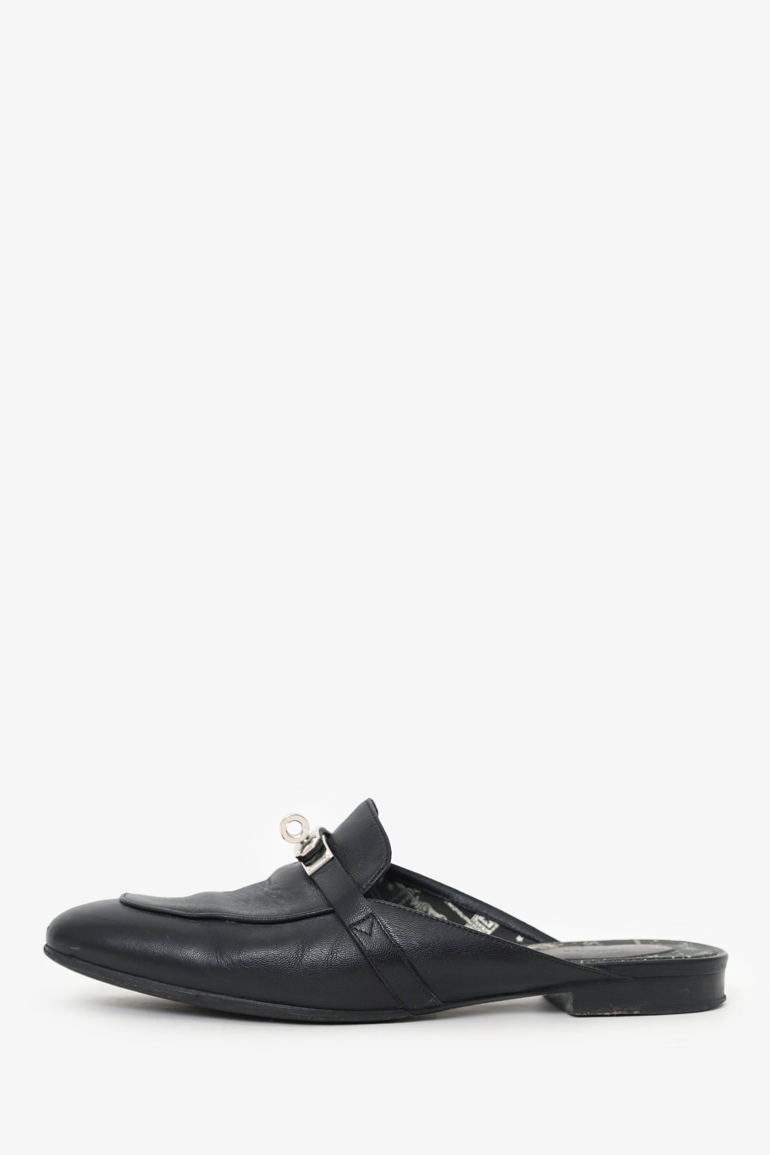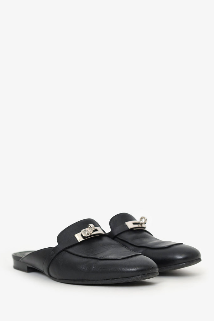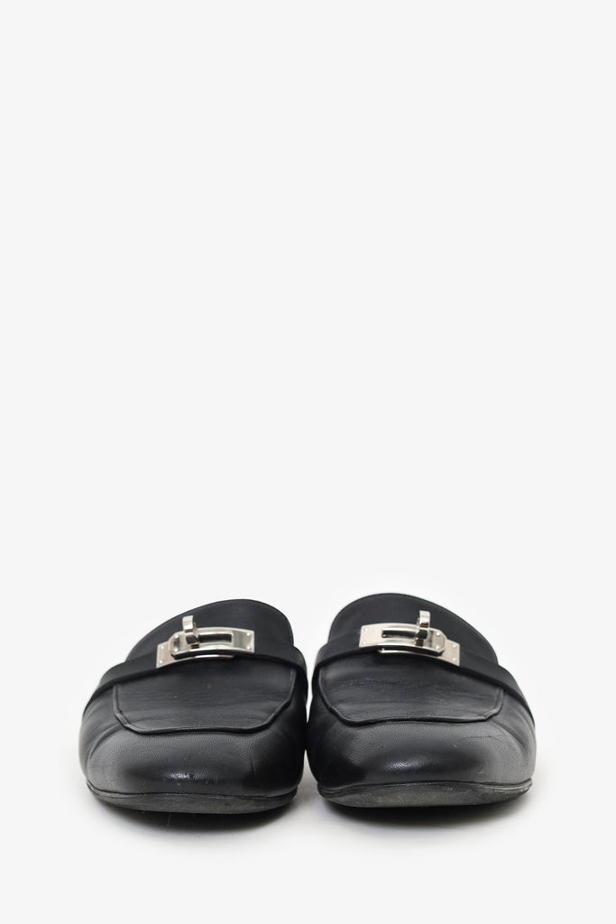 Hermès Black Leather OZ Kelly Mules. Slip-on. Pointed-round toe. Silver-tone hardware. Tonal stitching.