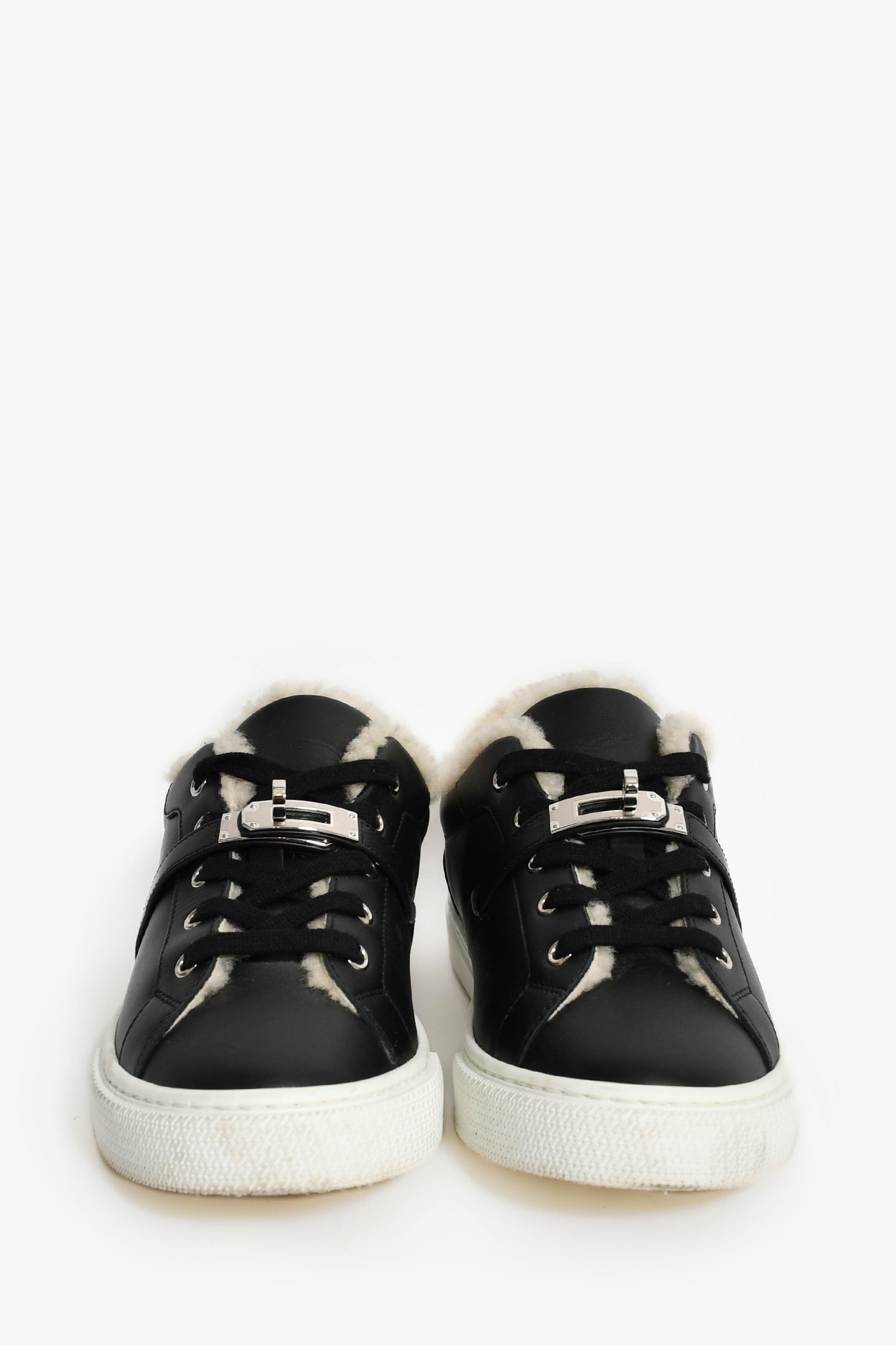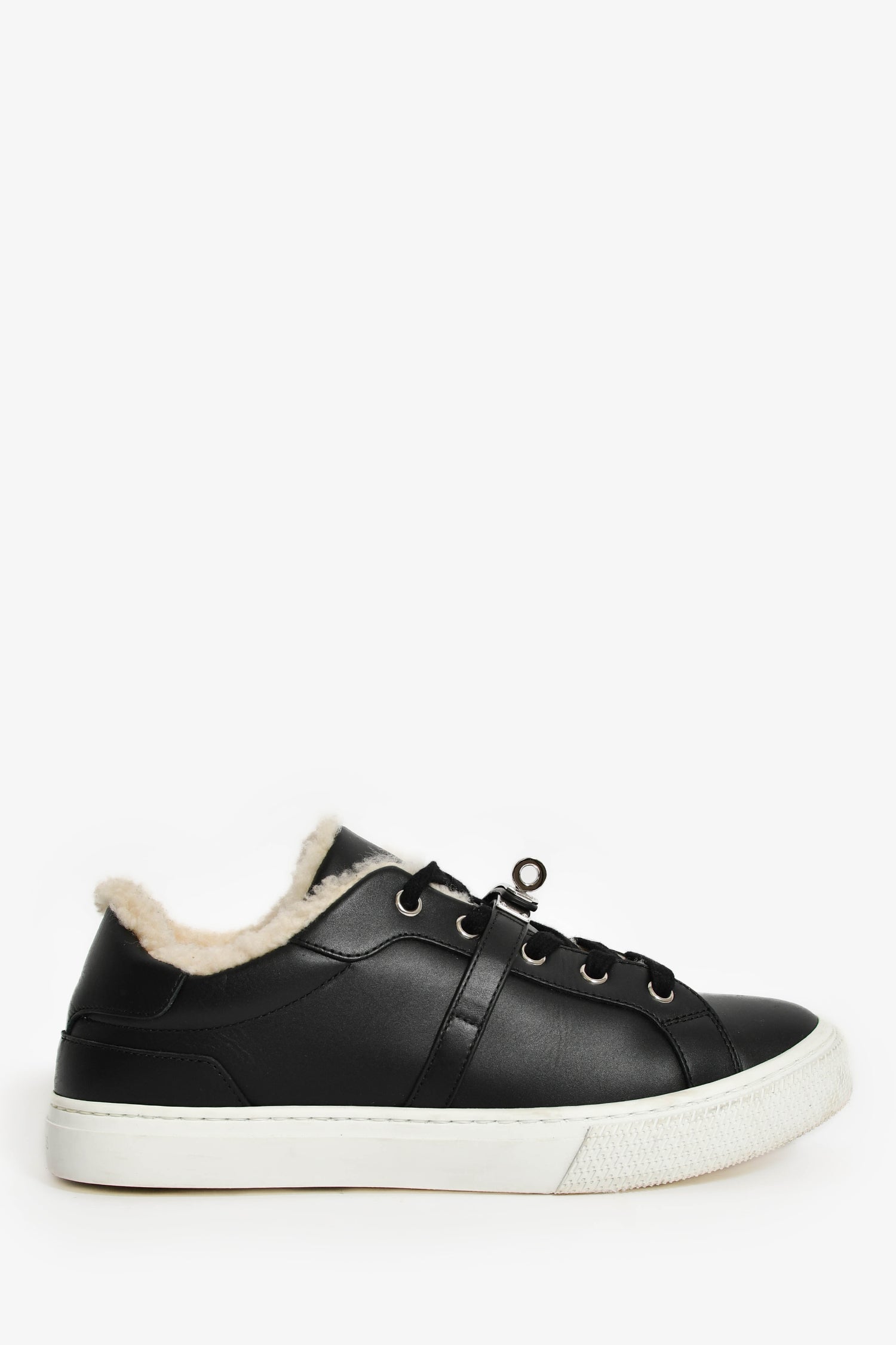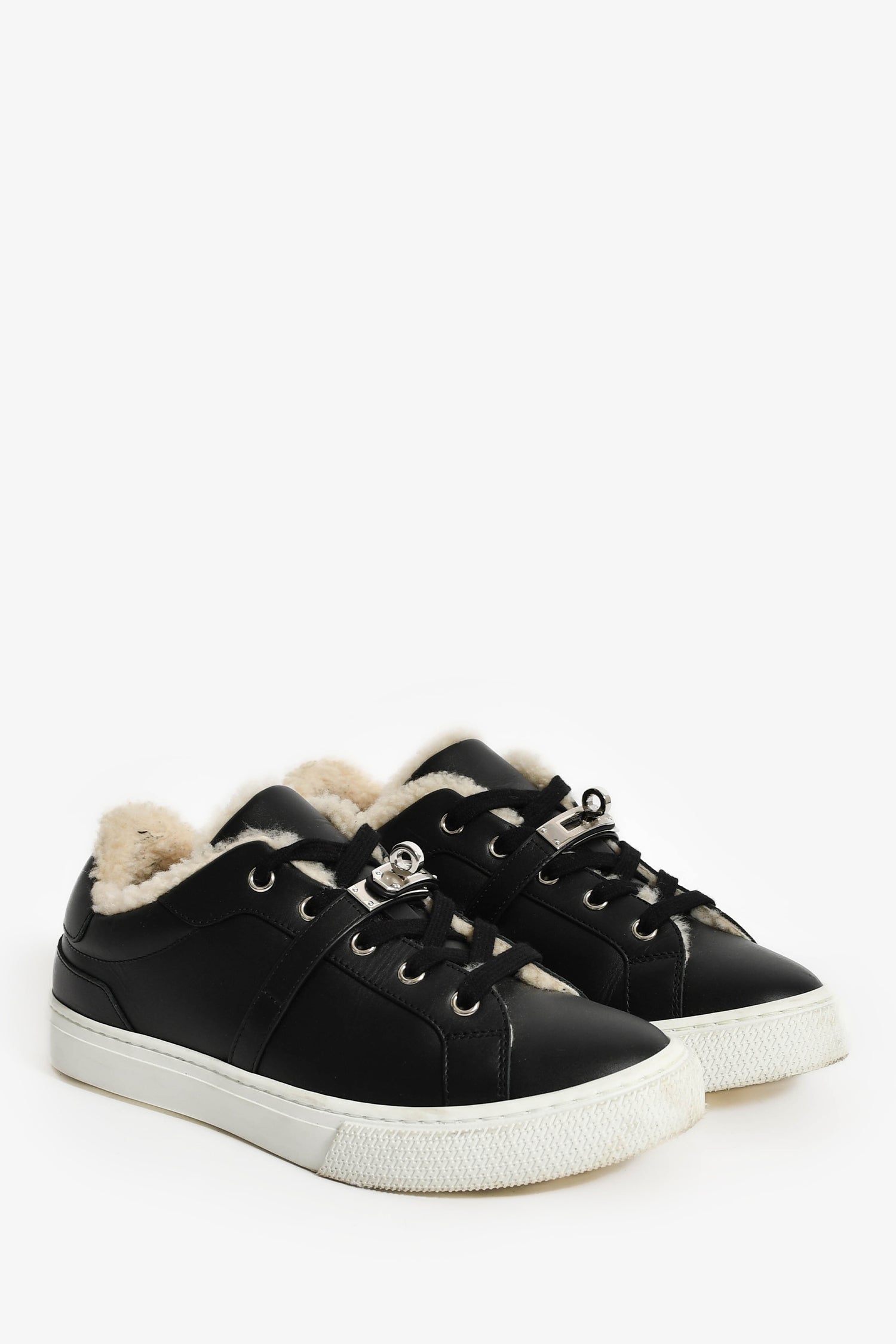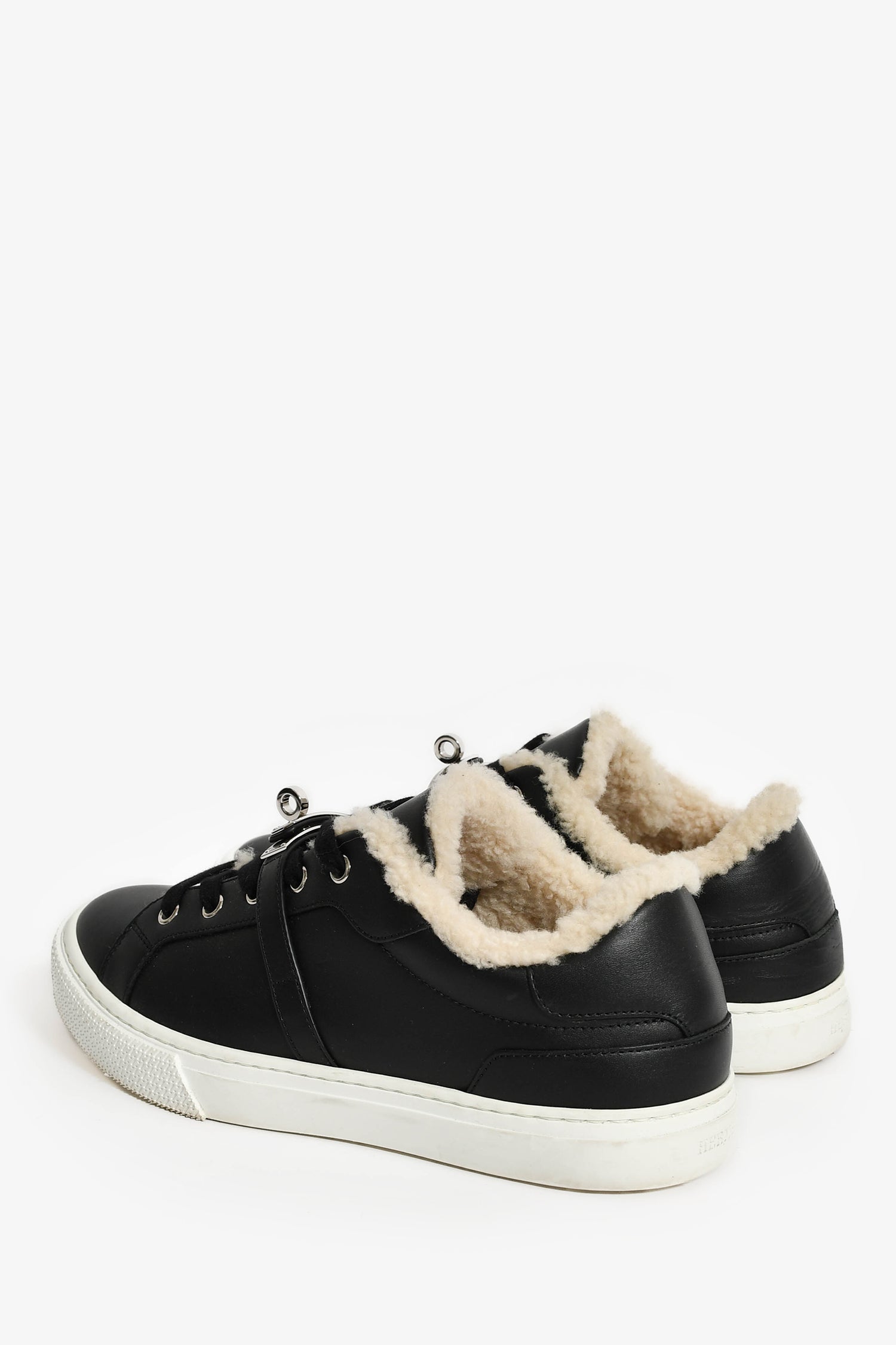 Hermes Black Leather/Shearling Kelly Buckle 'Day' Sneakers. Round toe. Front lace-up closure. Silver-tone hardware. Tonal stitching.