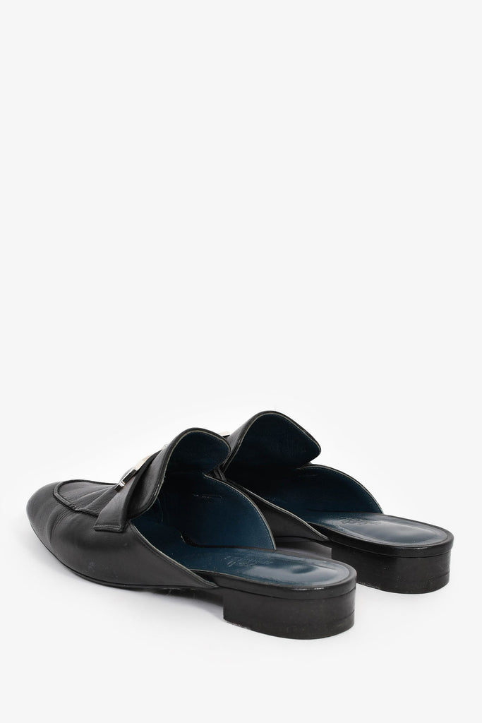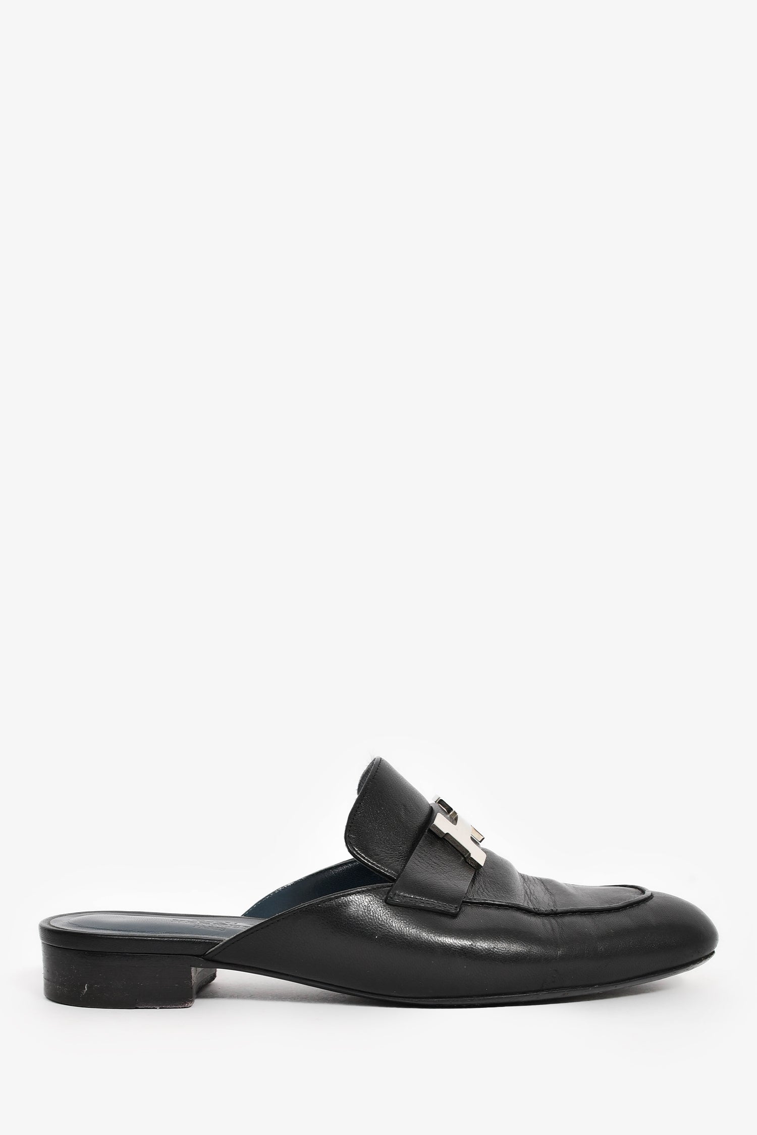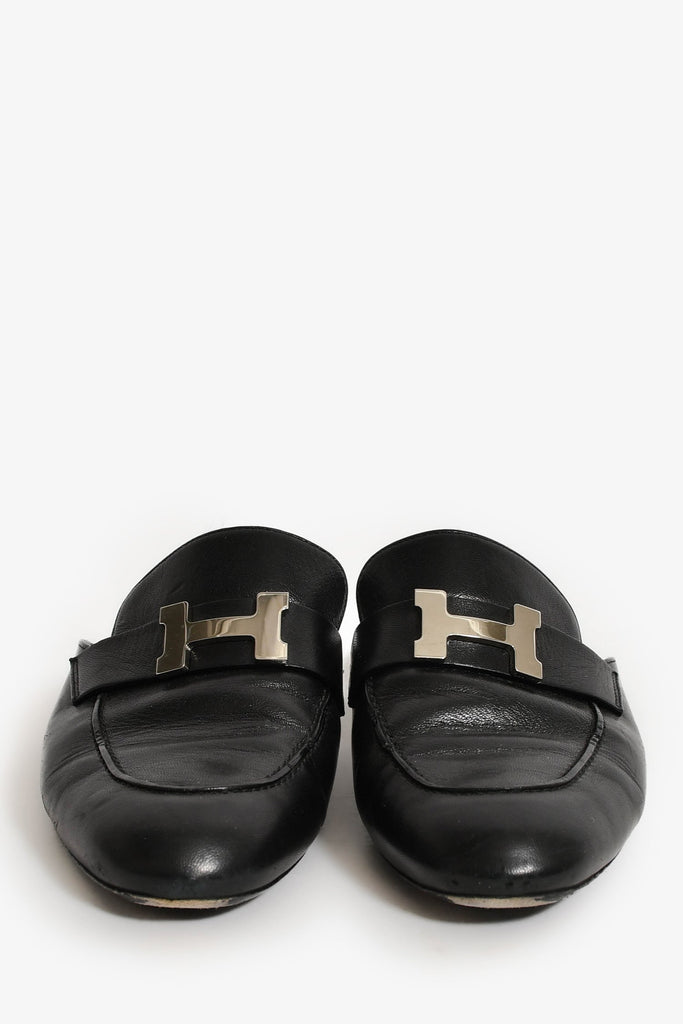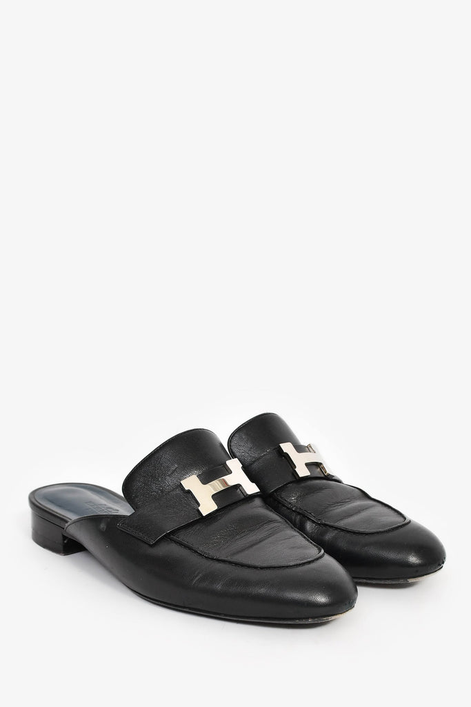 Hermès Black Leather Trocadero H Logo Mules. Almond toe. Slip-on. Palladium-tone hardware. Tonal stitching.