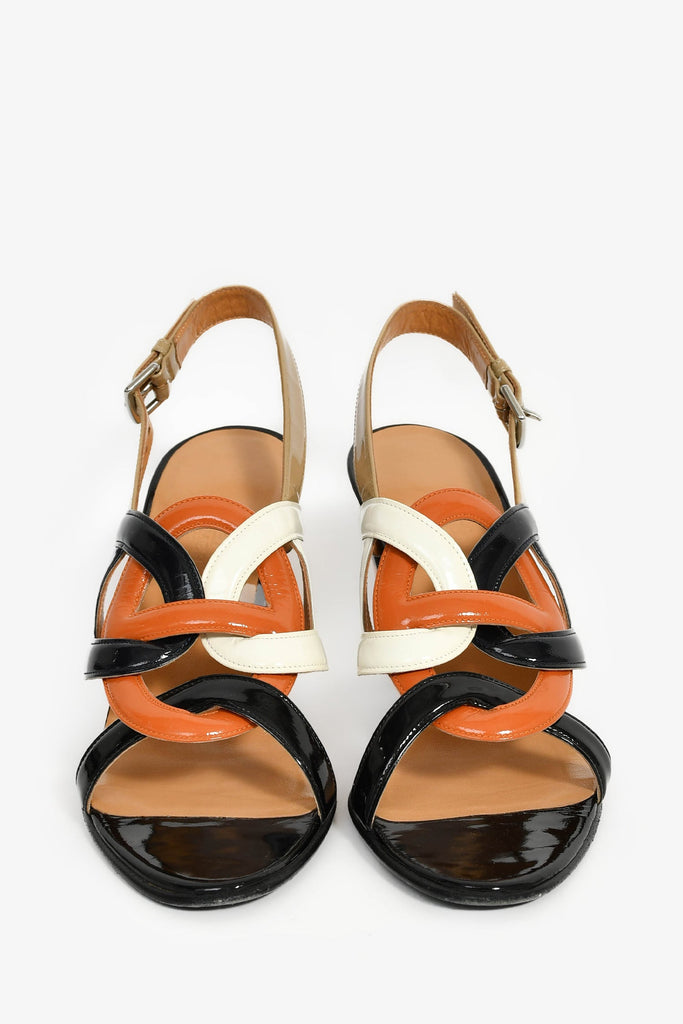 Hermes Black/Orange Patent 'Chain d'Ancre' Heeled Sandals. Slip-on. Open-round toe. Slingback with adjustable buckle closure. Silver-tone hardware. Tonal stitching.