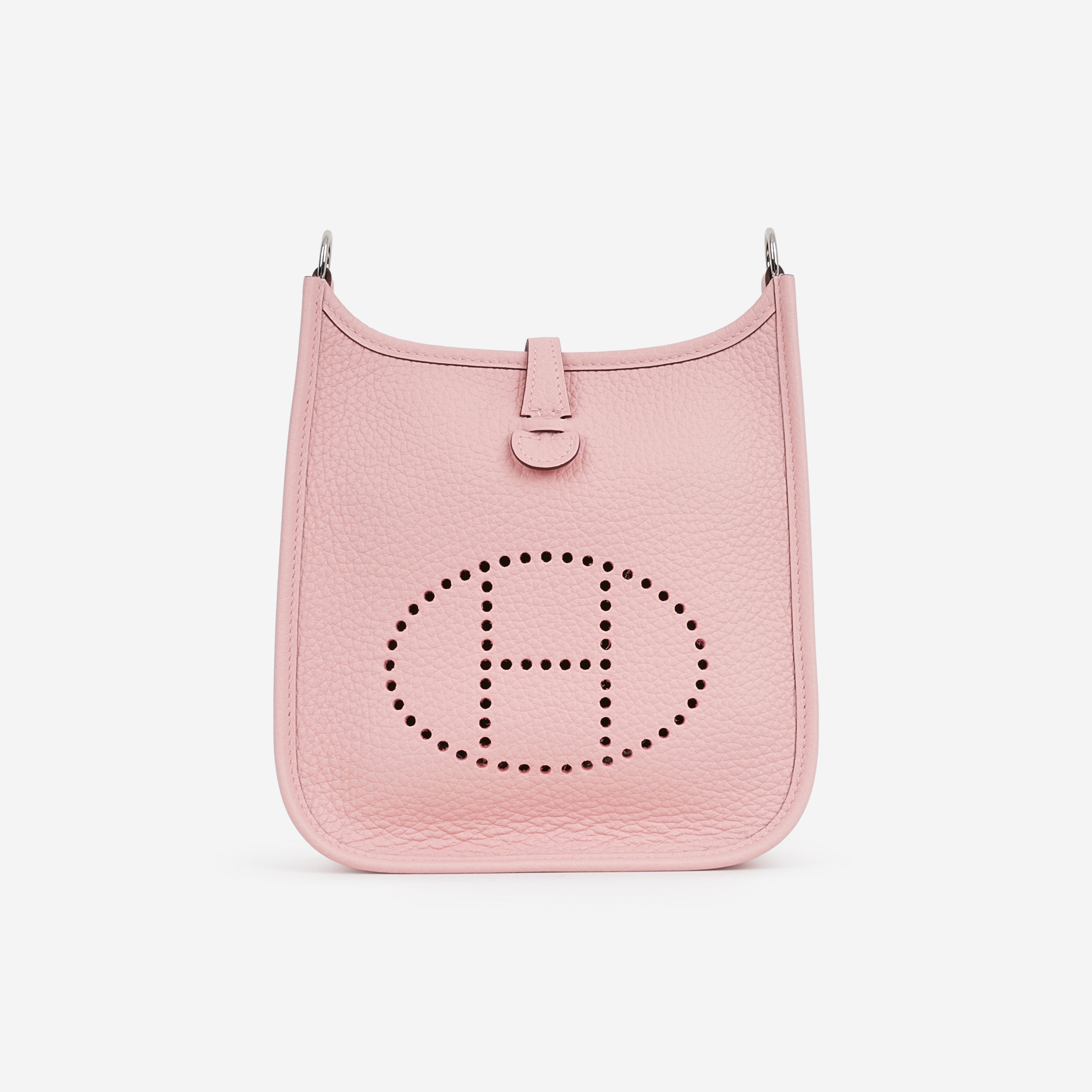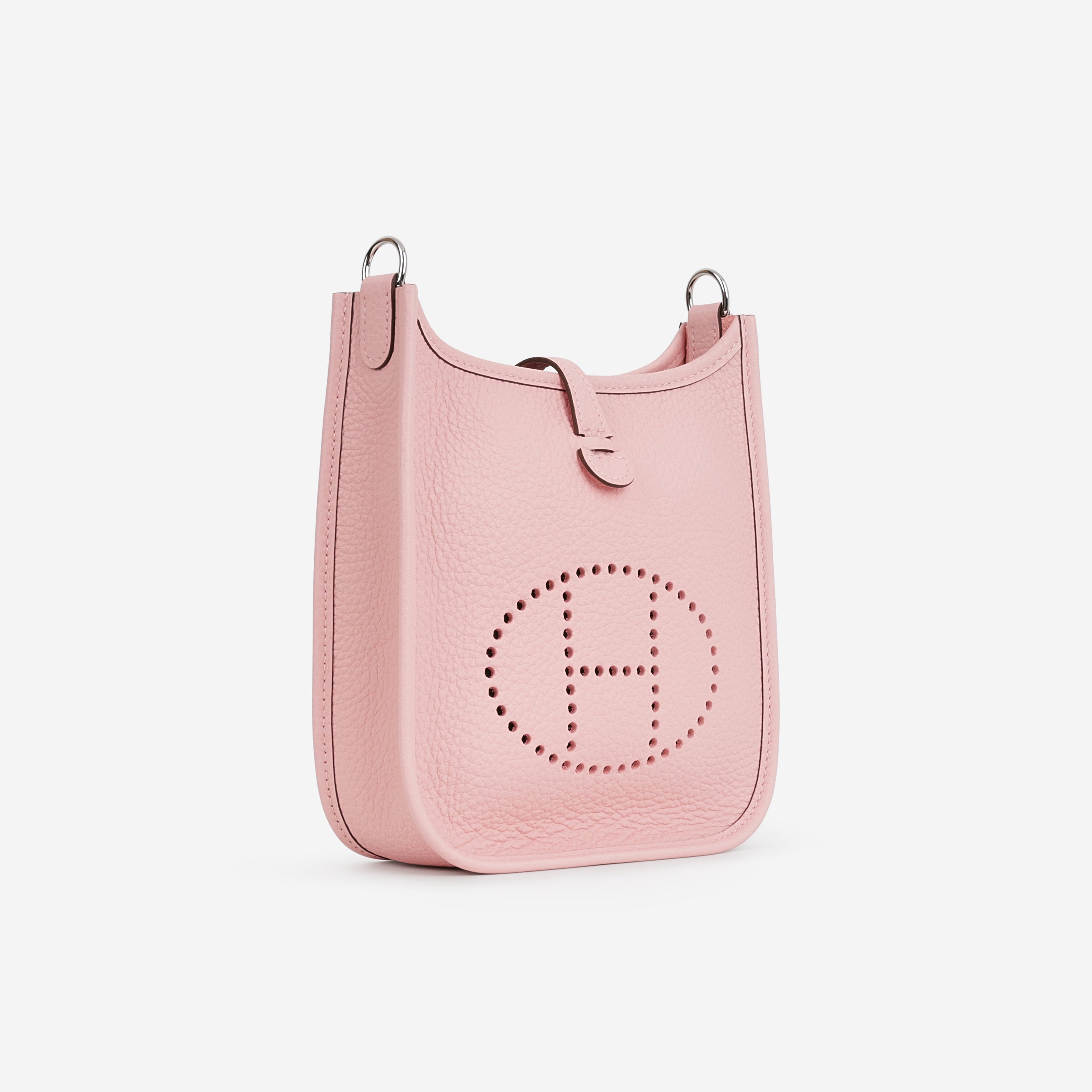 The Hermès Mini Evelyne 16 in Rose Sakura Clemence leather with palladium hardware, featuring a K stamp (2025 production). A compact crossbody design with the signature perforated “H” logo, snap closure and canvas strap.
