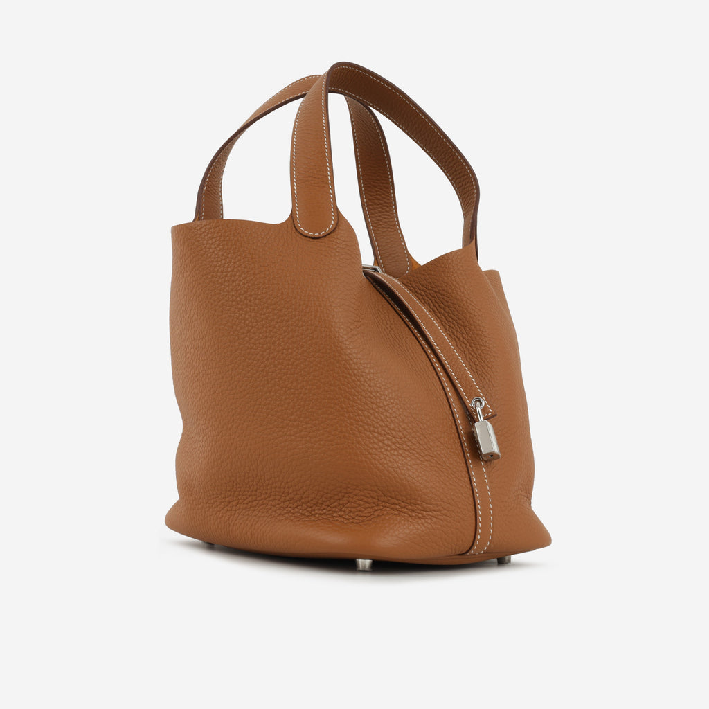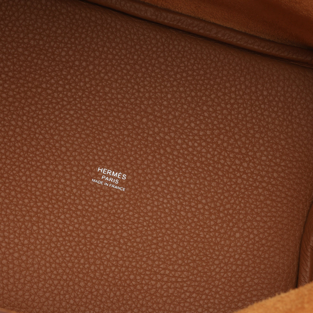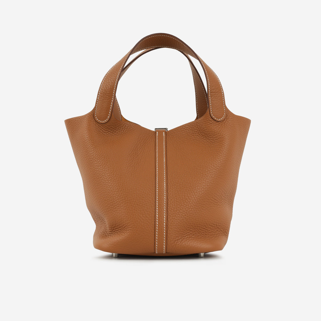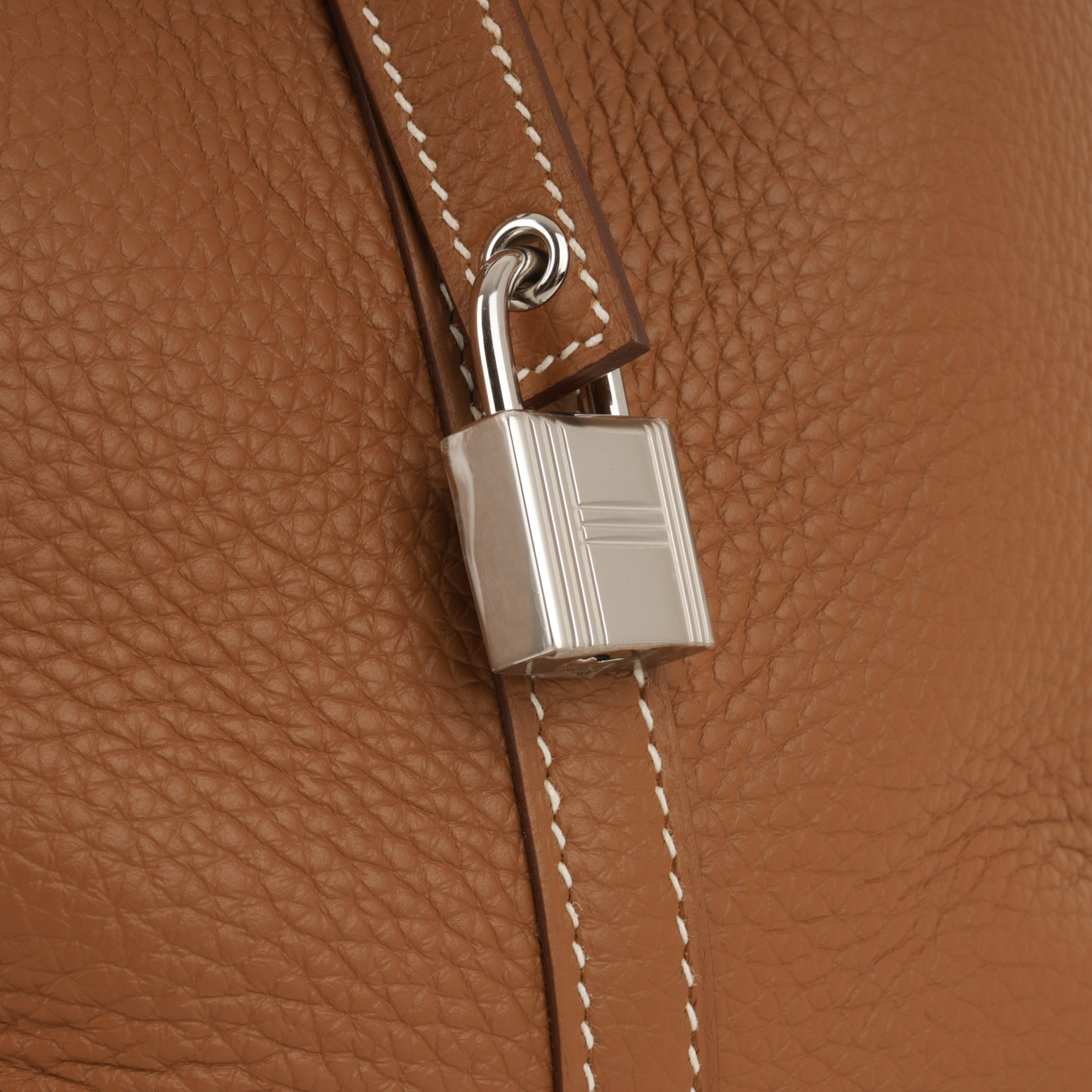 Crafted from supple Taurillon Clemence leather, this Picotin 22 showcases the classic Gold shade. A warm caramel-brown tone that pairs effortlessly with both casual and formal outfits. The bag is accented with cool Palladium plated hardware, creating a striking contrast that highlights its refined design.