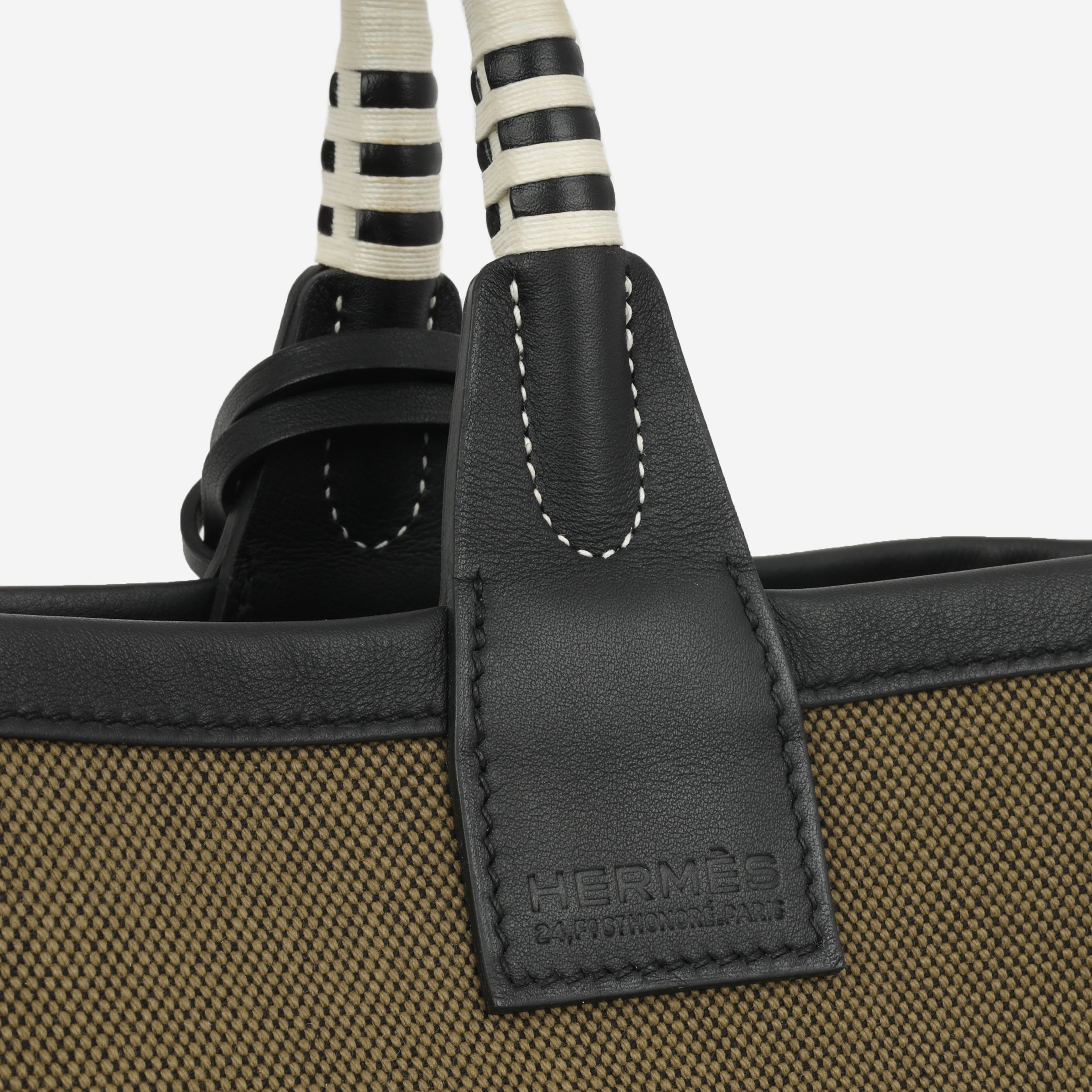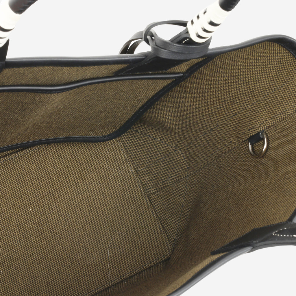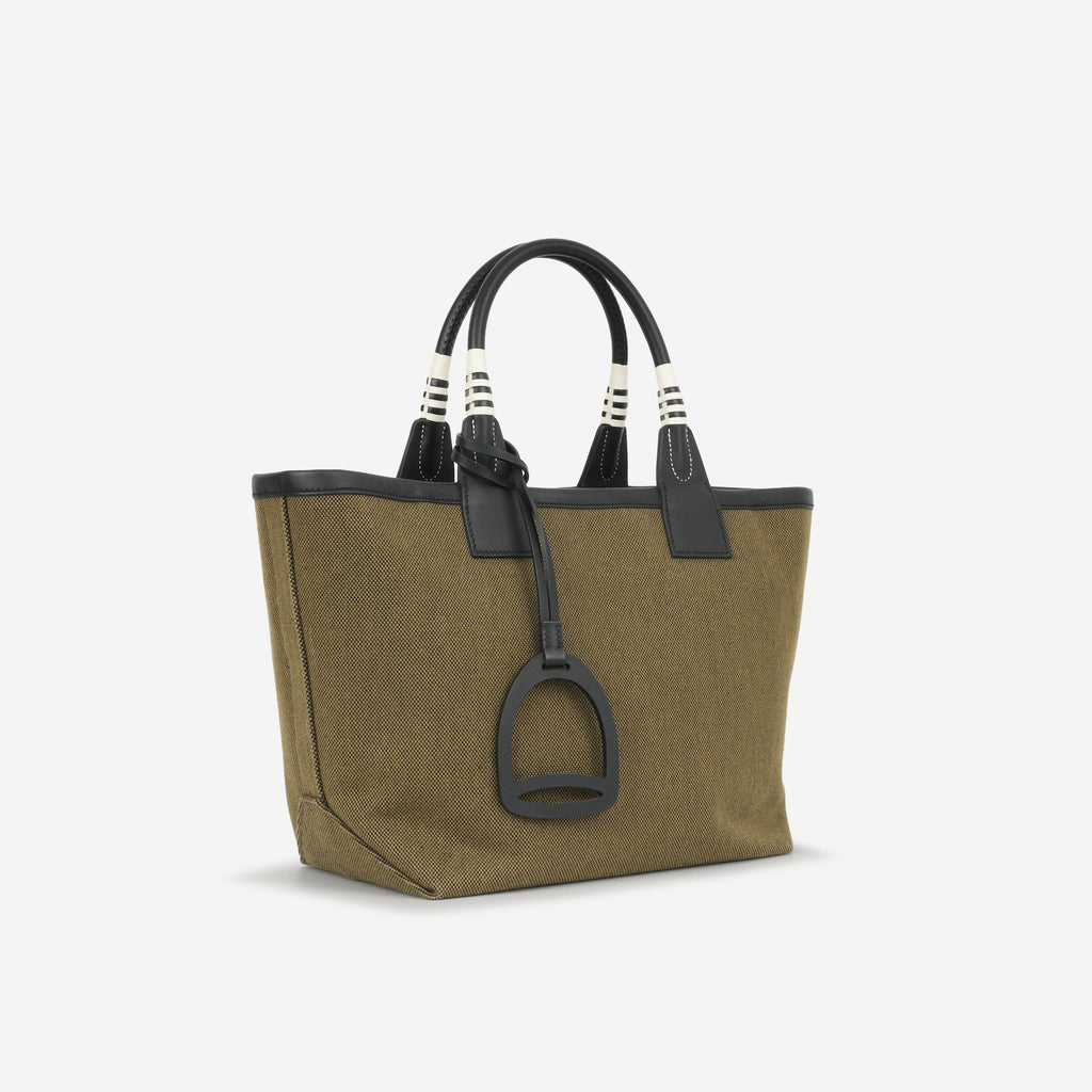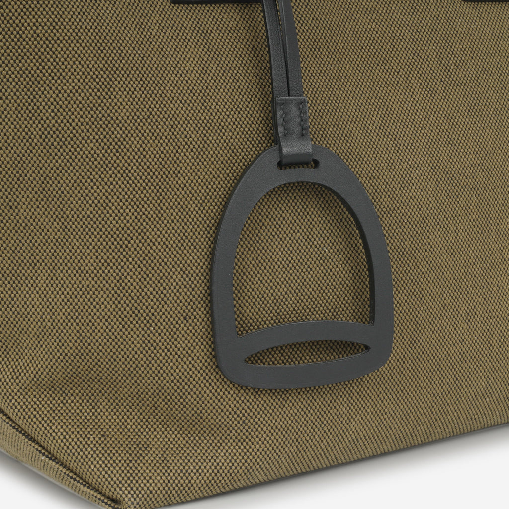 The Steeple tote bag, inspired by the equestrian roots of Hermès, mixes military canvas and soft leather. Featuring stirrup-shaped bag charm and sturdy handles, this bag can be carried by hand or on the arm.