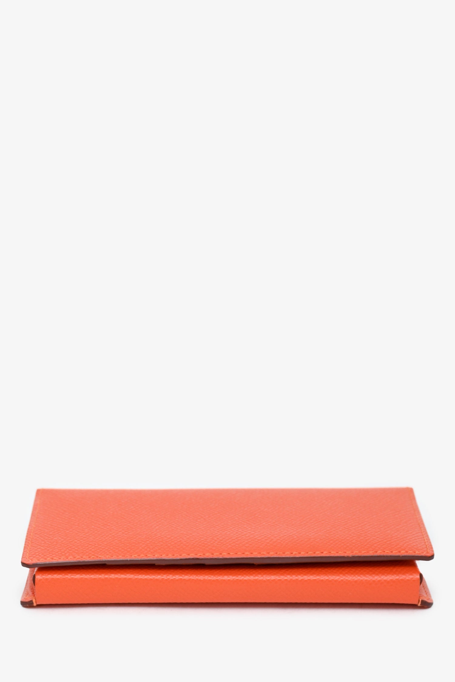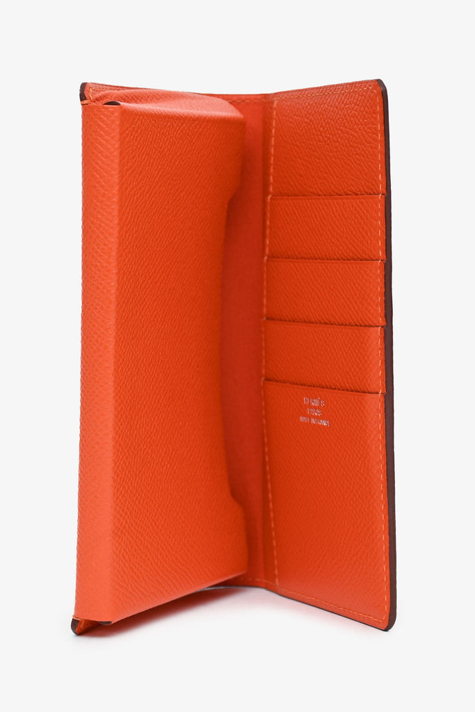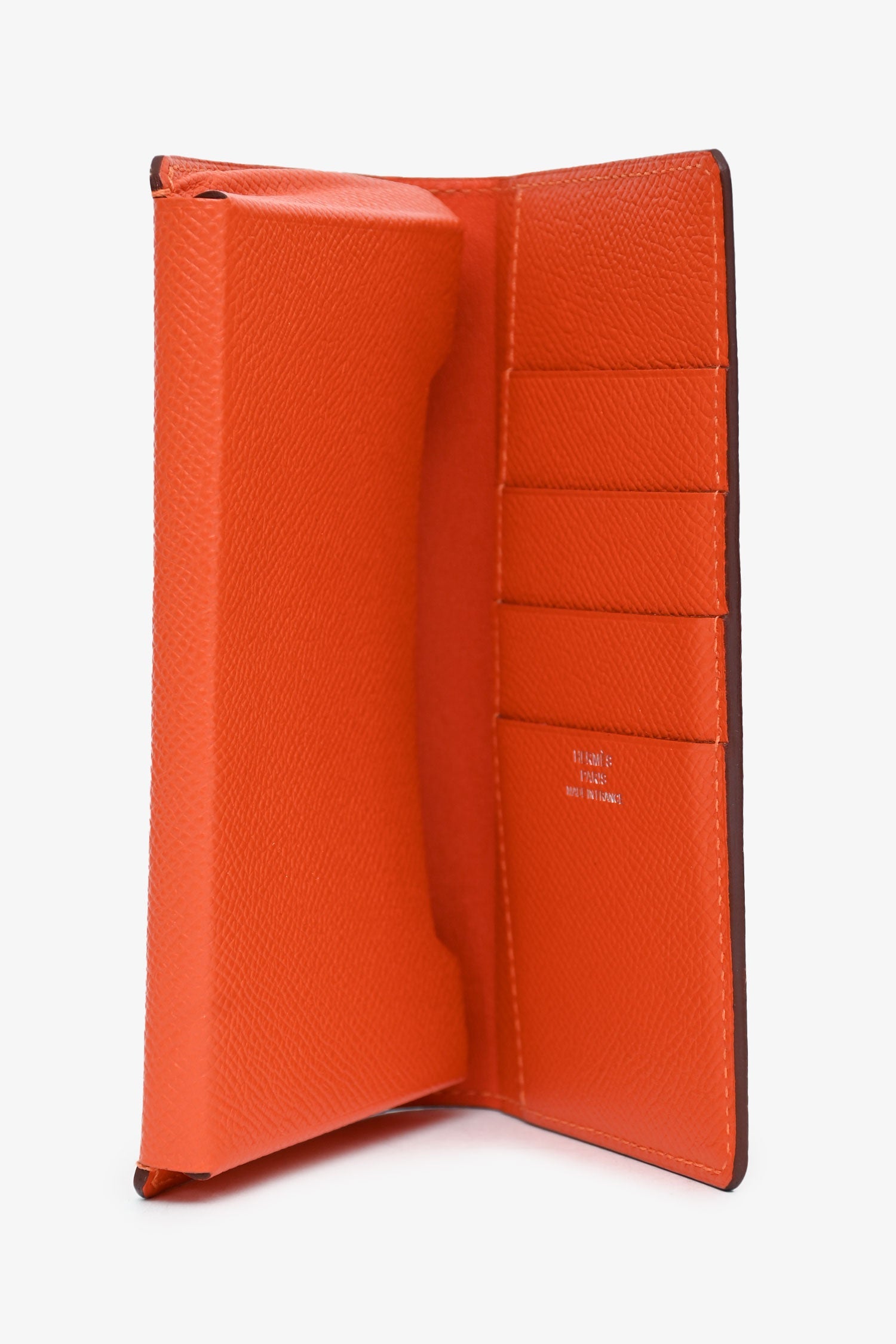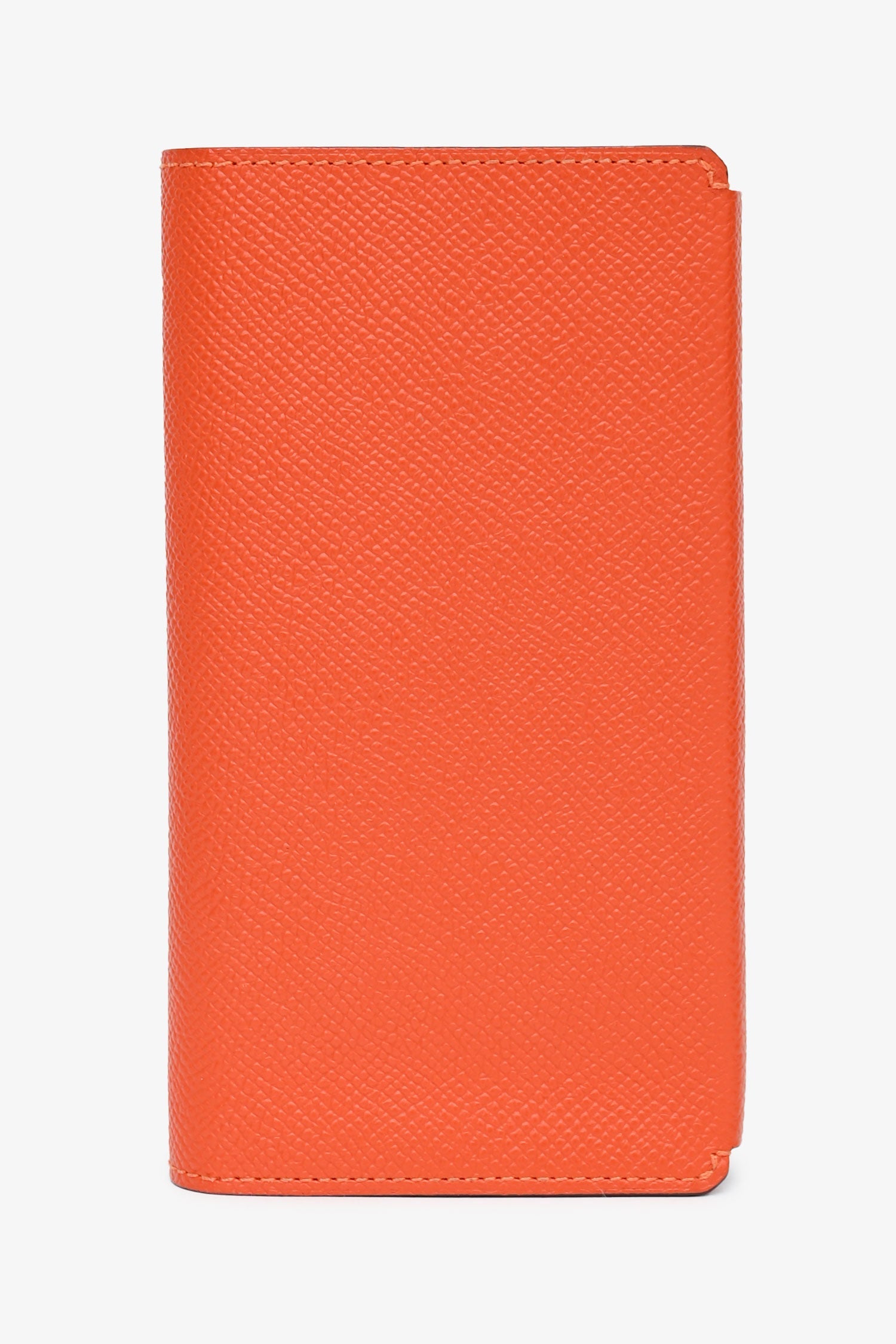 Hermès Orange Epsom Leather Long Bi-Fold Wallet. Four card slots. Two billfold compartments. One open compartment with divider. Tonal stitching.