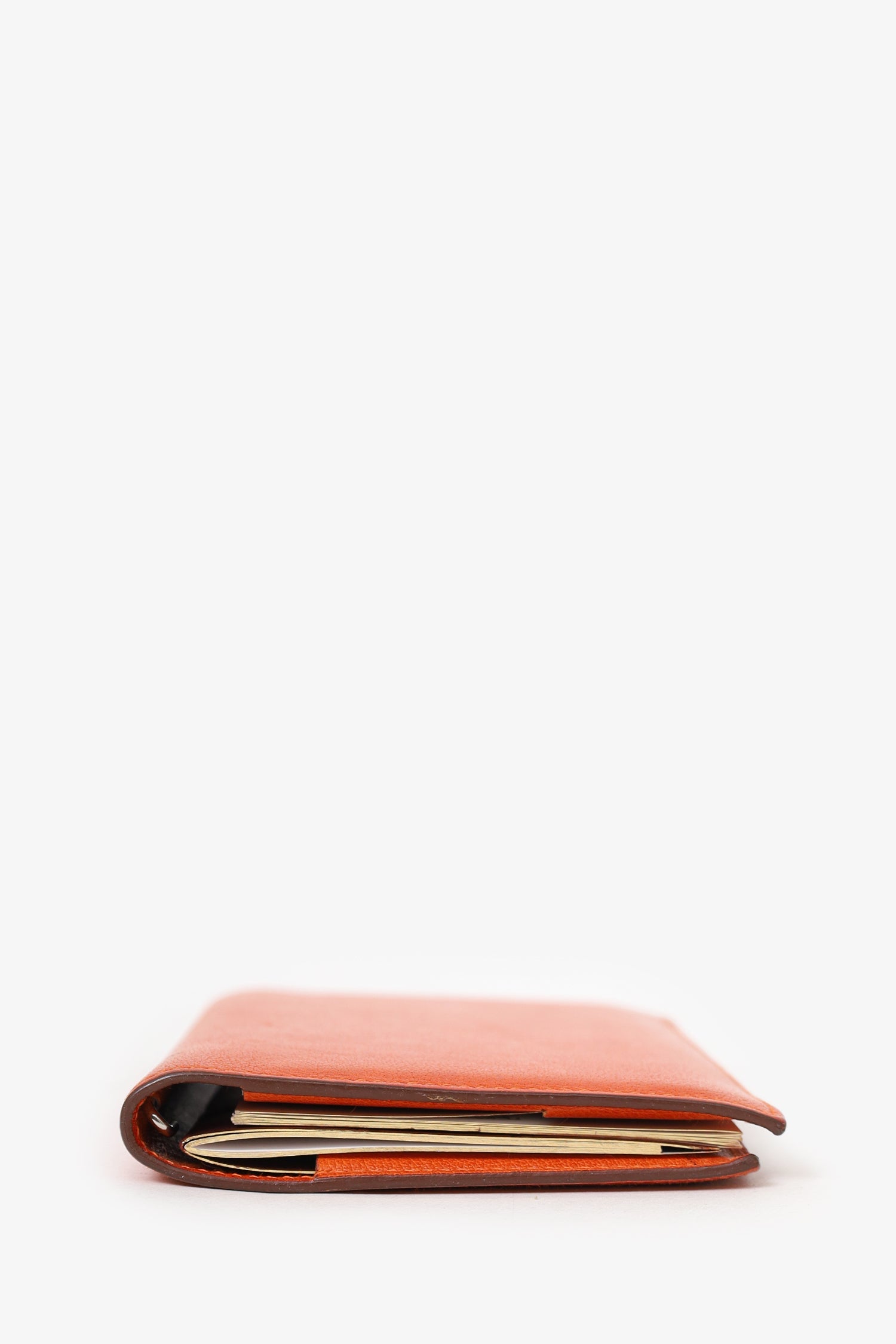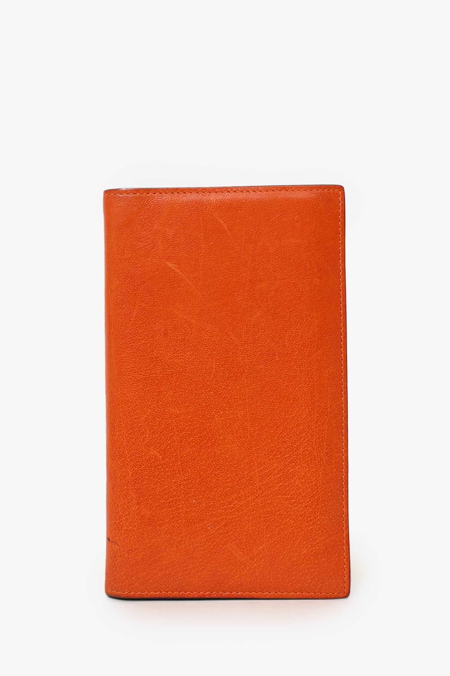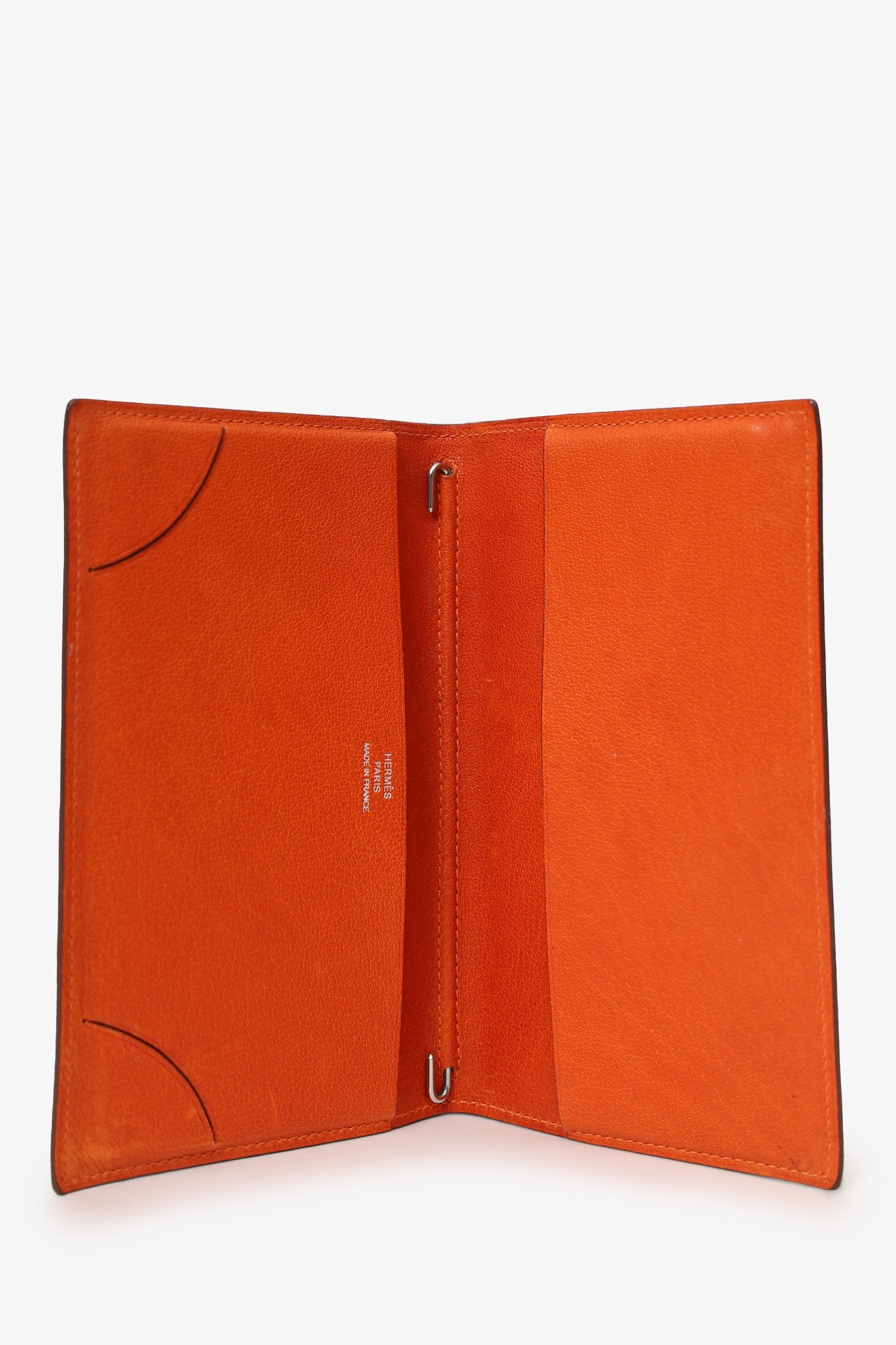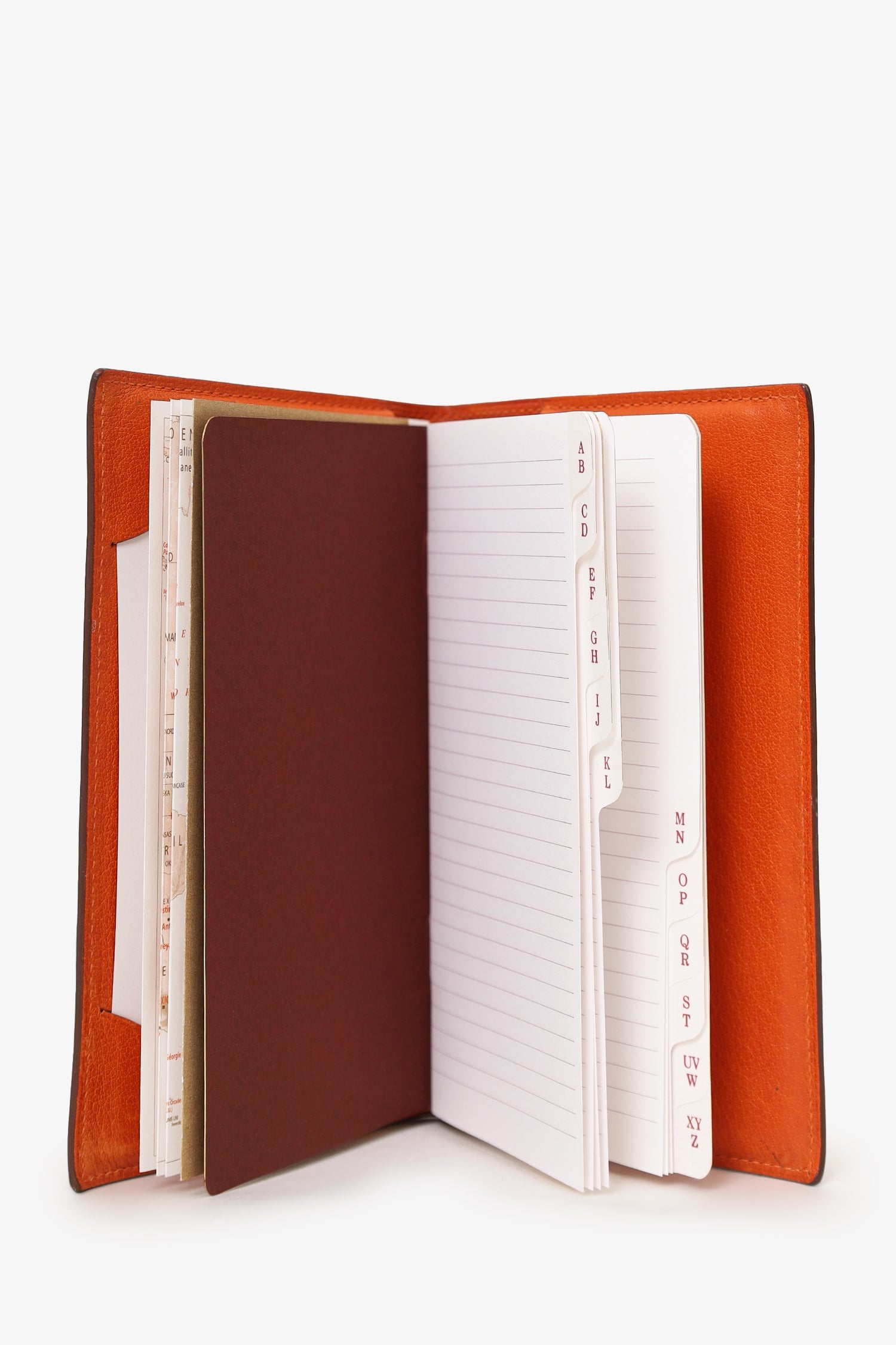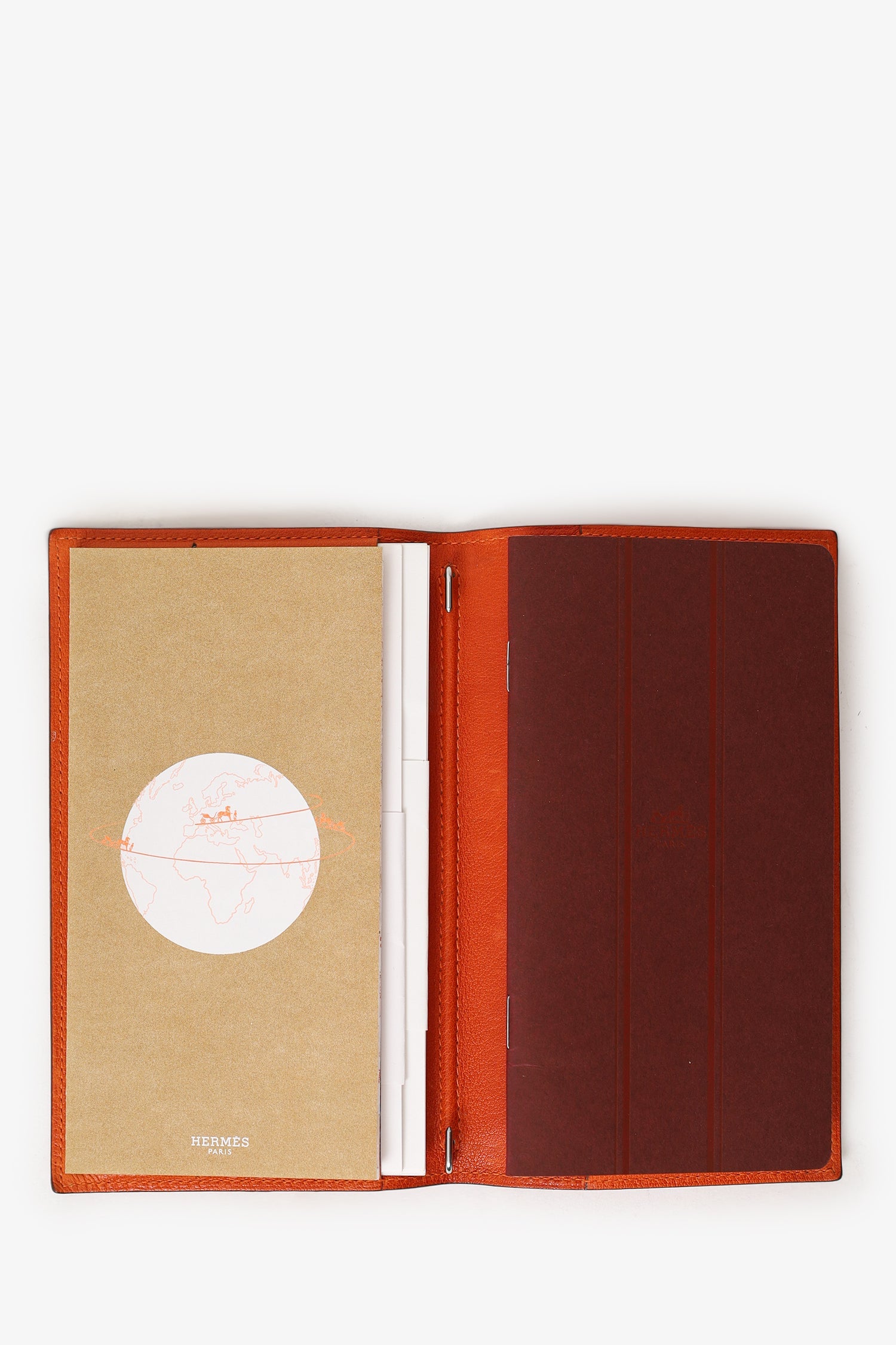 Hermes Orange Leather Agenda Cover/Phone Book. Bi-fold. Includes blank agenda, worl map and papers. Silver-tone hardware. Tonal stitching.