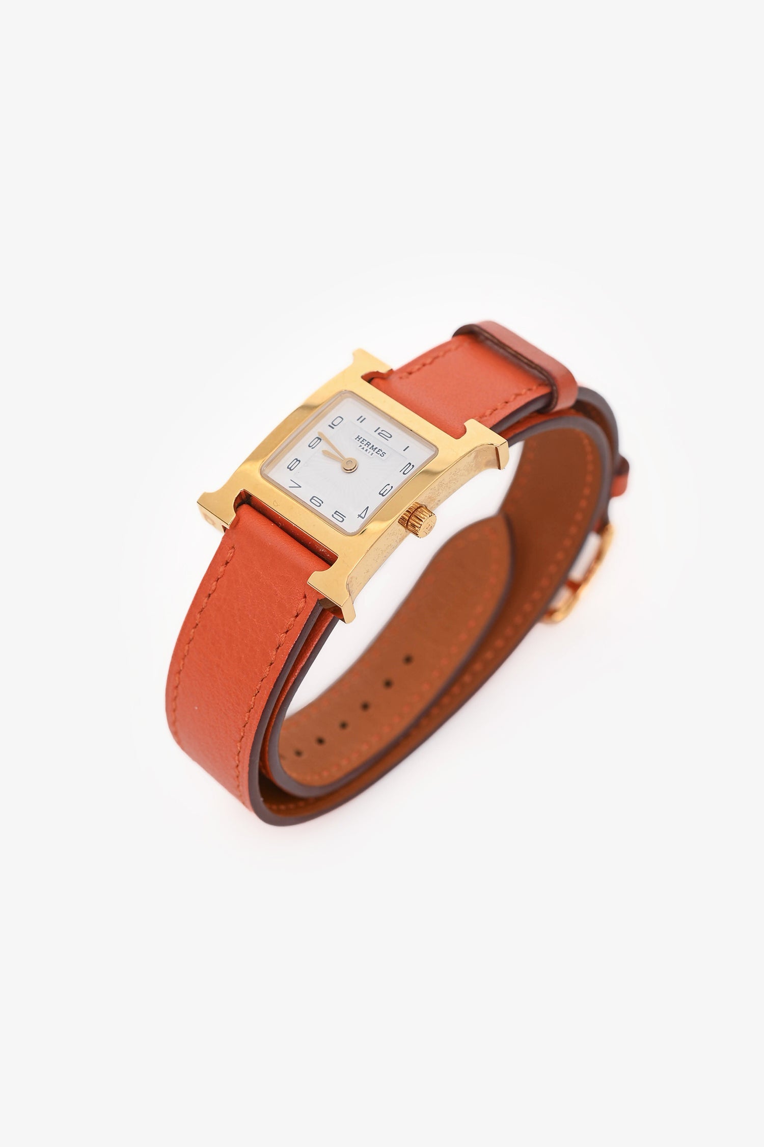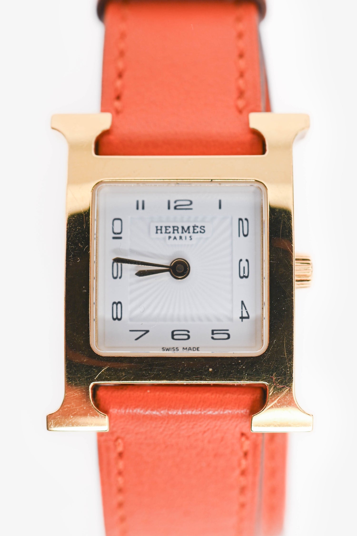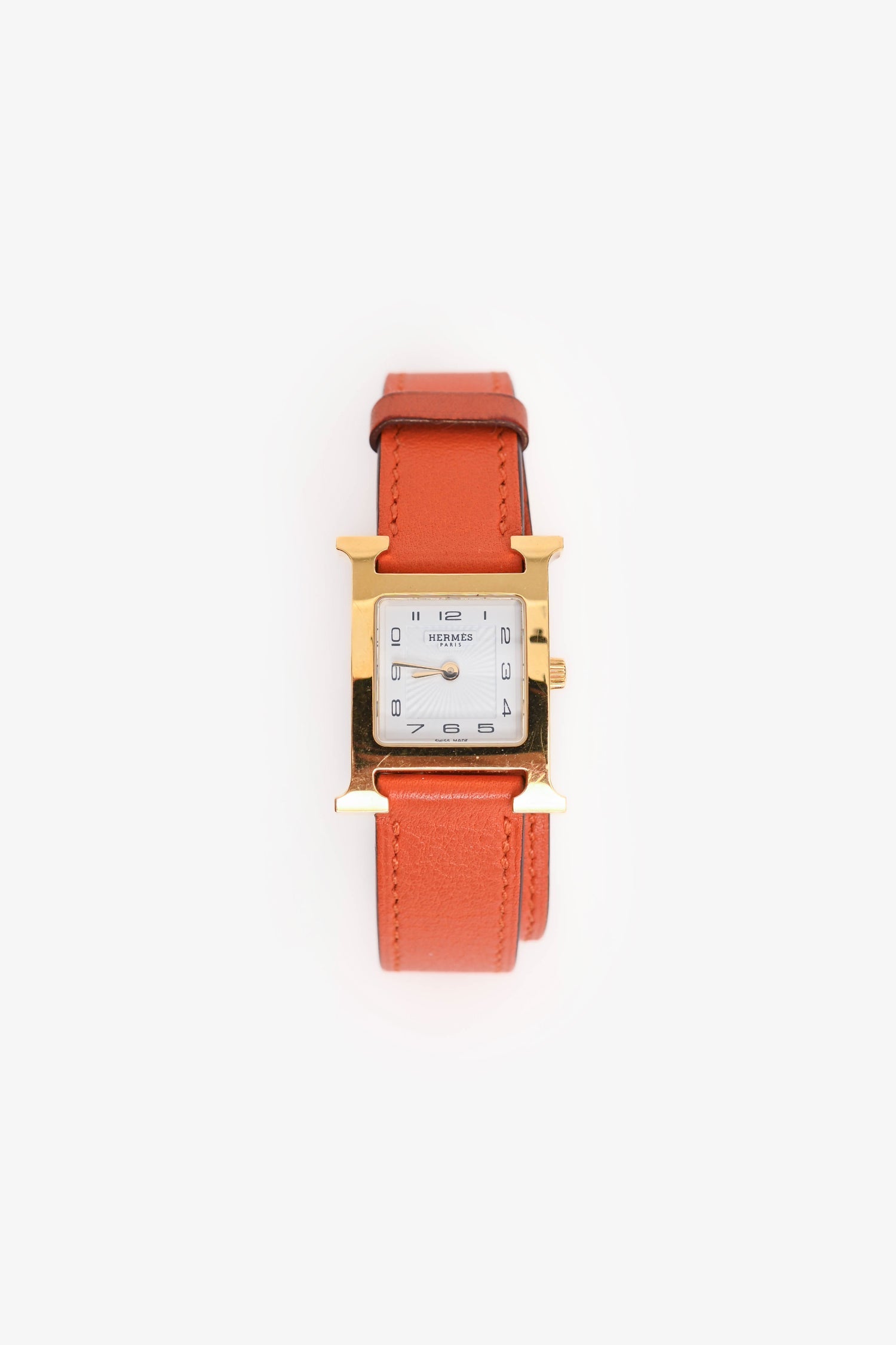 Hermès Orange Leather Heure H Double Tour Watch. Buckle closure. Square face. Tonal stitching.