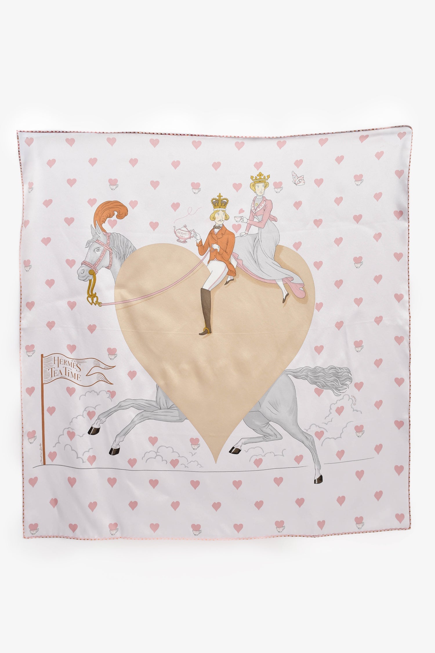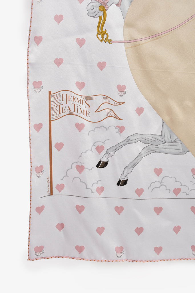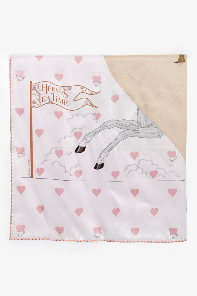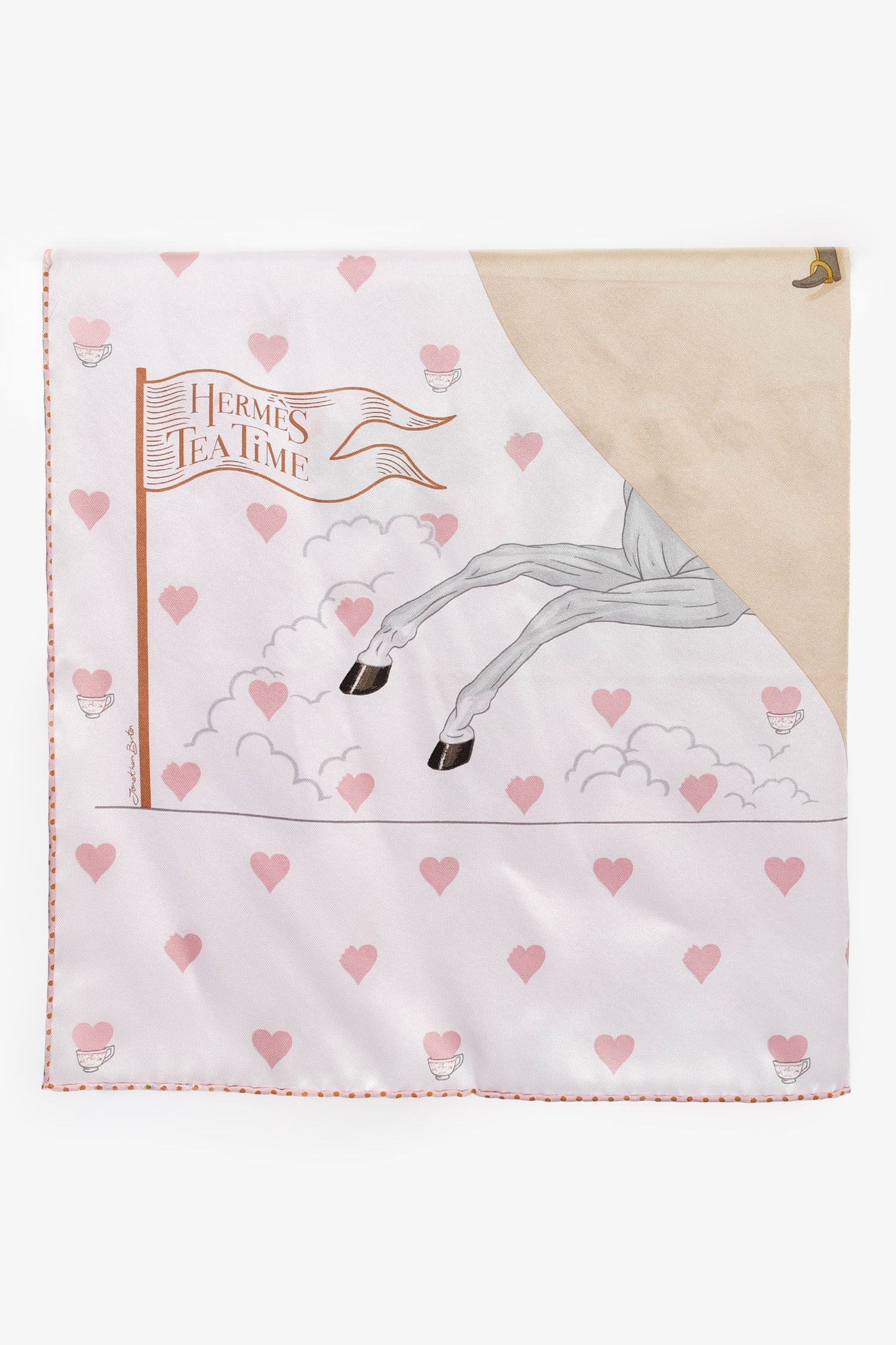 Hermès Pink/Brown Silk 'Tea Time' Scarf. Tonal stitching.