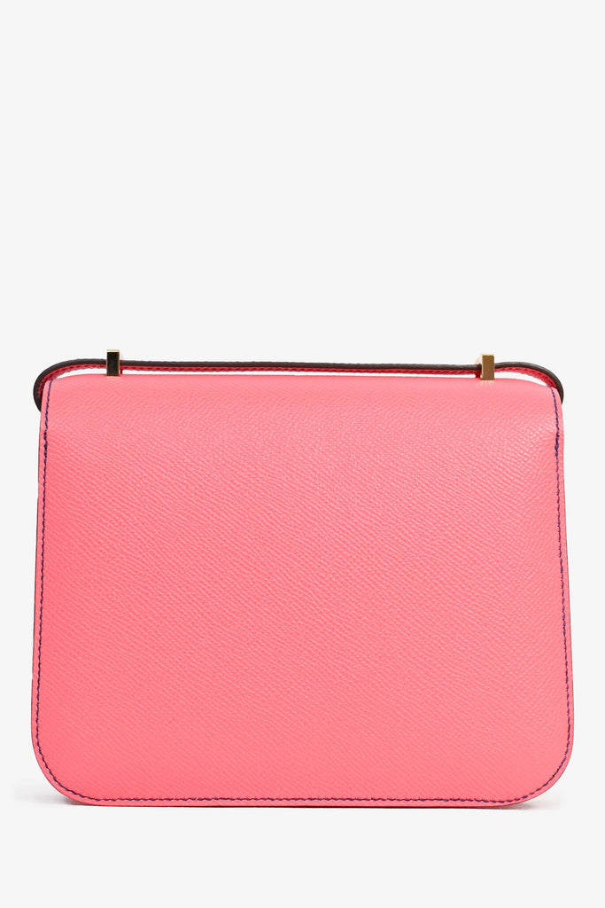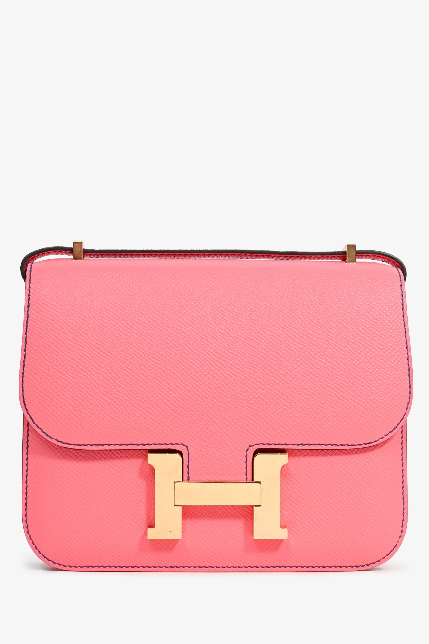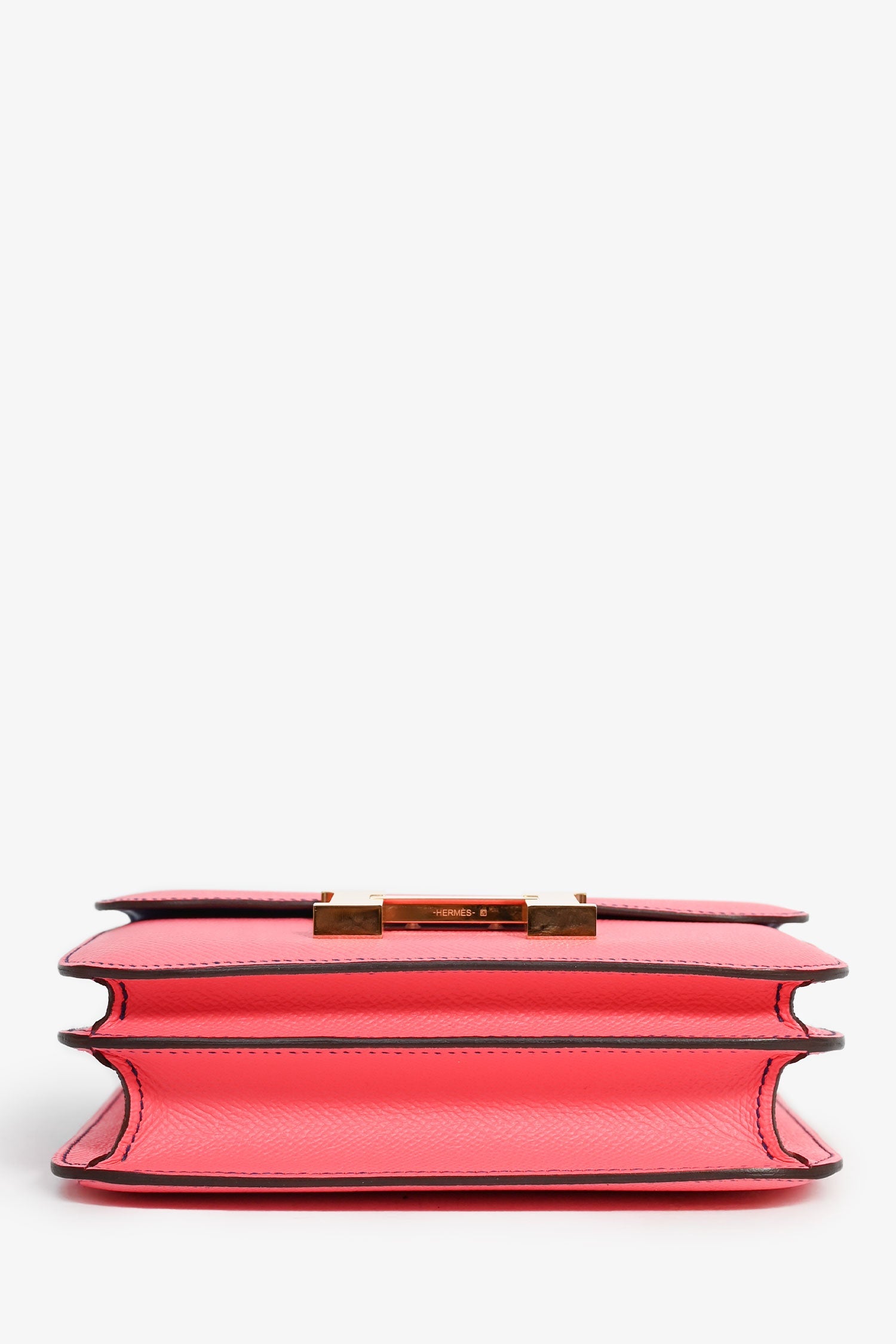 Hermès Pink Leather Constance 18. Front fold-over flap with pull-release closure. Two compartment each with a walls slip pocket. Leather lining. Gold-tone hardware. Contrast stitching.