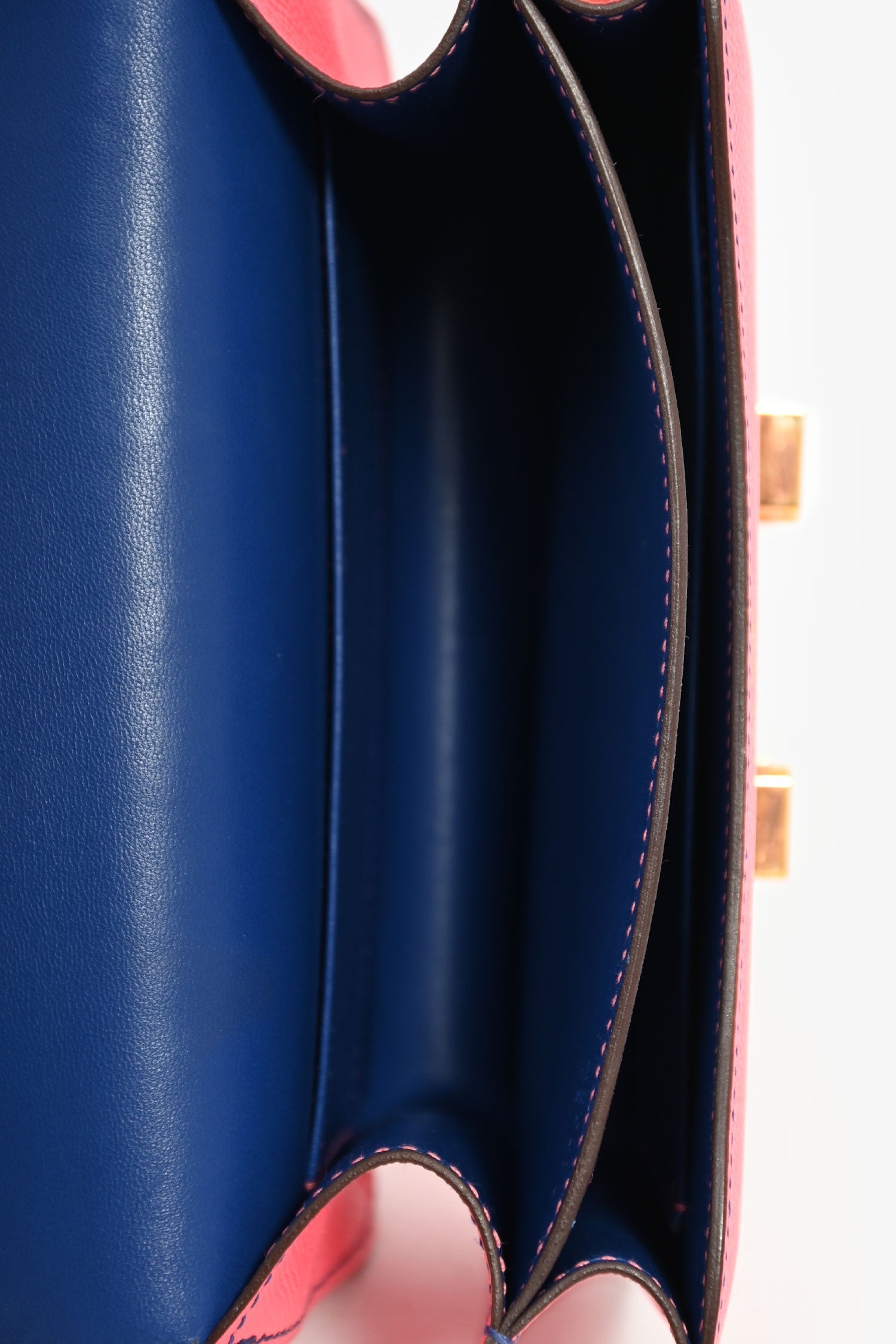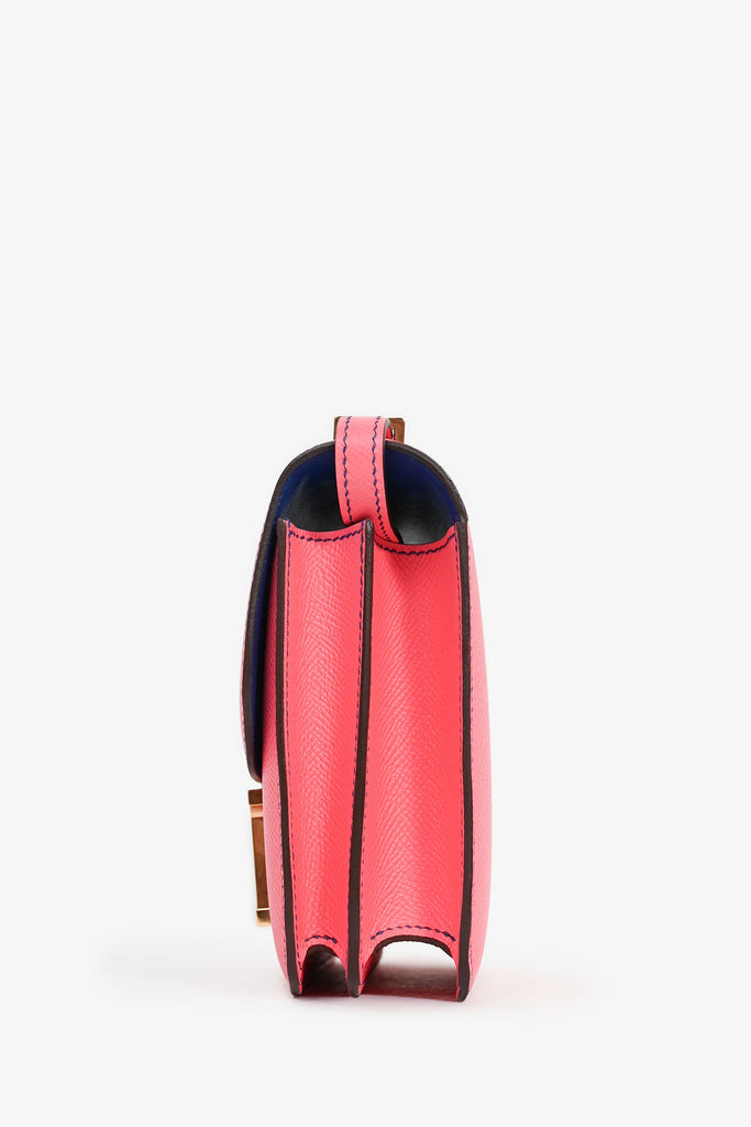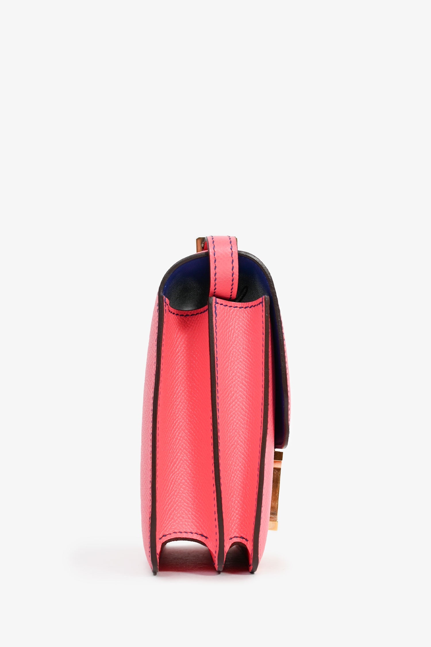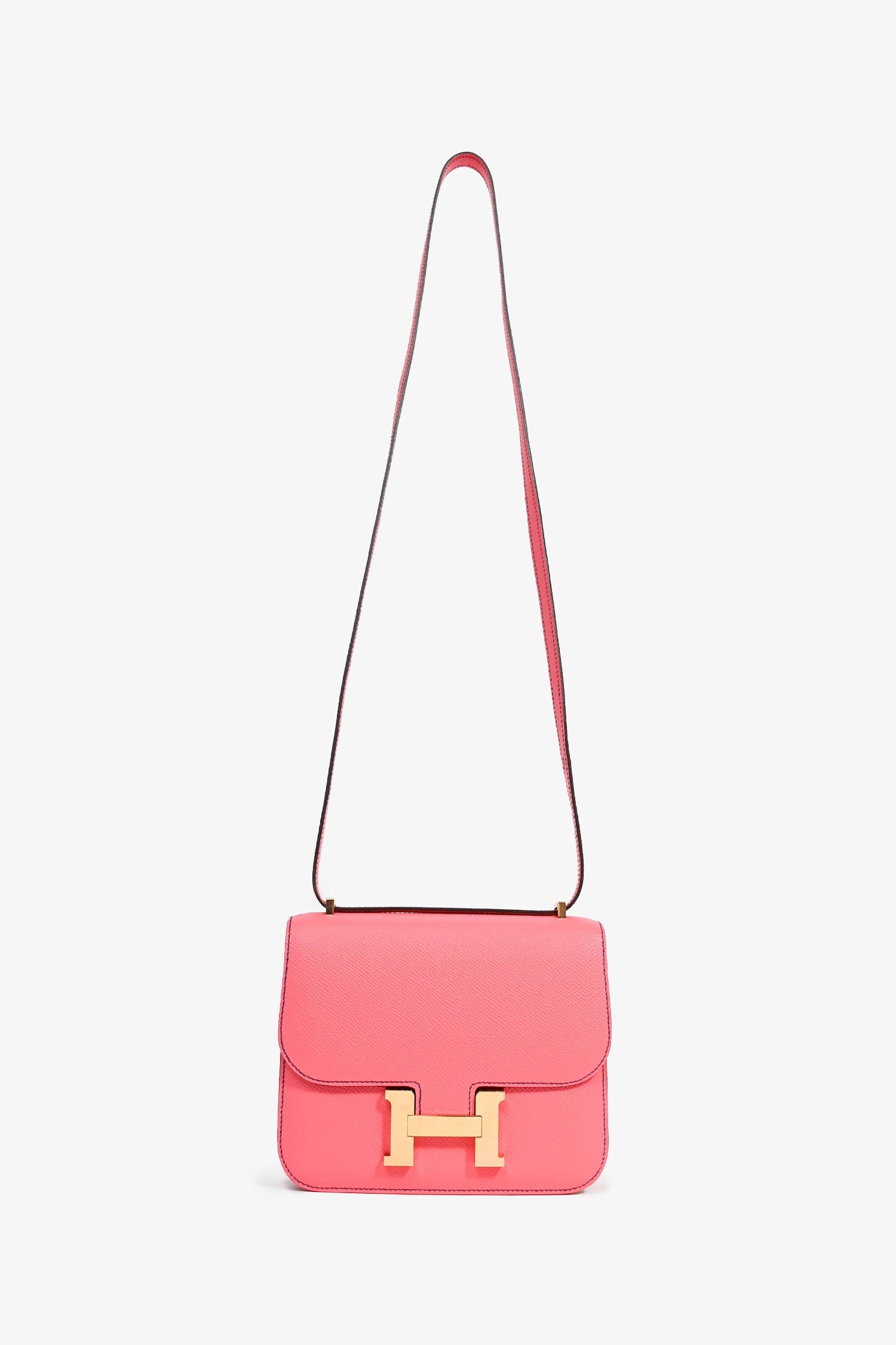 Hermès Pink Leather Constance 18. Front fold-over flap with pull-release closure. Two compartment each with a walls slip pocket. Leather lining. Gold-tone hardware. Contrast stitching.
