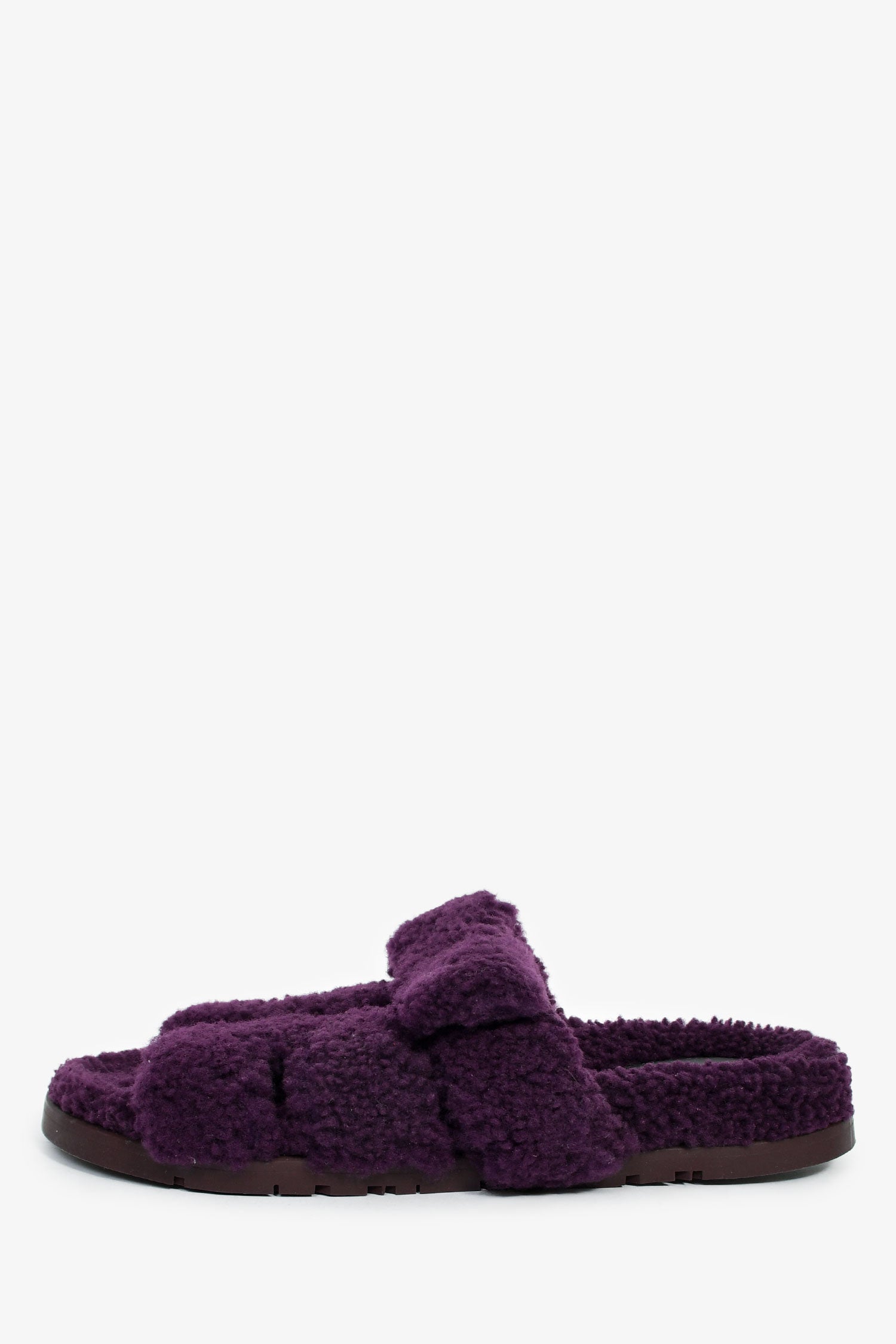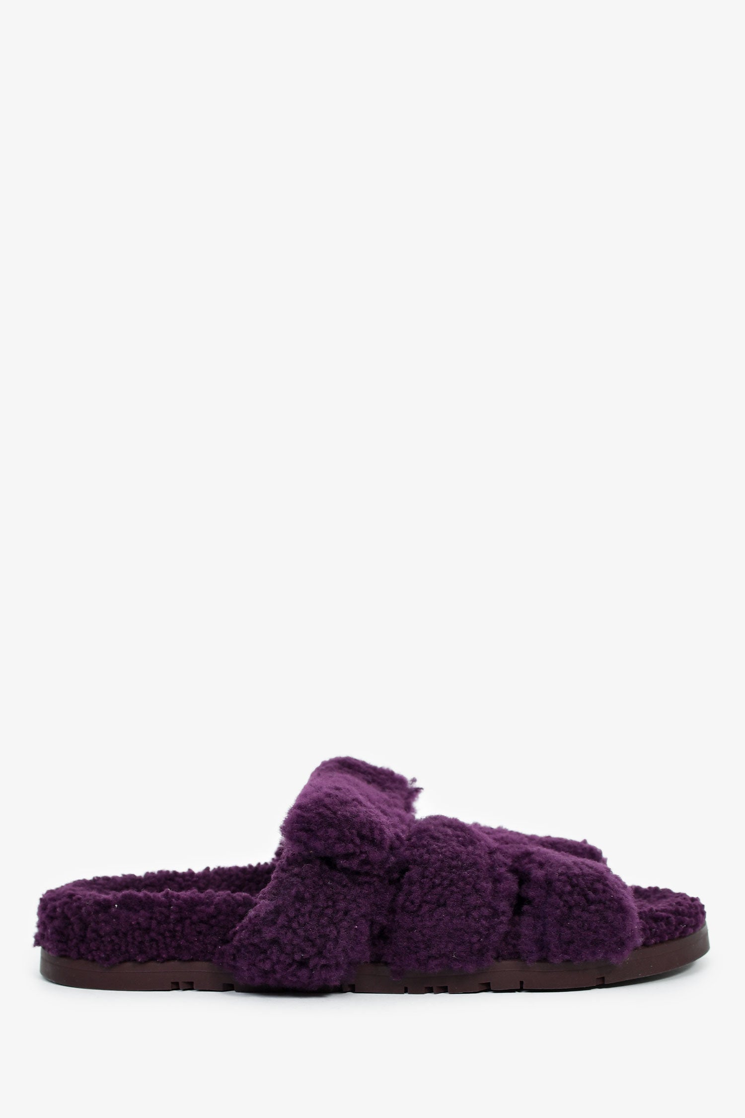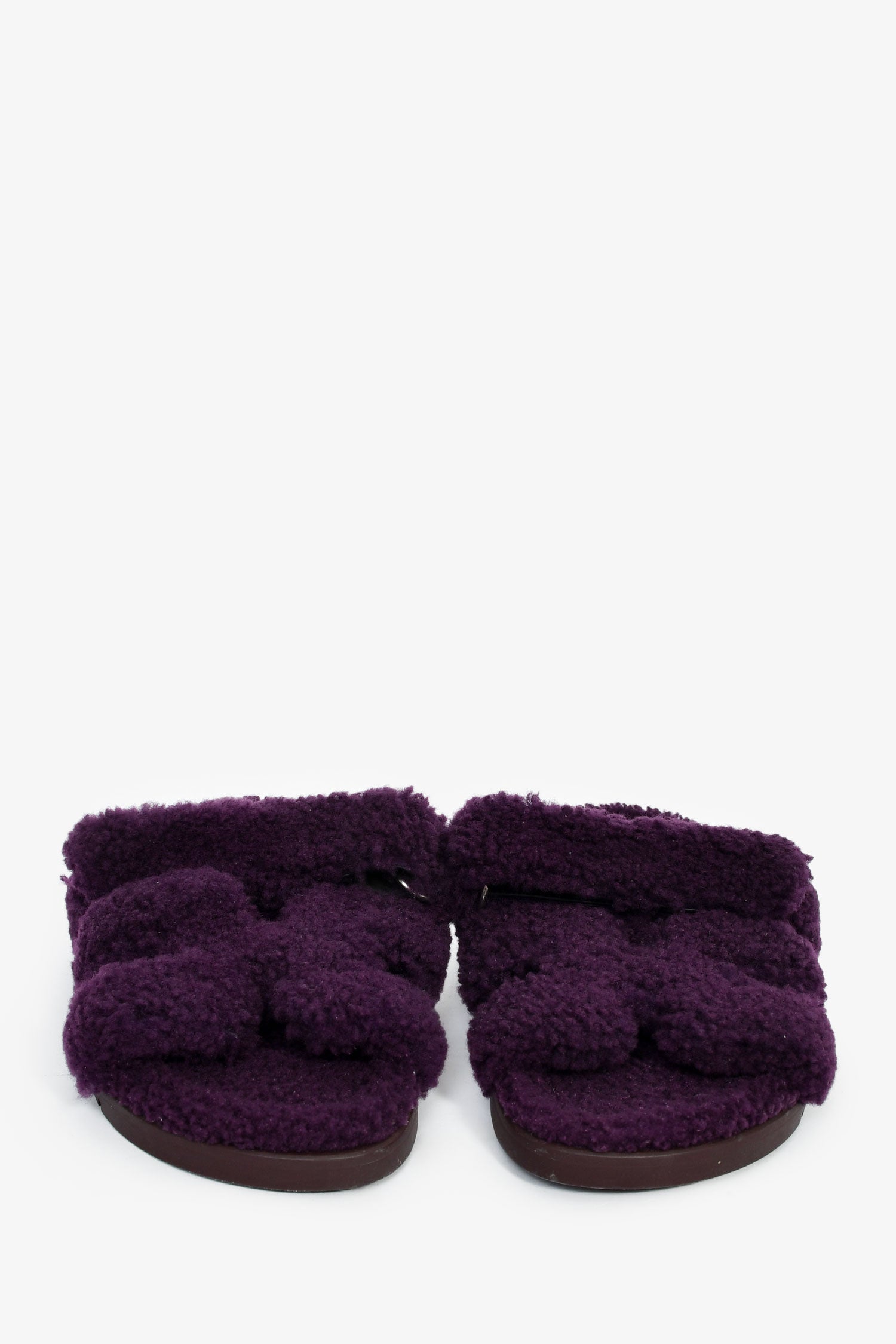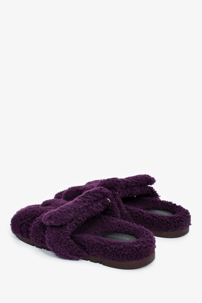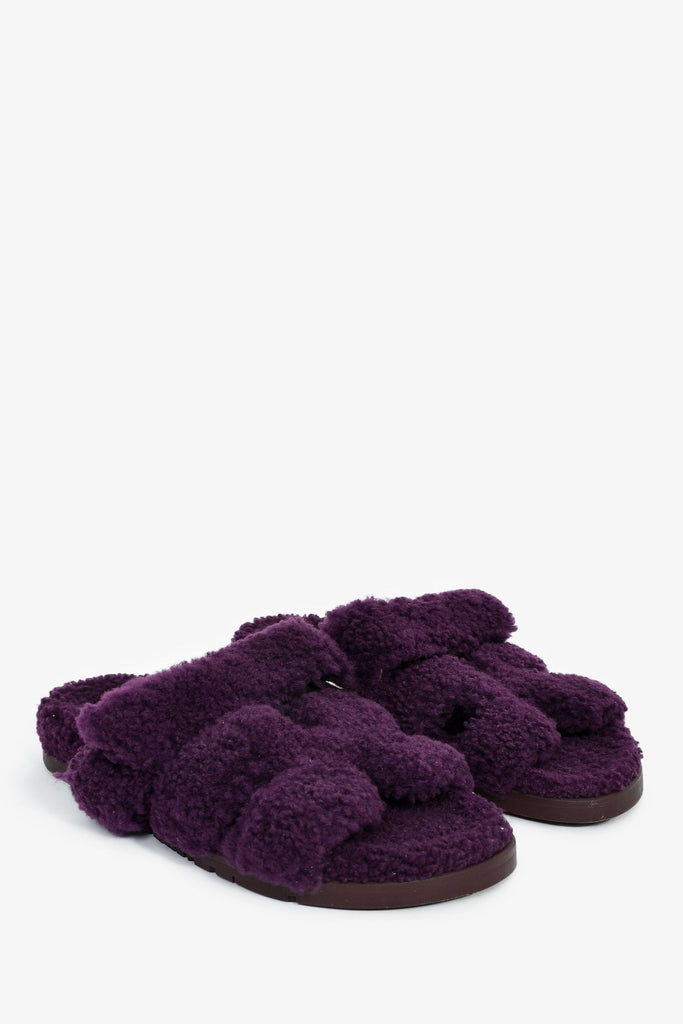 Hermès Purple Shearling 'Chypre' Sandals. Slip-on. Open round toe. Top strap with velcro closure. Silver-tone hardware. Tonal stitching.