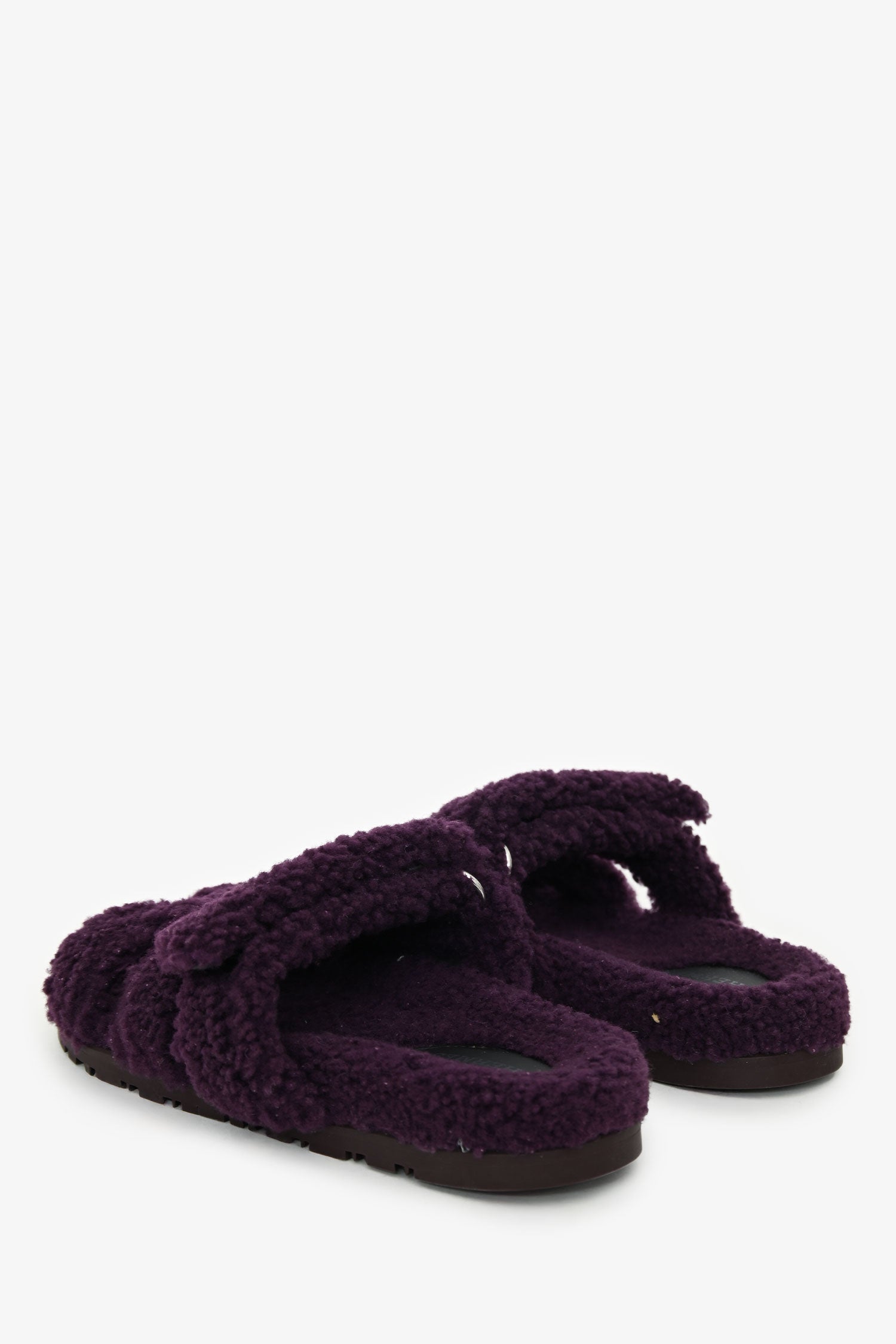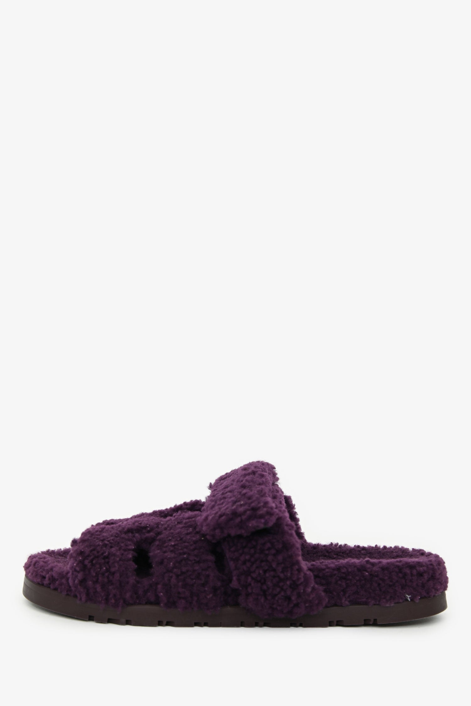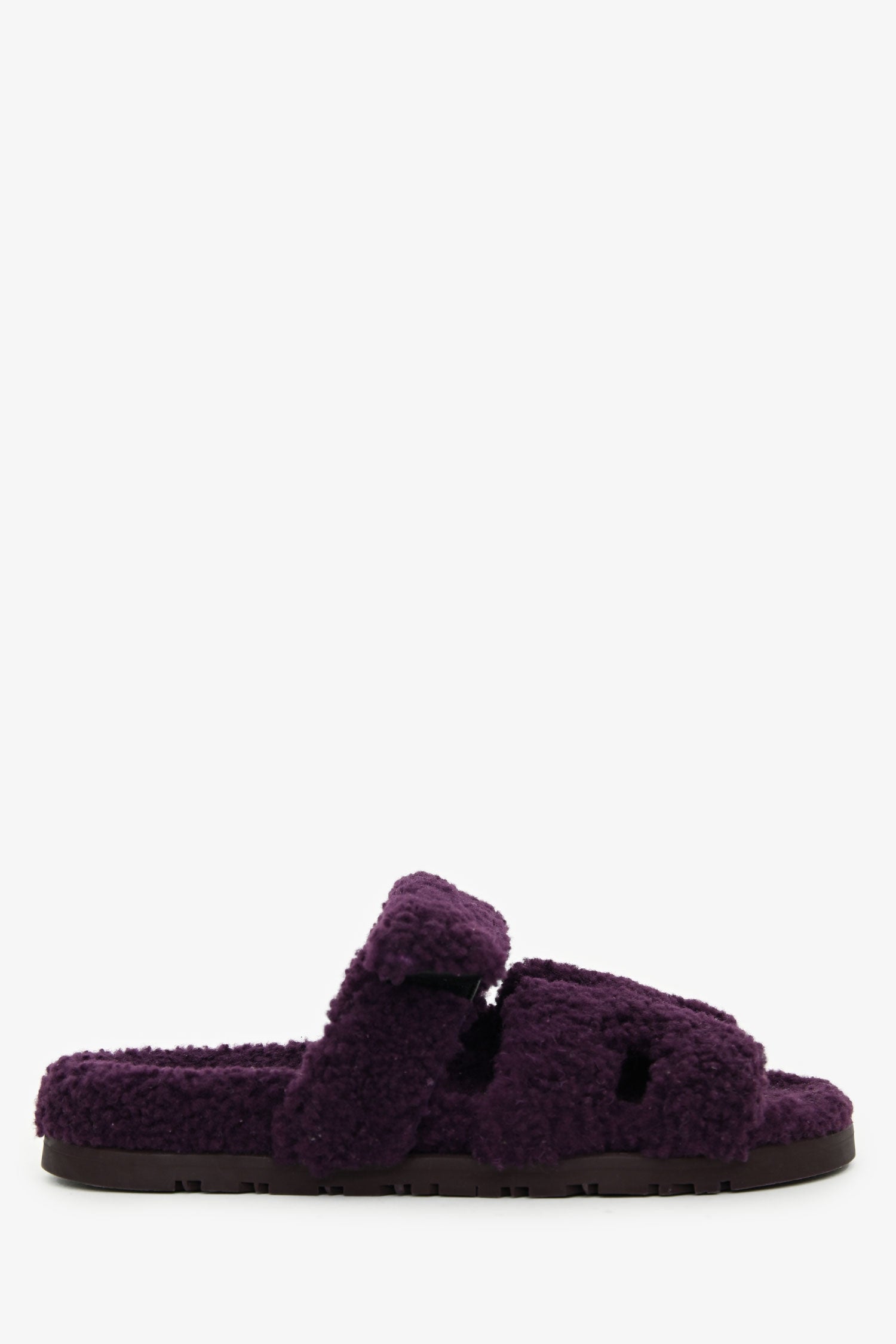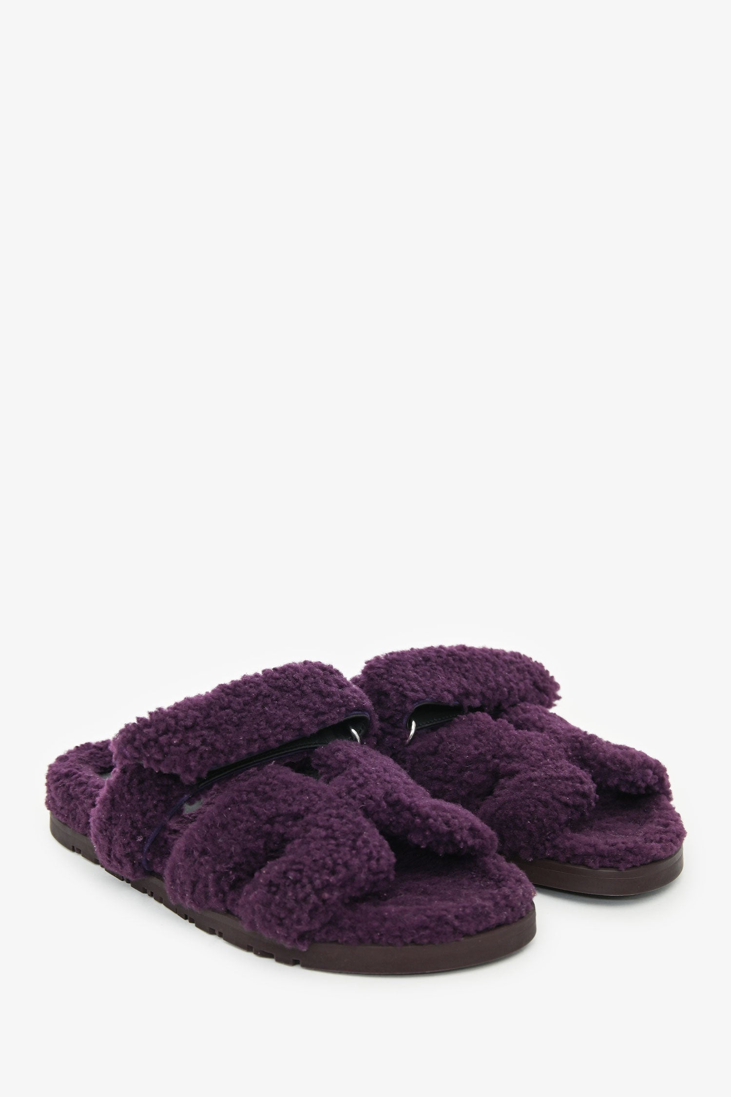 Hermès Purple Shearling Leather Chypre Sandals. Slip-on. Round toe. Shearling velcro strap. Rubber soles. Tonal stitching.