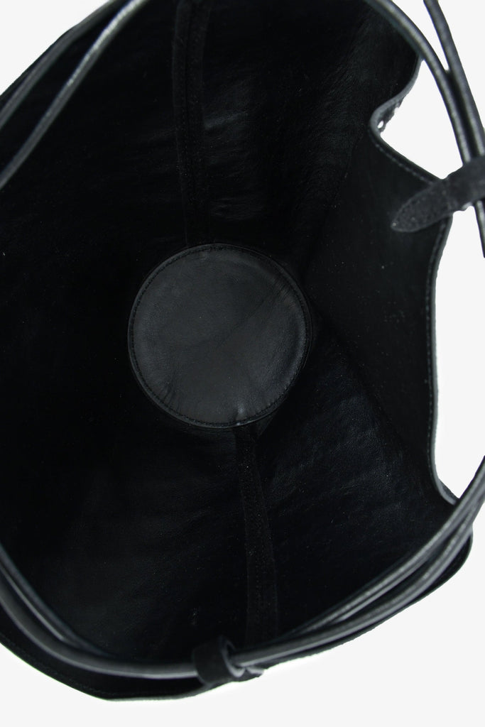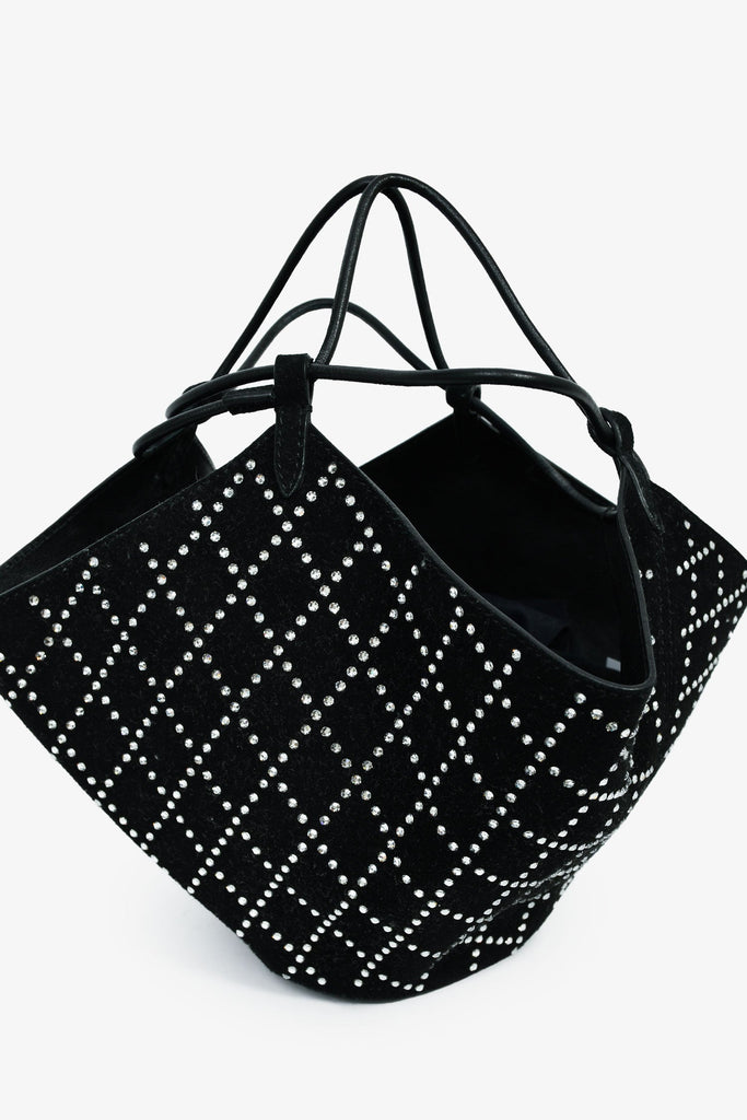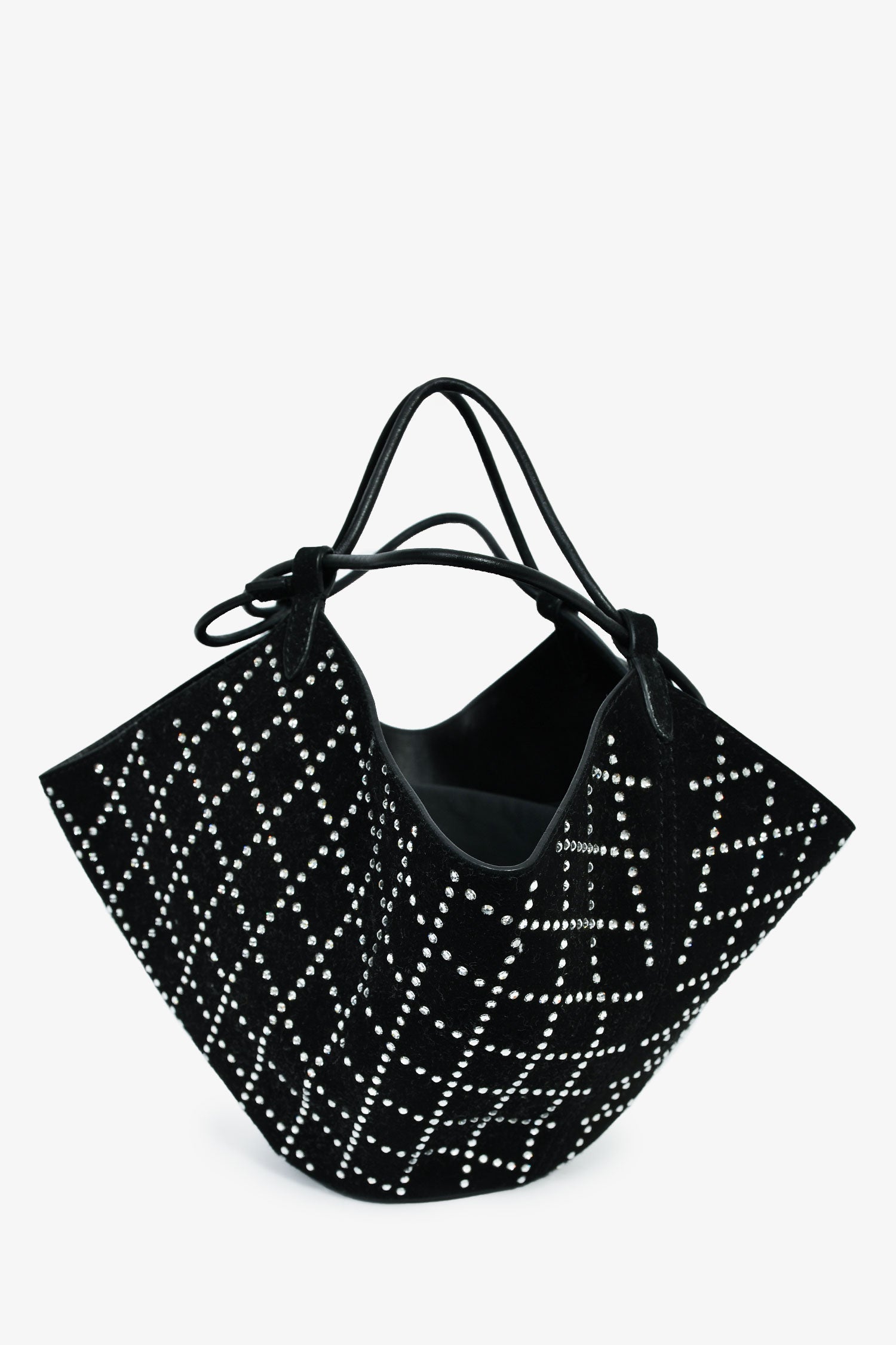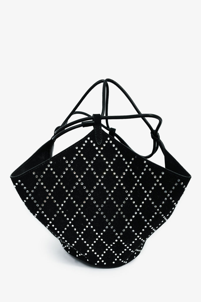 Khaite Black Suede/Crystal Mini 'Lotus' Drawstring Bag. Open top and interior. Tonal leather interior.