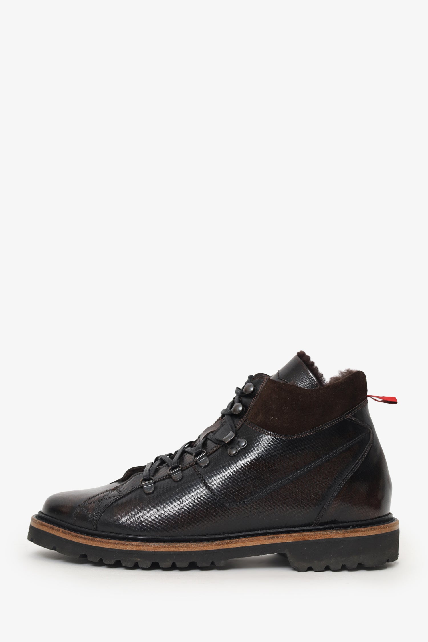 Kiton Brown Leather/Shearling Lace Up Boots. Pull-on. Round toe. Front lace-up closure. Shearling lined. Rear pull tab. Gunmetal-tone hardware. Tonal stitching.