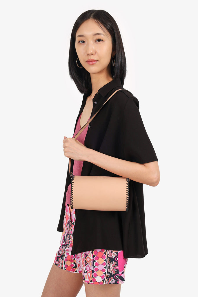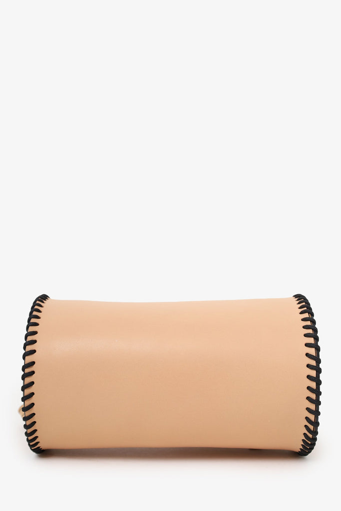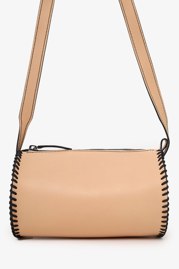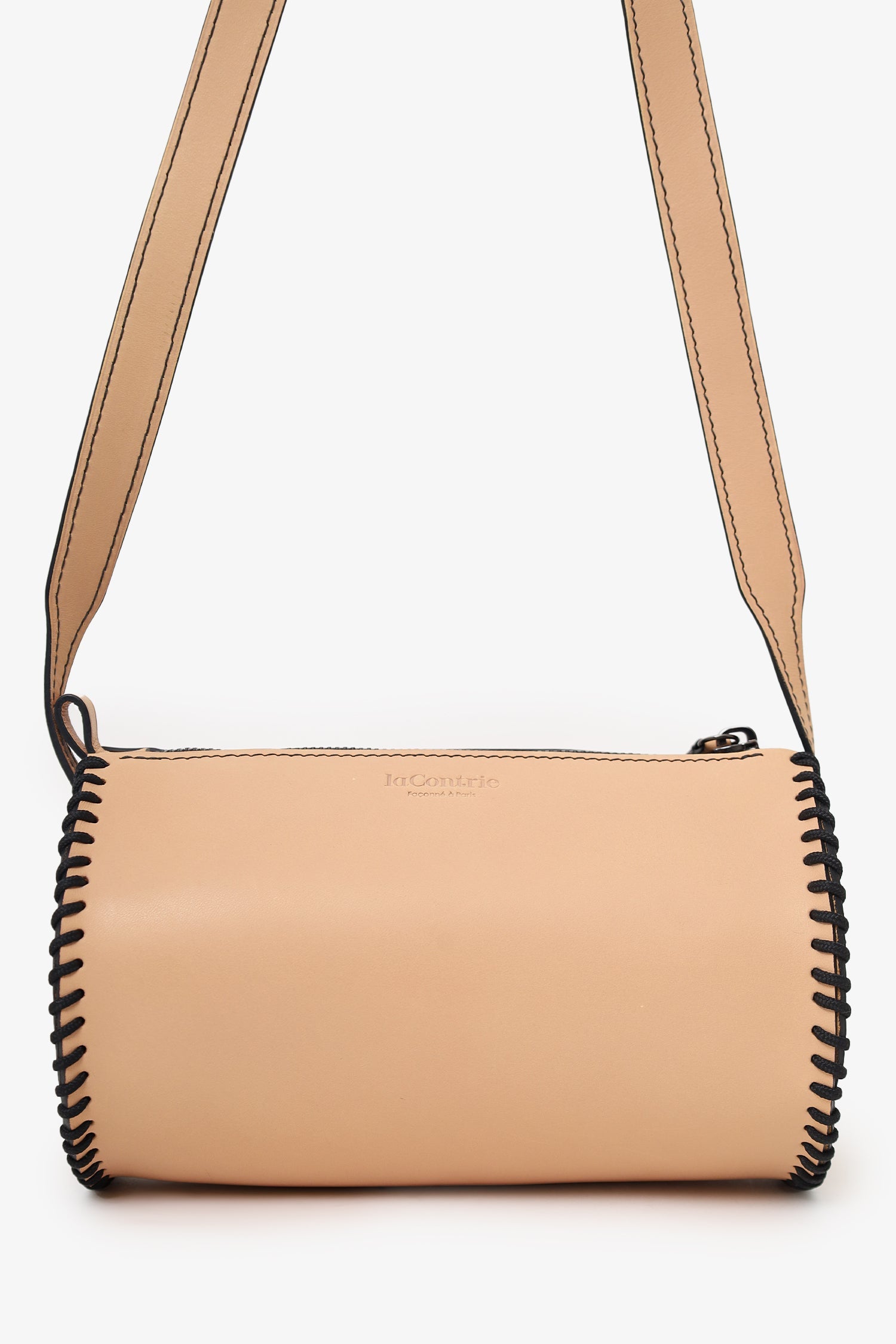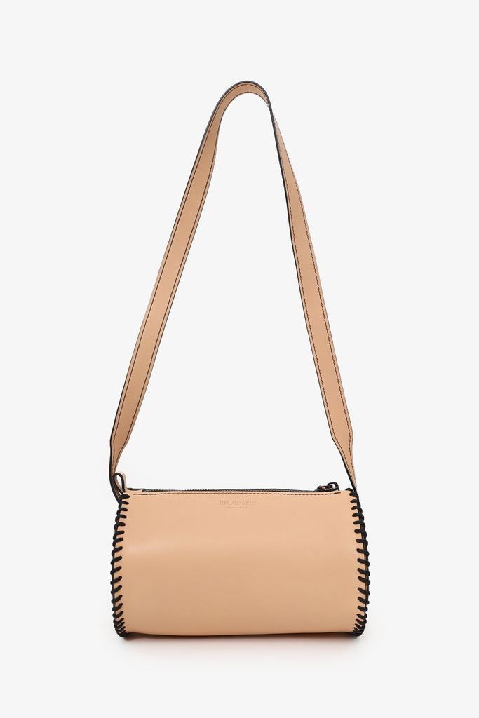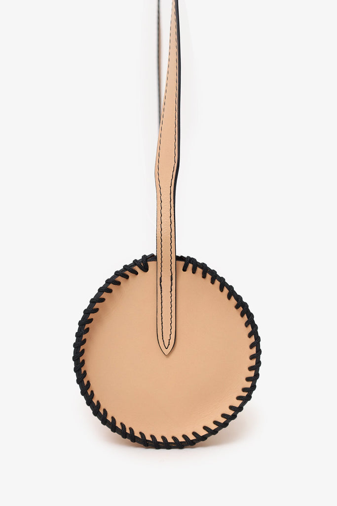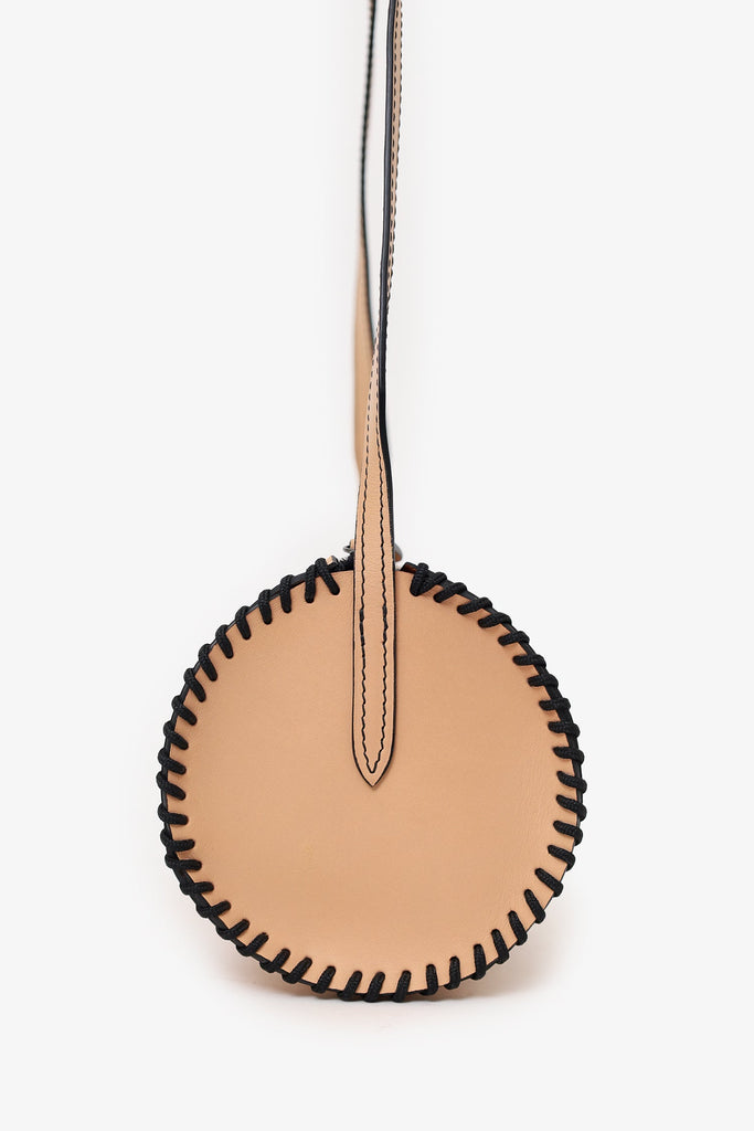 La Contrie Beige Round Bag. Top zip closure. Crossbody strap. Open unlined interior. Tonal stitching.