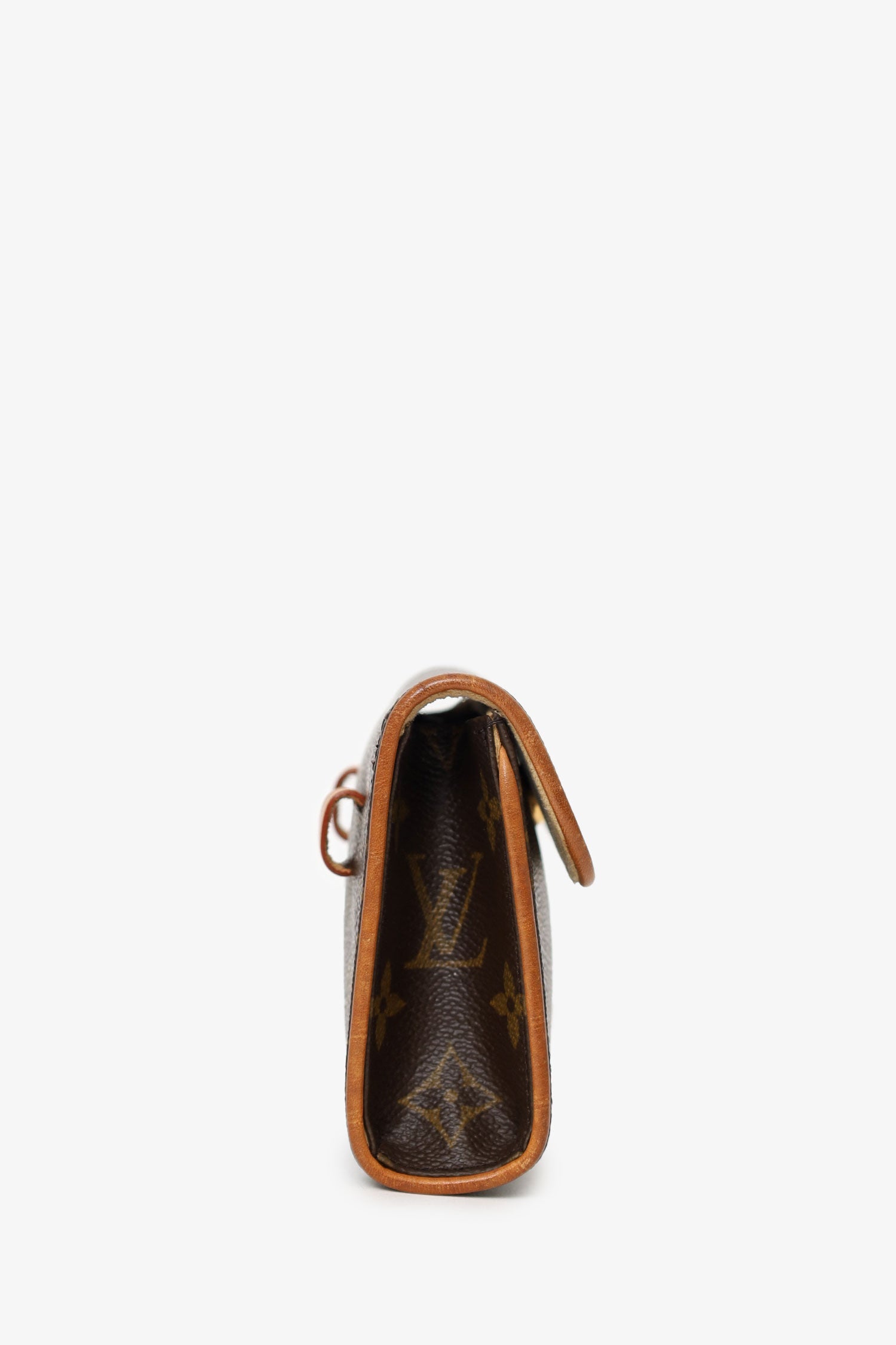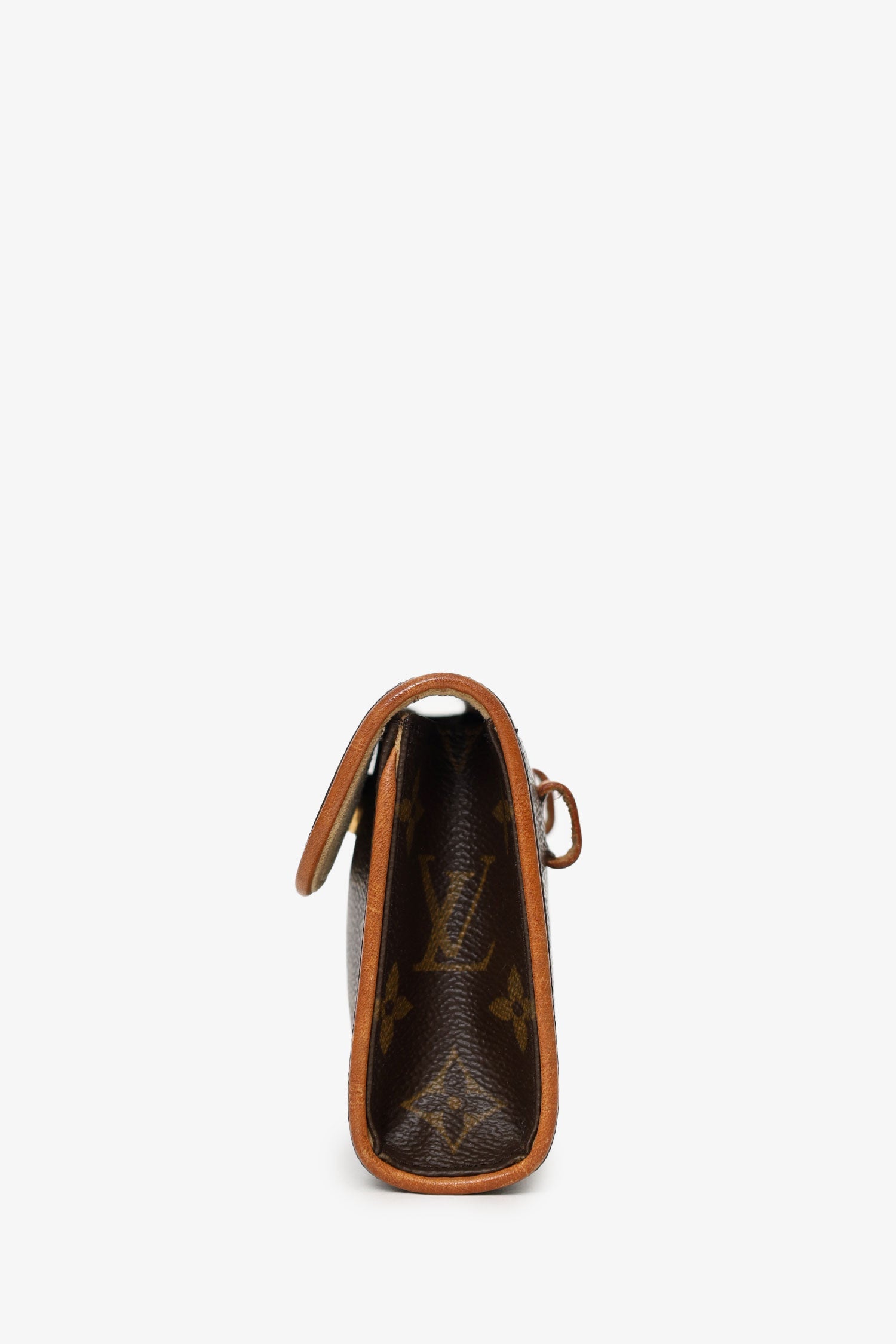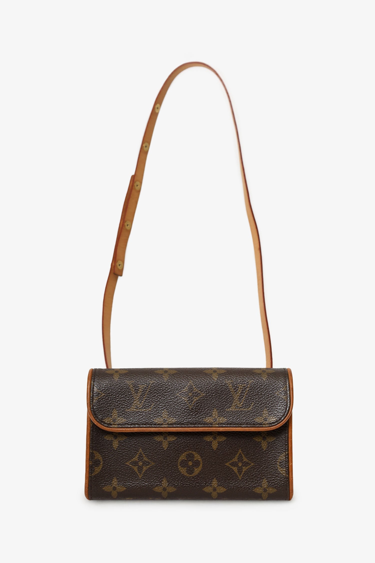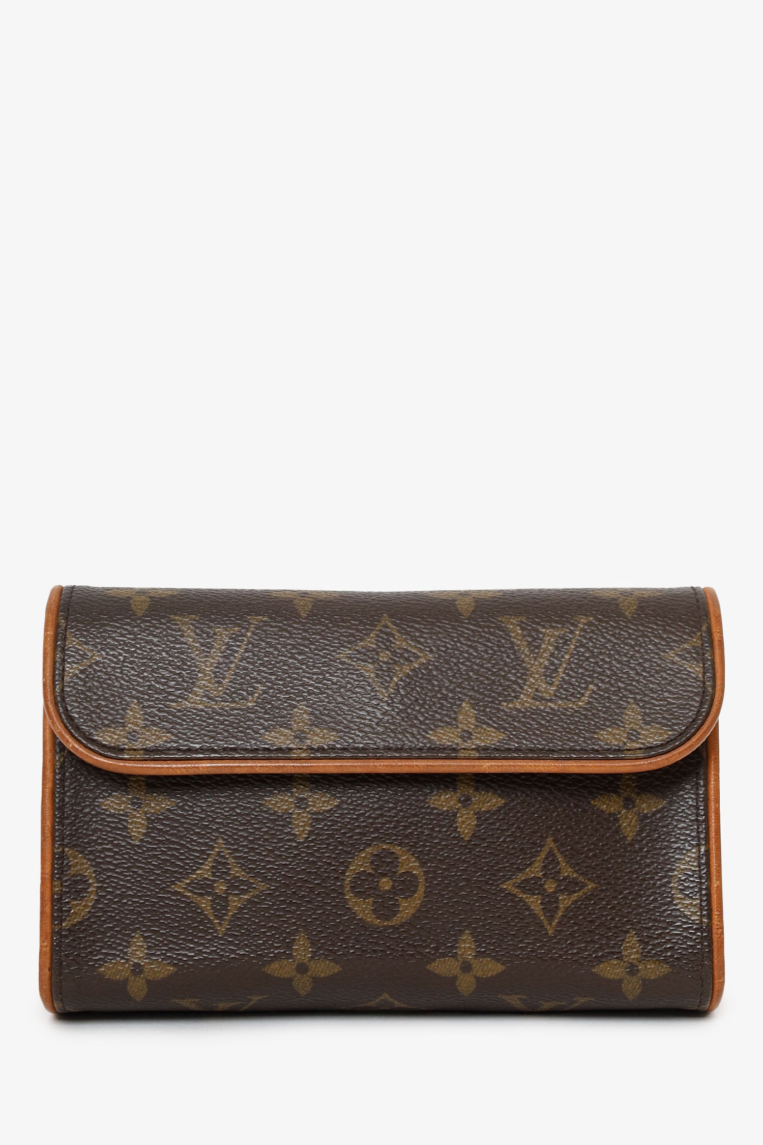 Louis Vuitton 2001 Monogram Florentine Belt Bag. Front fold-over flap with magnetic snap-button closure. Removable belt with adjustable push-pin closure. Open suede-lined interior. Gold-tone hardware. Tonal stitching.