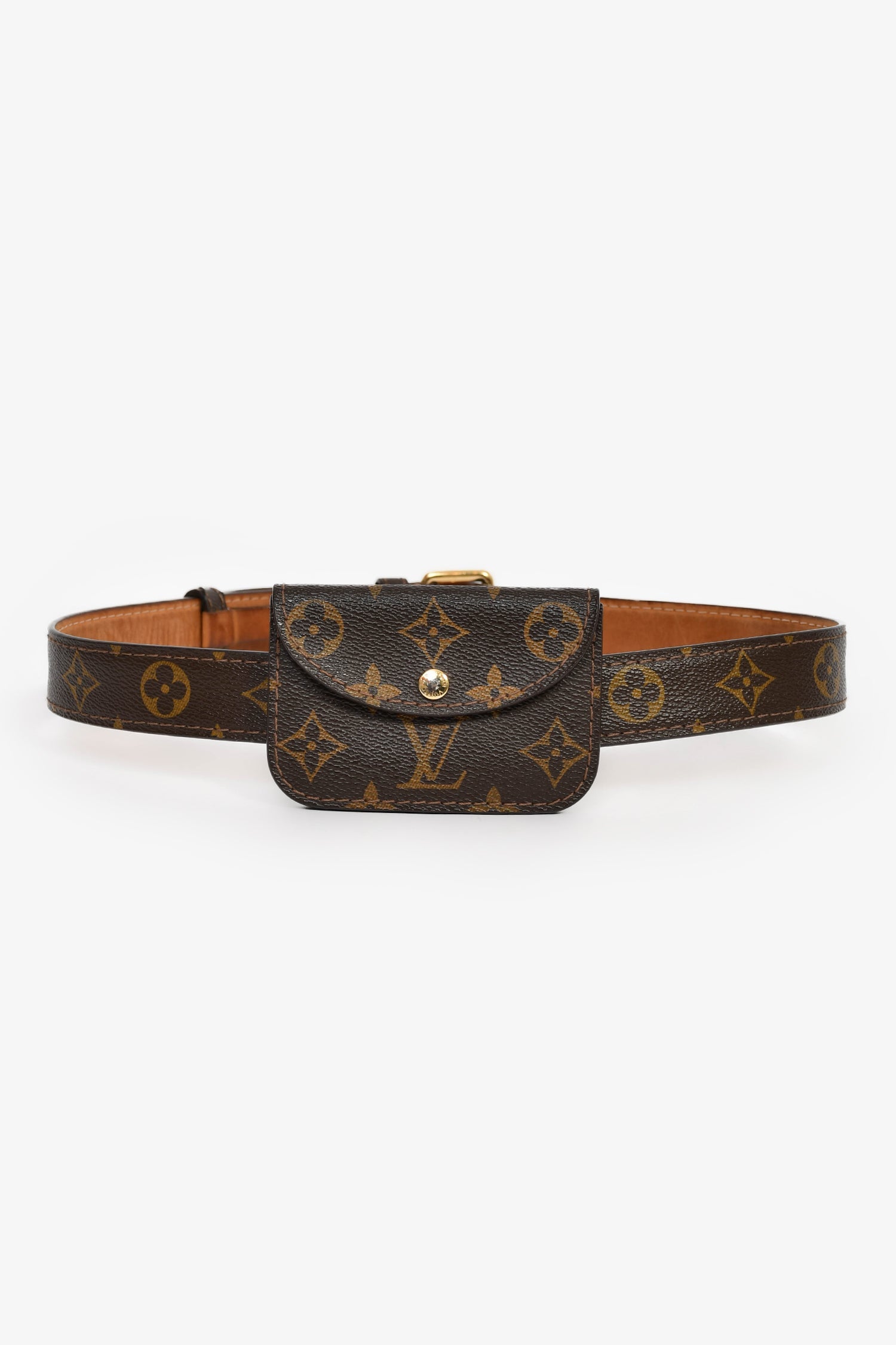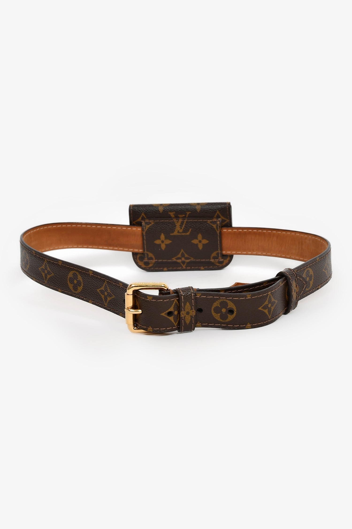Louis Vuitton 2006 Monogram Canvas Ceinture Pochette Solo Belt. Adjustable pull-through buckle closure. Slide-around pouch with fold-over flap and snap-button closure. Gold-tone hardware. Tonal stitching.