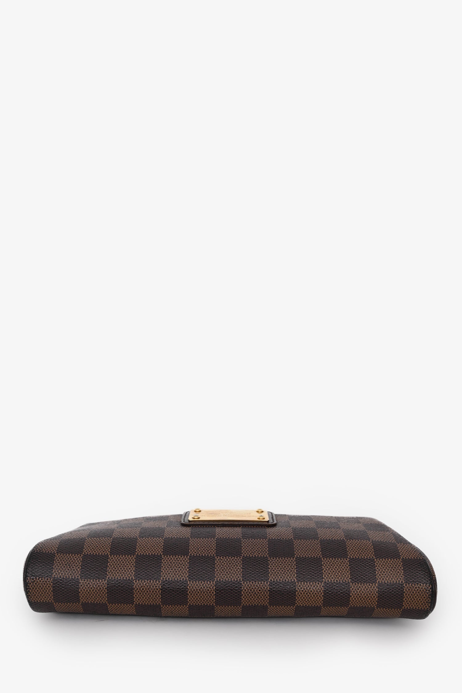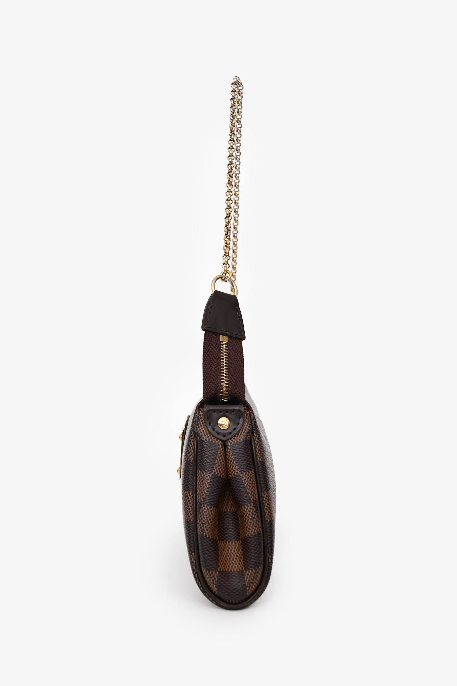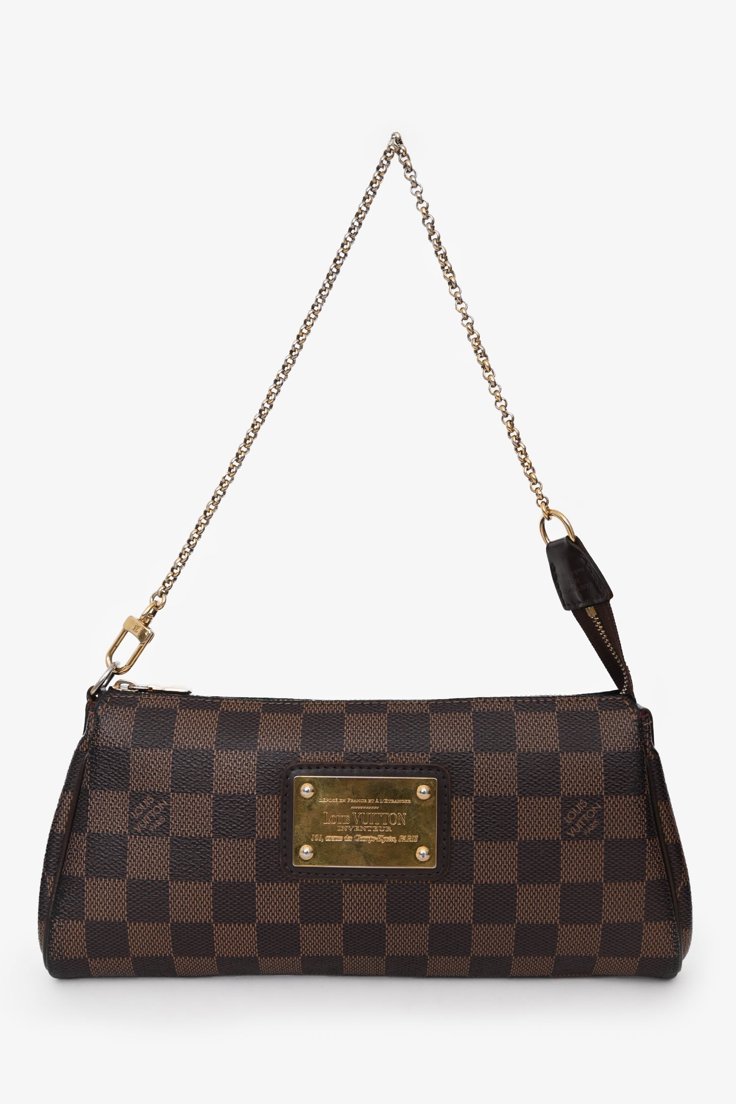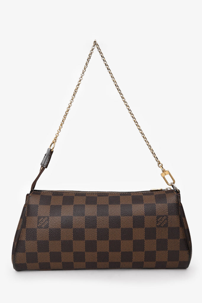 Louis Vuitton 2010 Damier Ebene Eva Pochette. Top zip closure. Chain-link shoulder strap. Lined open canvas interior. Gold-tone hardware. Tonal stitching.