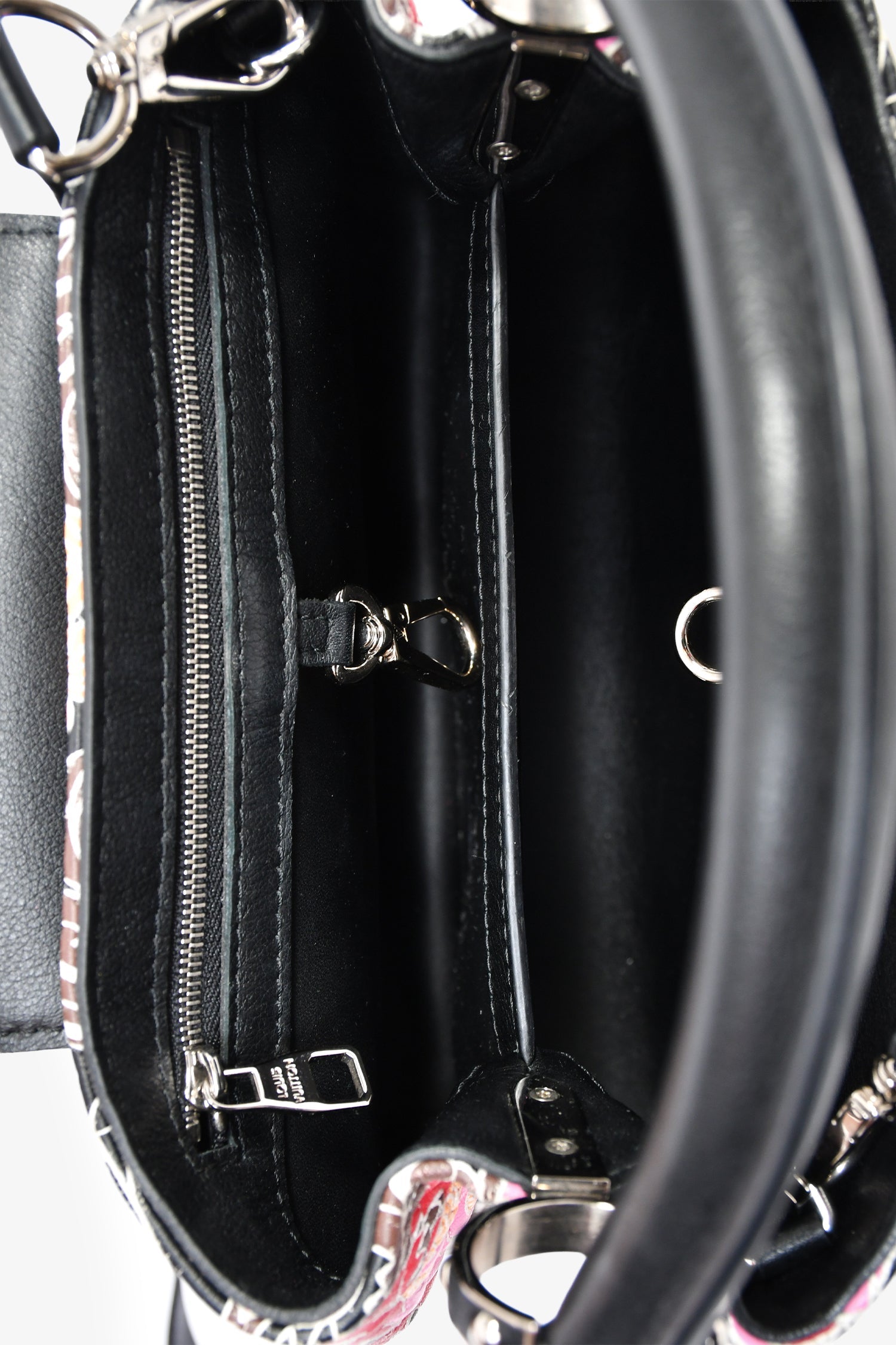 Louis Vuitton 2015 Black/Multicolour Leather Wild Flowers Capucines BB Top Handle Bag with Strap. Top fold-over flap closure. Detachable strap. Protective base studs. Lined interior. 2 main compartments; separated by a divider. Single interior wall zip pocket. Silver-tone hardware. Tonal stitching.