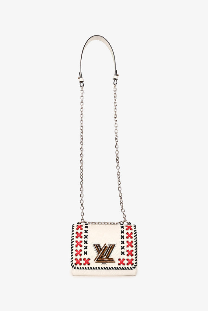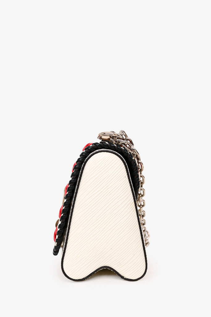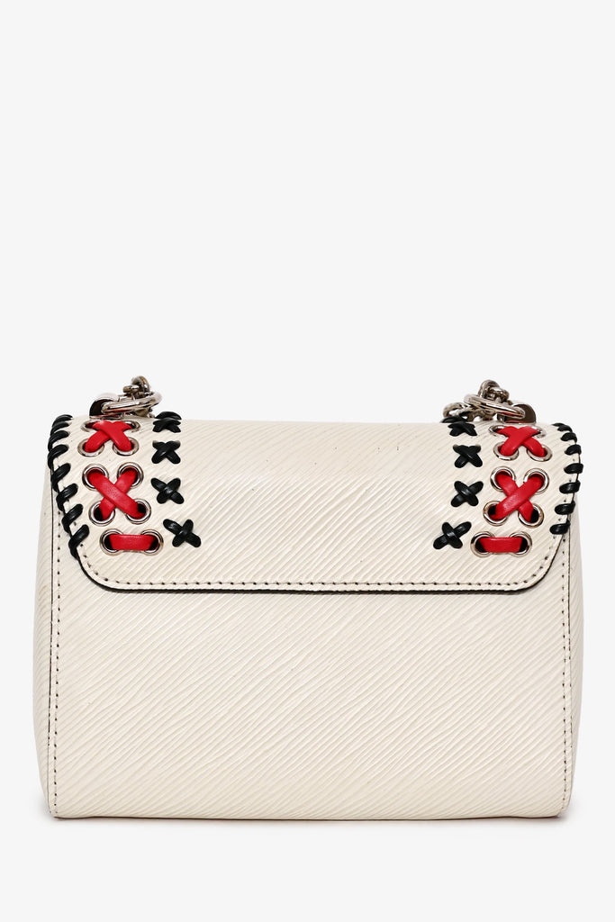 Louis Vuitton 2016 White Epi Leather Stitch Detail Twist Crossbody. Fold-over flap with a twist lock closure. Chain-link crossbody strap. Suede-lined interior with 2 slip pockets. Silver-tone hardware. Tonal stitching.