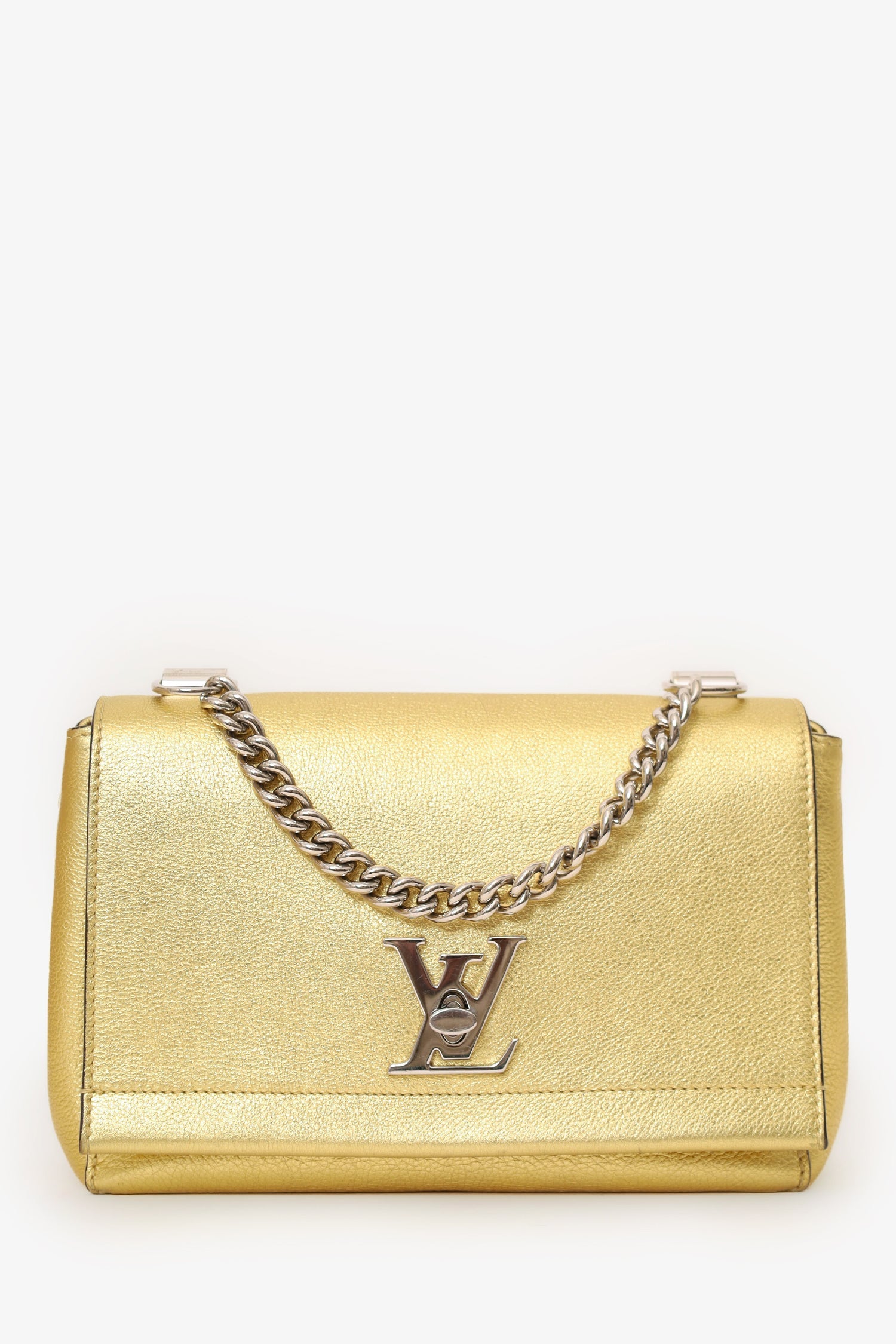 Louis Vuitton 2017 Gold Metallic Taurillon Leather 'LockMe' BB Chain Bag with Strap. Front-fold-over-flap with turn-lock closure. Removable crossbody strap with shoulder protector. Snap-button-up closure exterior sides. Lined interior with 2 slip pockets. Silver-tone hardware. Tonal stitching.