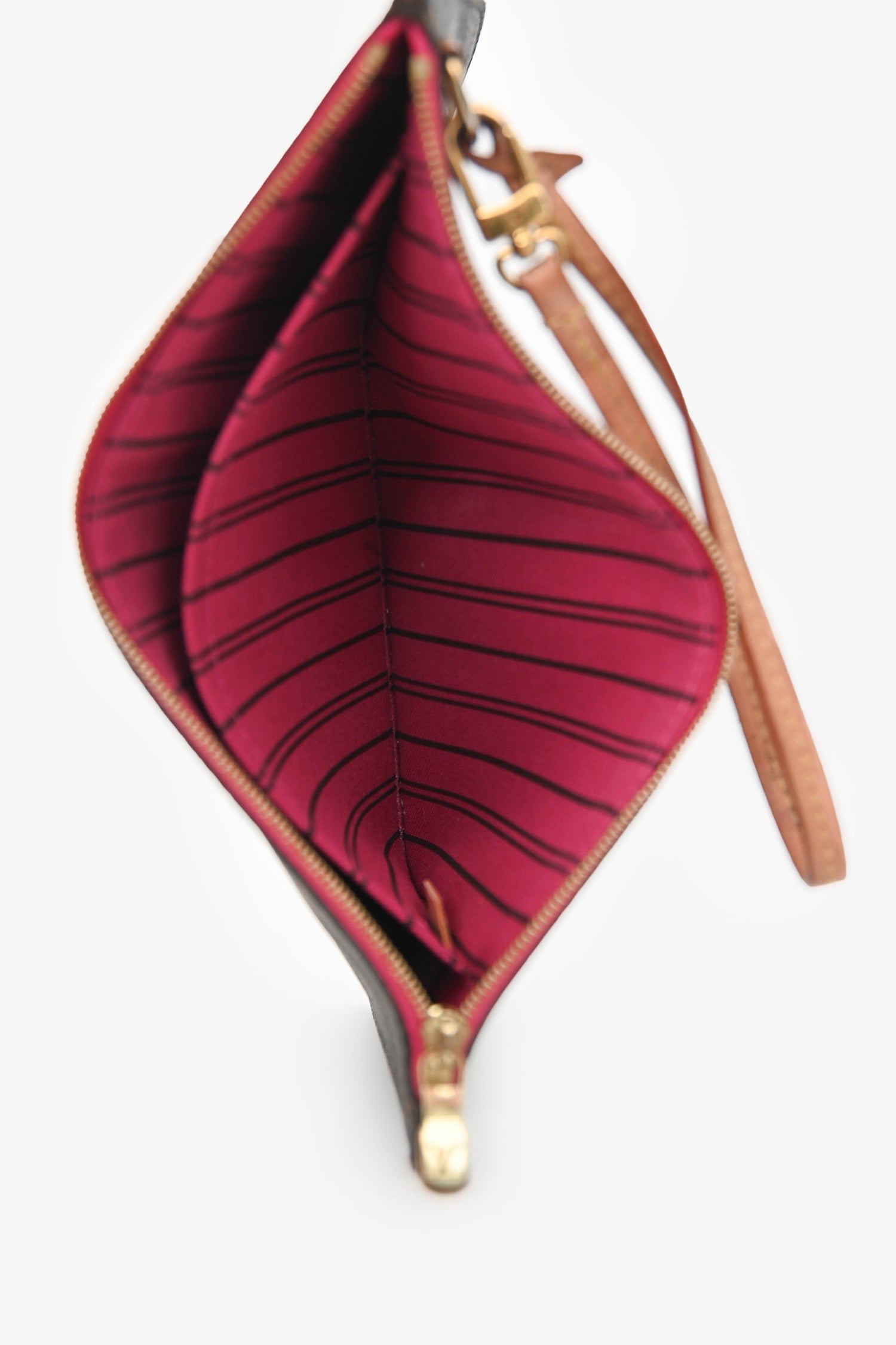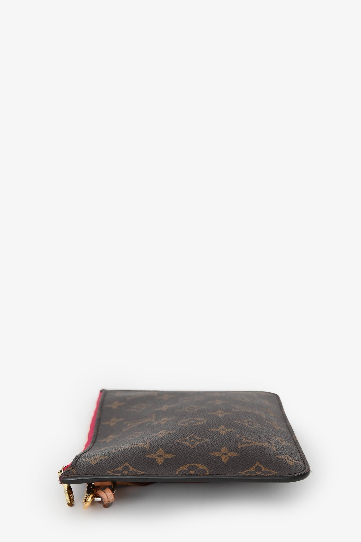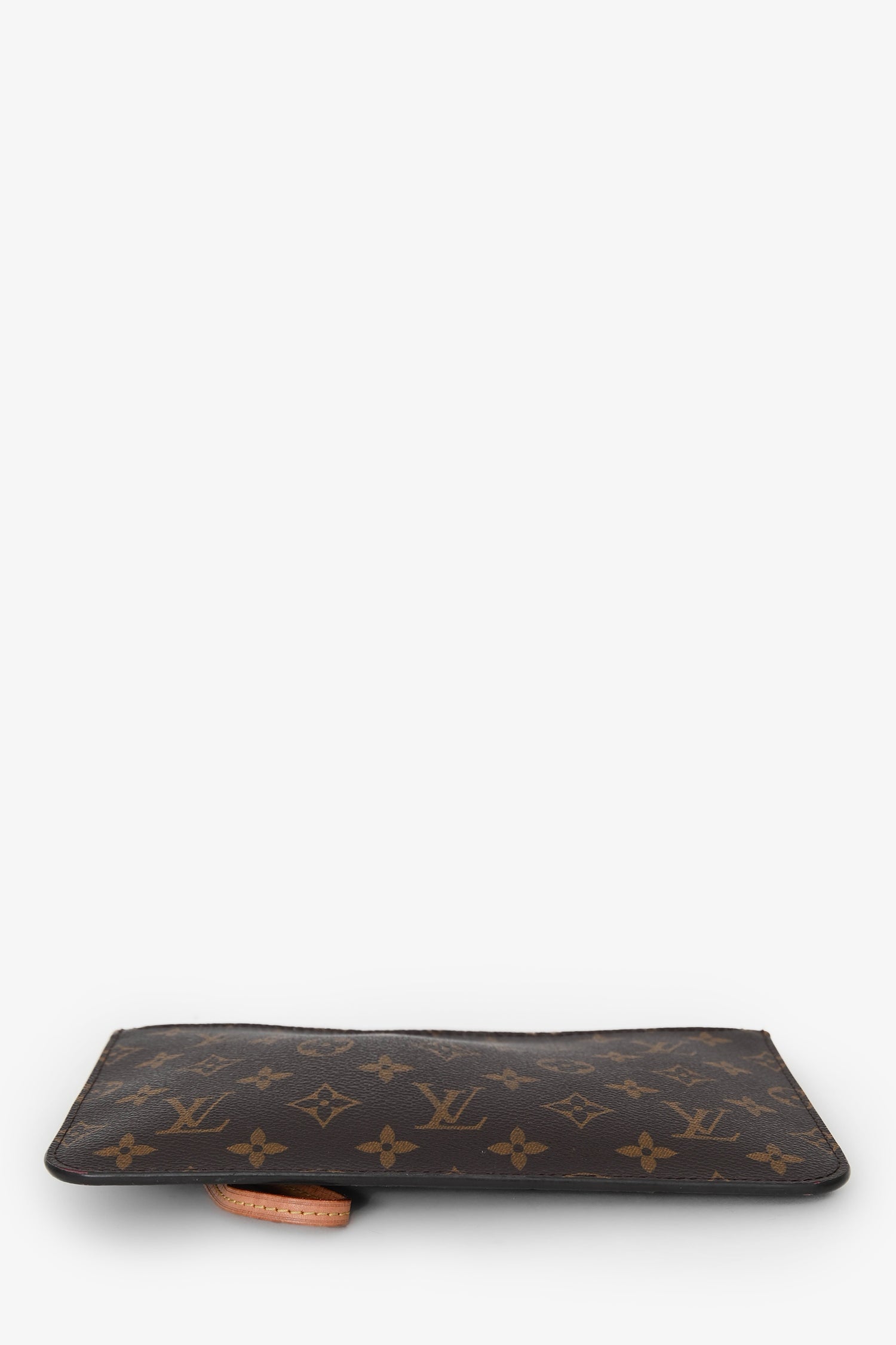 Louis Vuitton 2020 Monogram Neverfull Pouch. Top zip closure. Detachable wrist strap. Textile-line interior. Single interior compartment with a wall slip pocket. Gold-tone hardware. Tonal stitching.