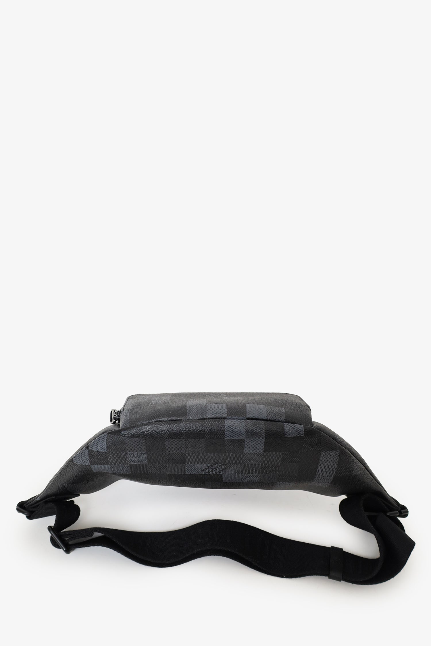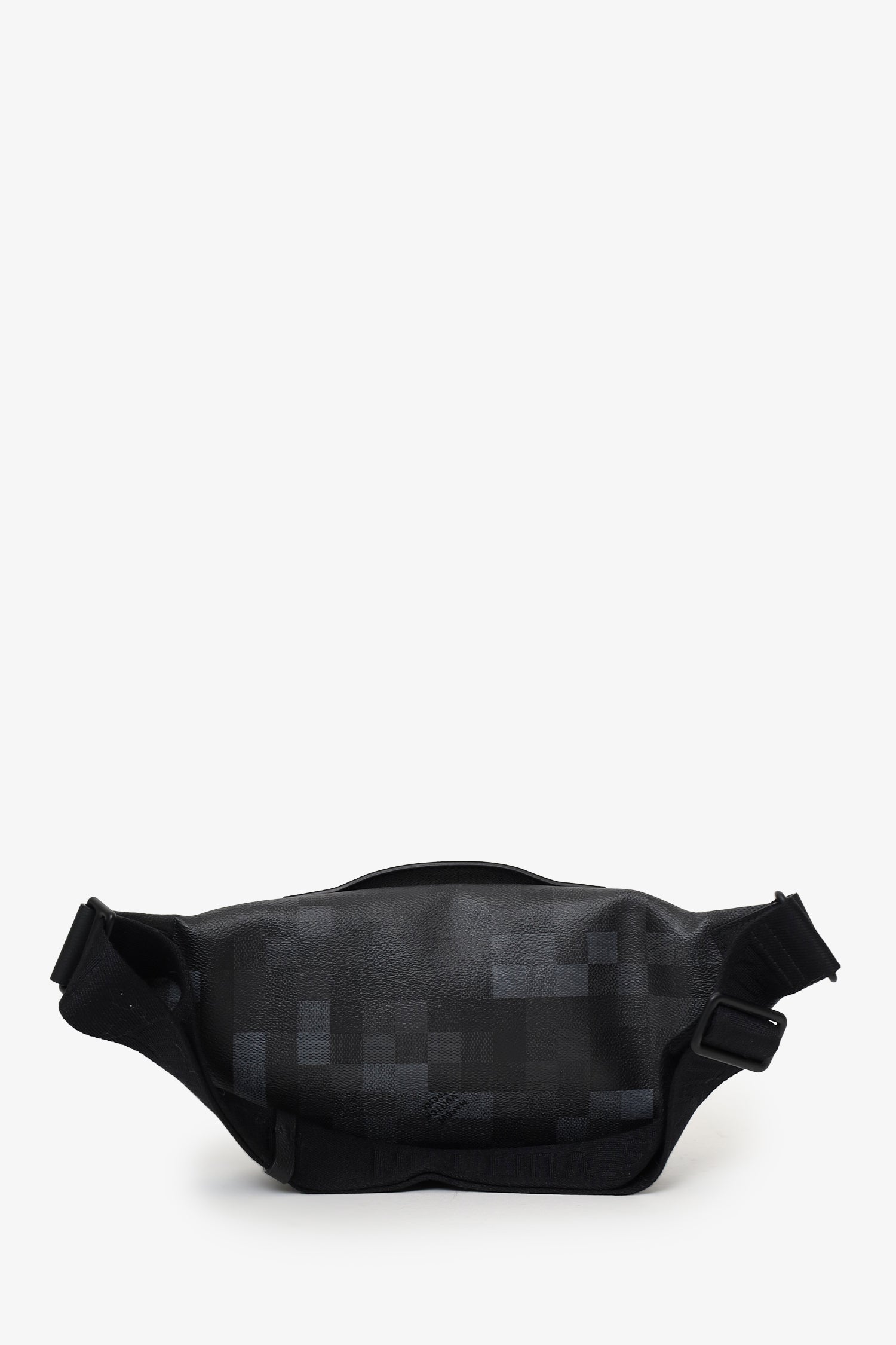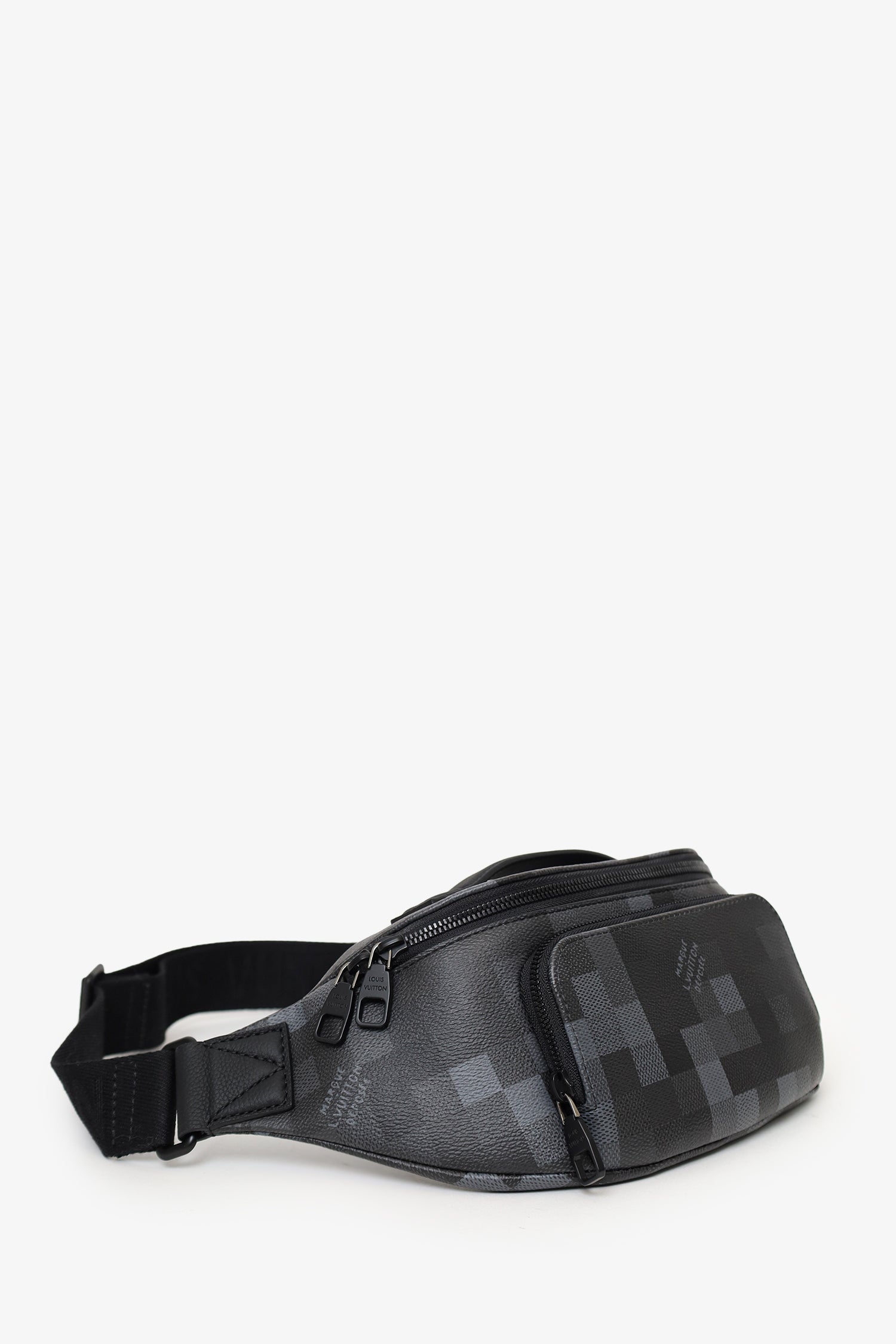 Louis Vuitton 2024 Black Damoflage Rush Bum Bag. Top zip closure. Rear adjustable belt strap with adjustable buckle closure. Exterior zip compartment. Open canvas-lined interior. Tonal stitching.