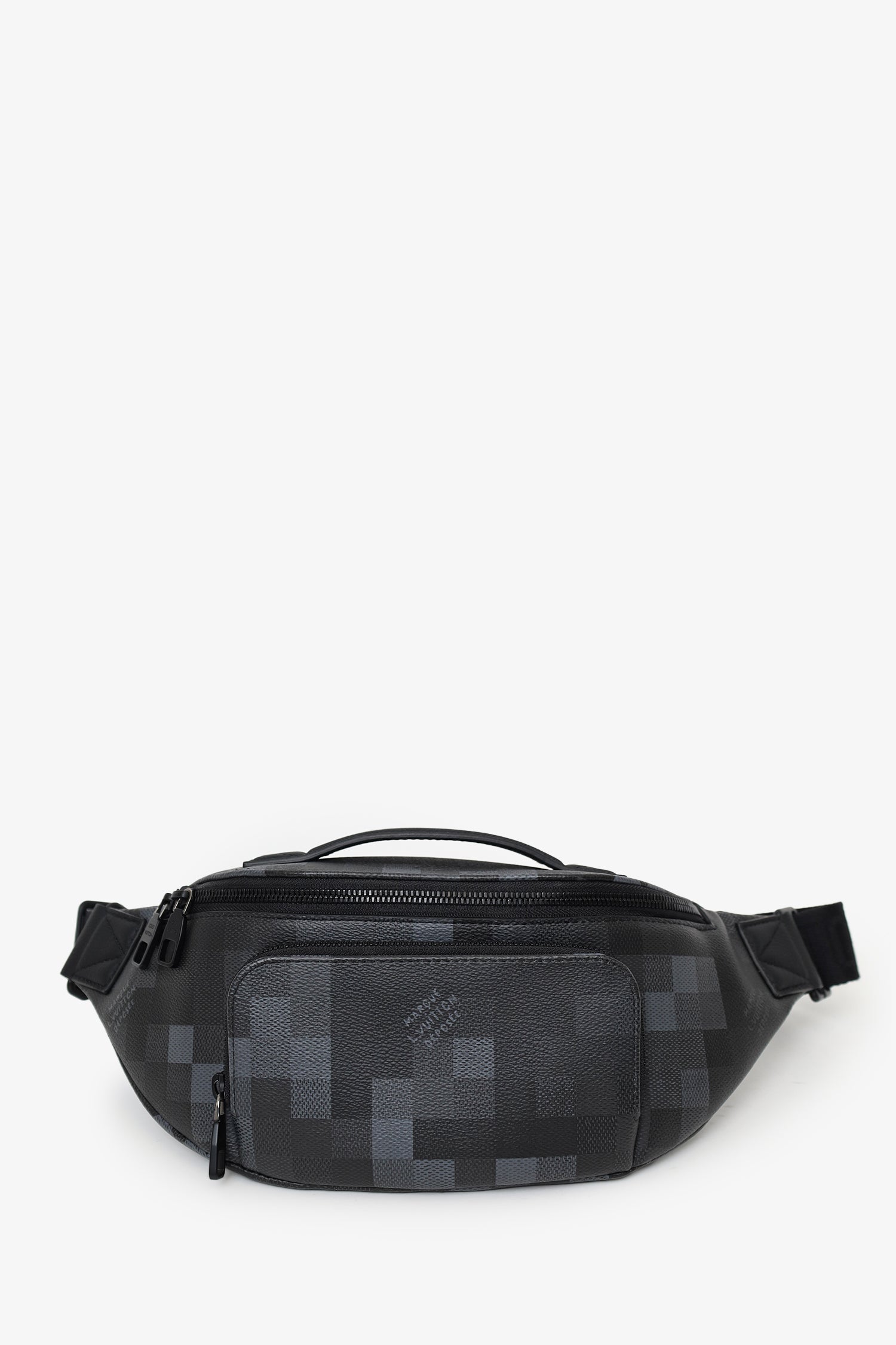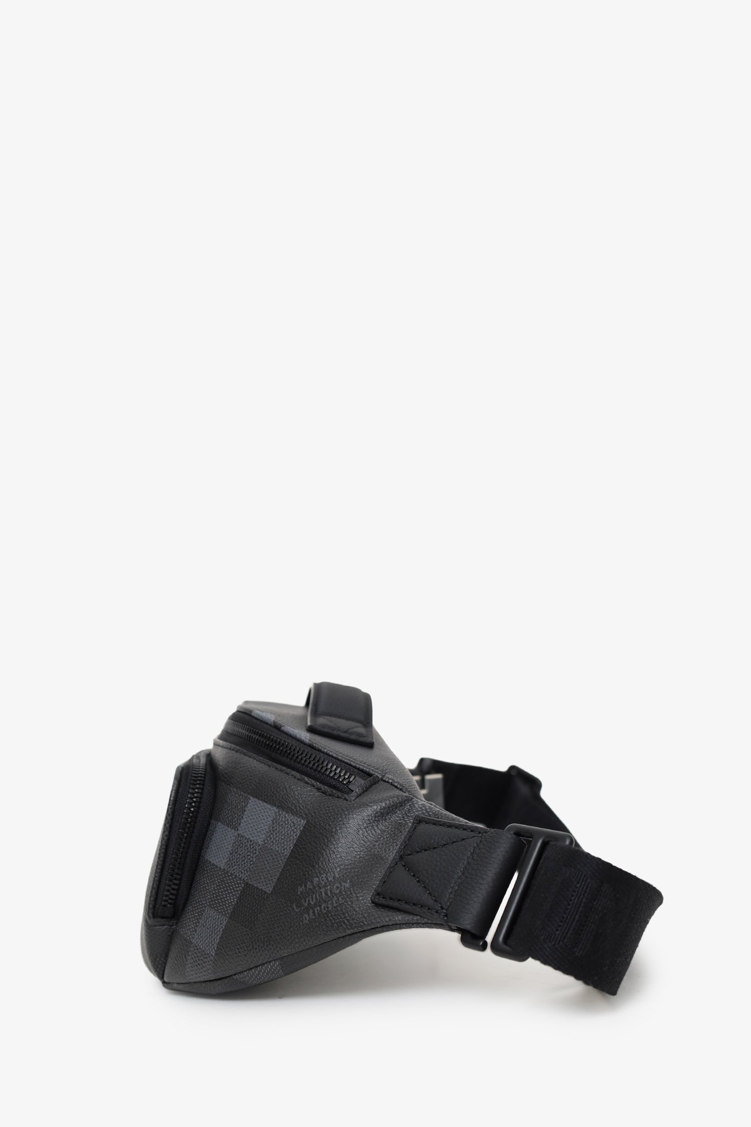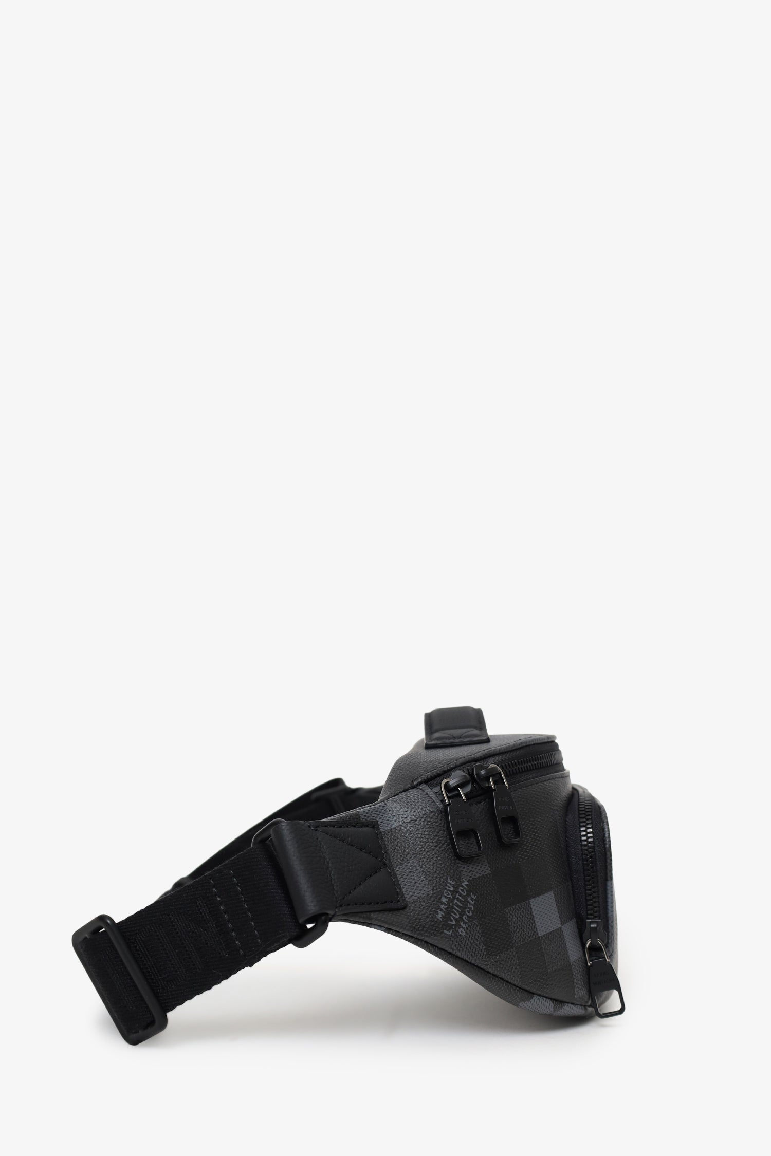 Louis Vuitton 2024 Black Damoflage Rush Bum Bag. Top zip closure. Rear adjustable belt strap with adjustable buckle closure. Exterior zip compartment. Open canvas-lined interior. Tonal stitching.
