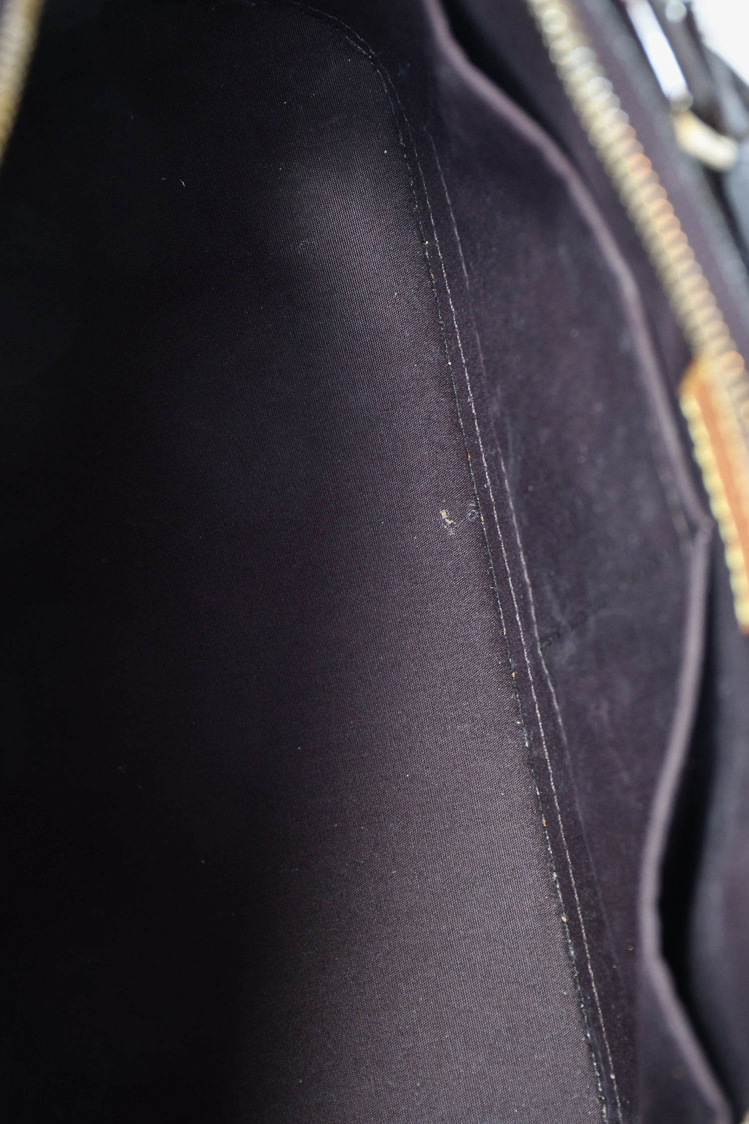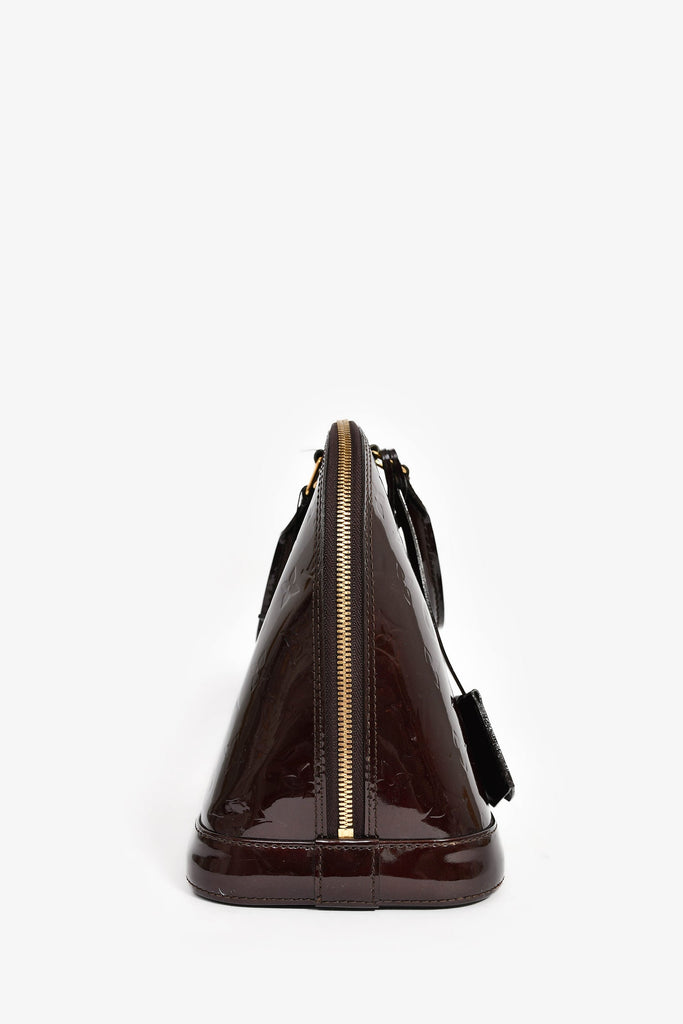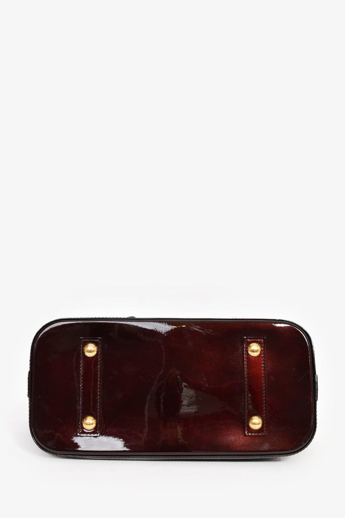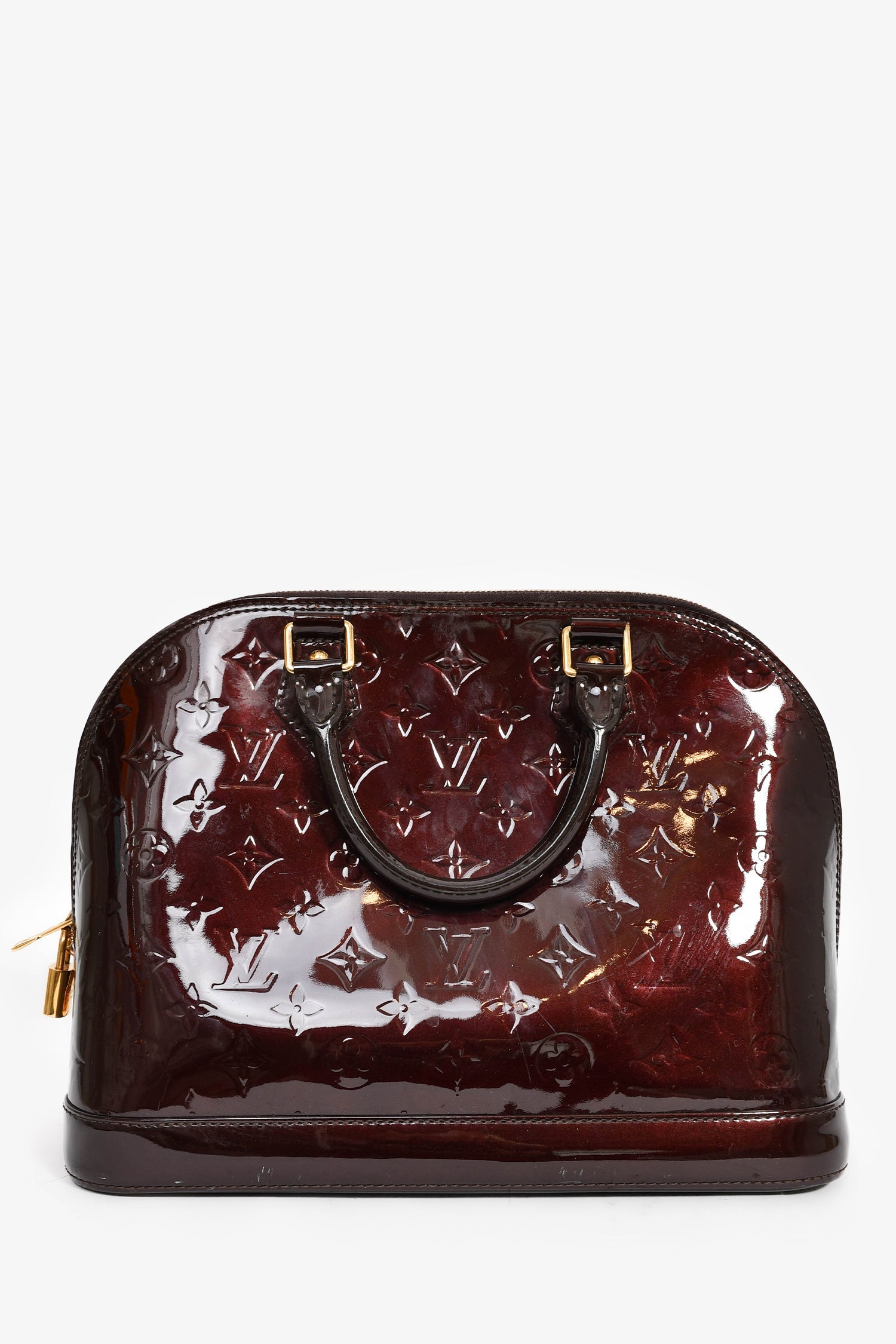 Louis Vuitton Amarante Vernis Leather Monogram 'Alma' Top Handle Bag. Top zip closure. Dual rolled handles. Lined interior. 2 interior wall slip pockets. Detachable clochette. Glossy finish. Gold-tone hardware. Tonal stitching.