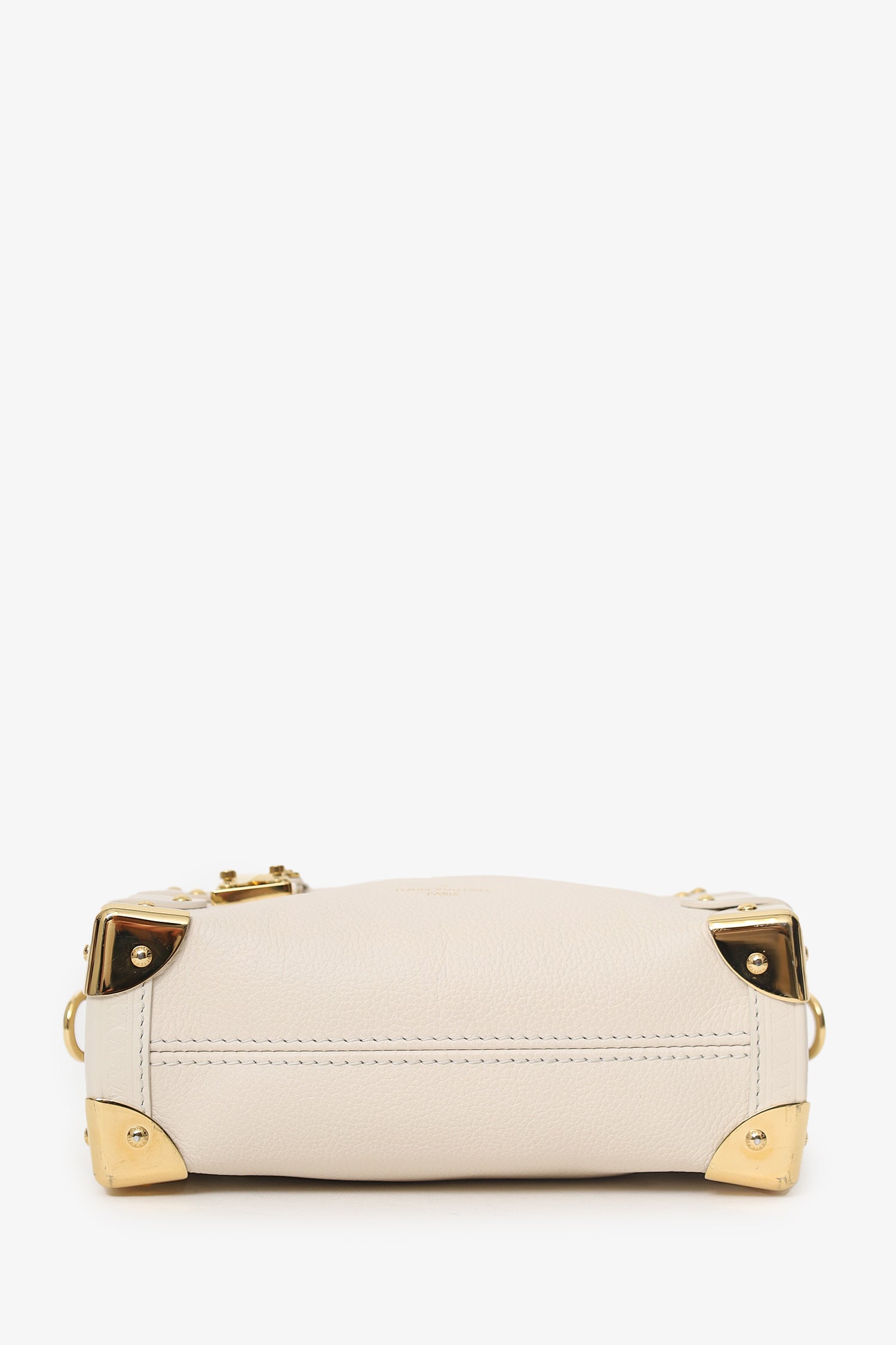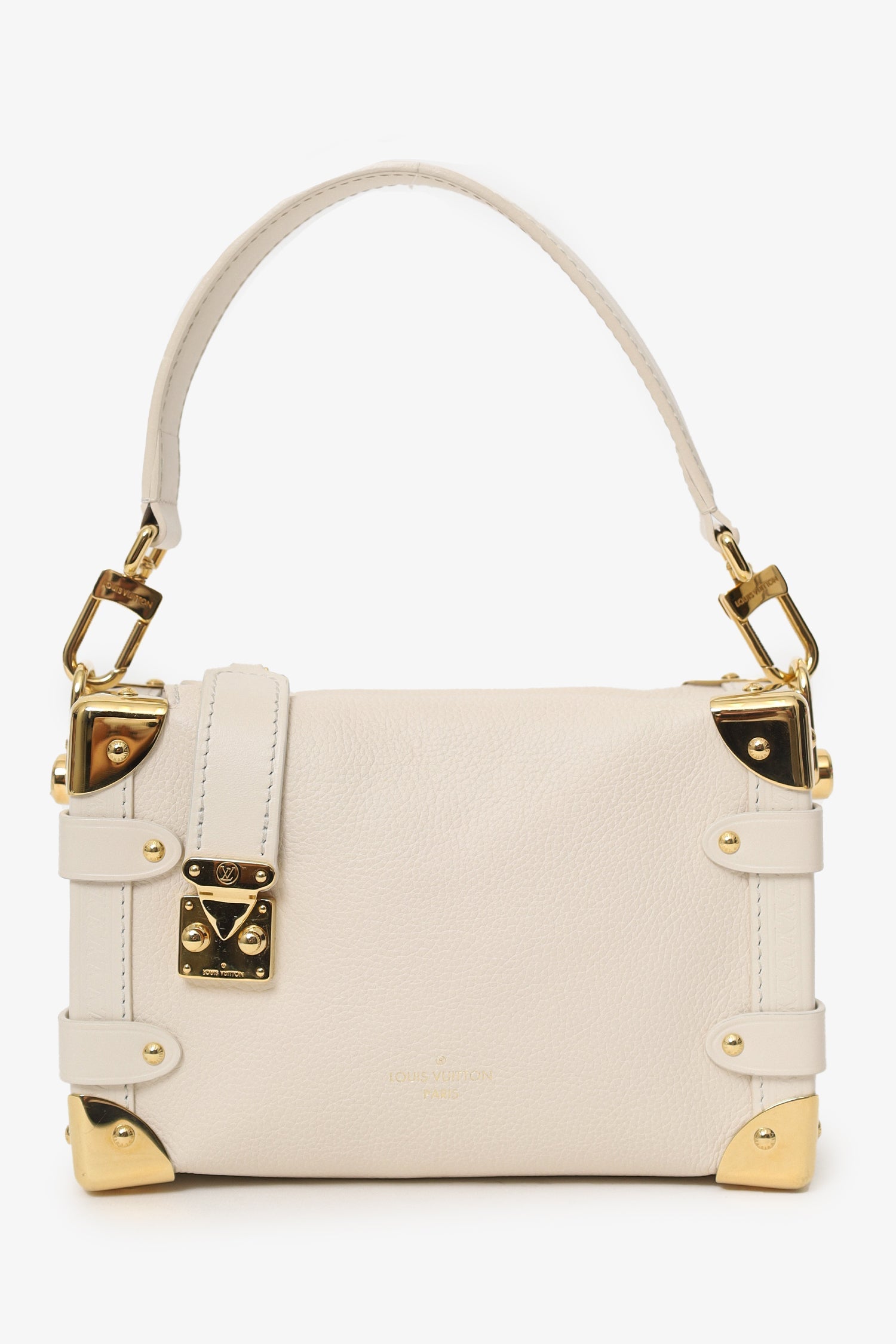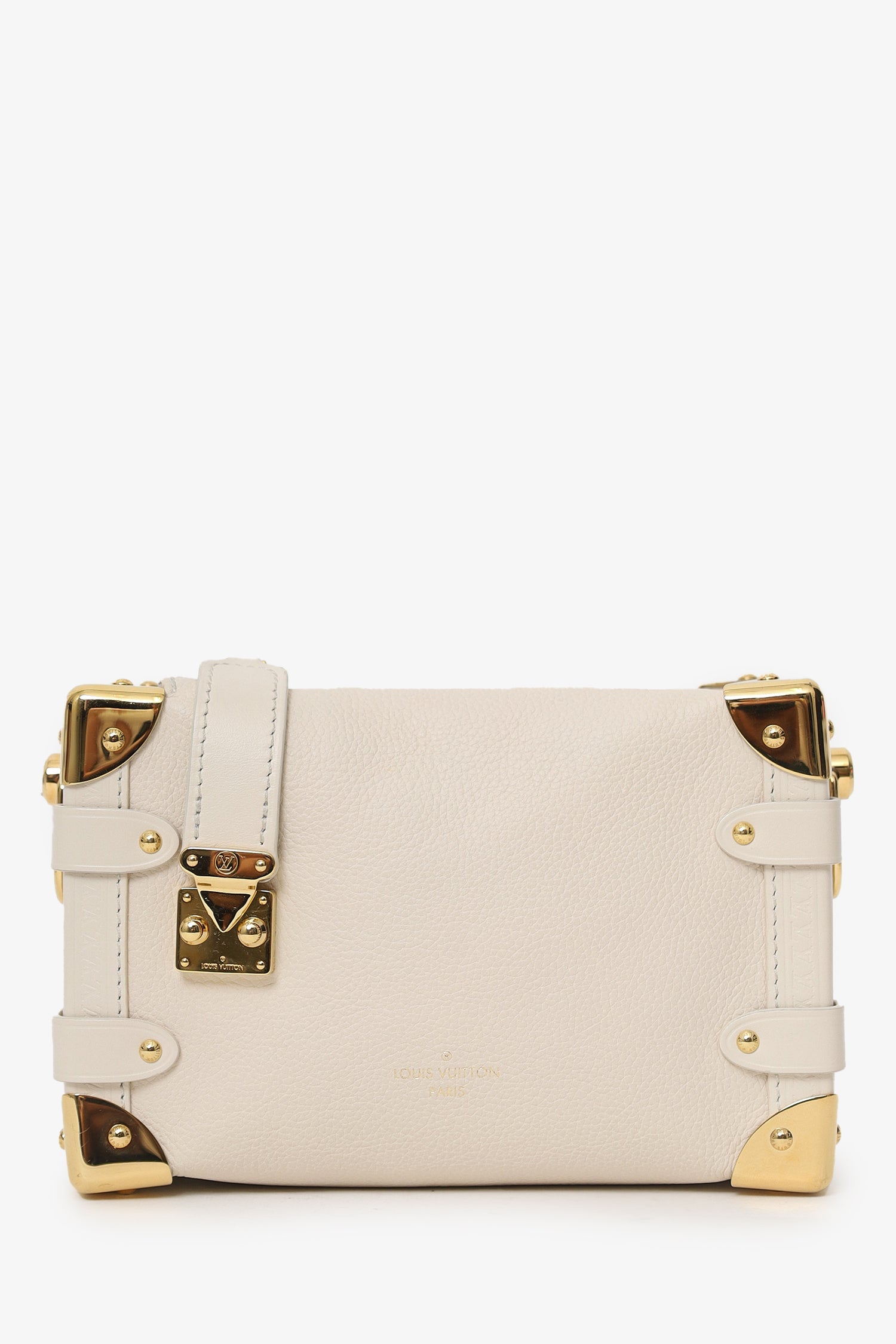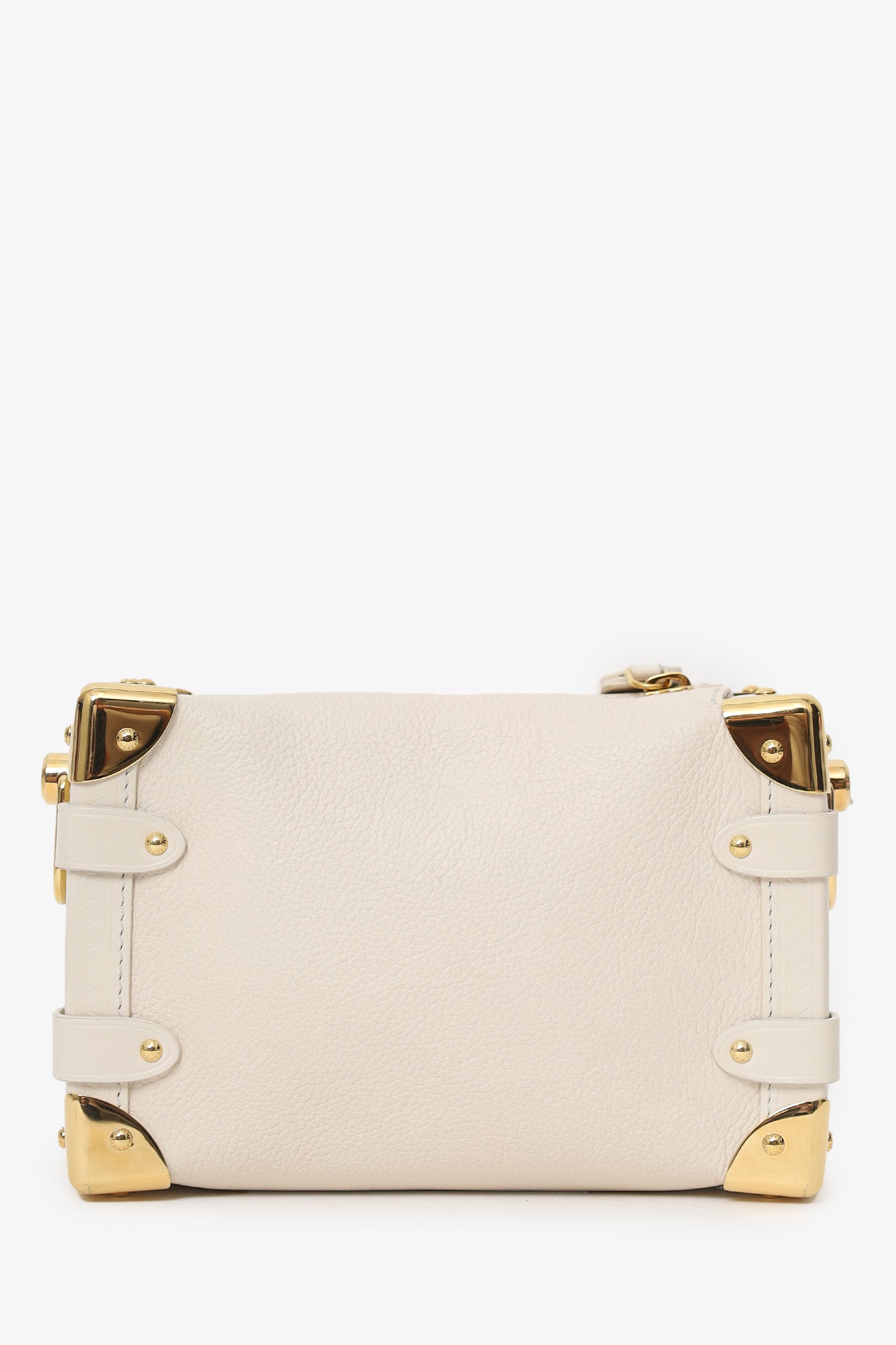 Louis Vuitton Beige Leather Side Trunk PM. Top zip-up closure with push-lock closure. Removable top handle with clasp closure. Adjustable and removable shoulder strap with clasp closure. Lined interior. Gold-tone hardware. Tonal stitching.