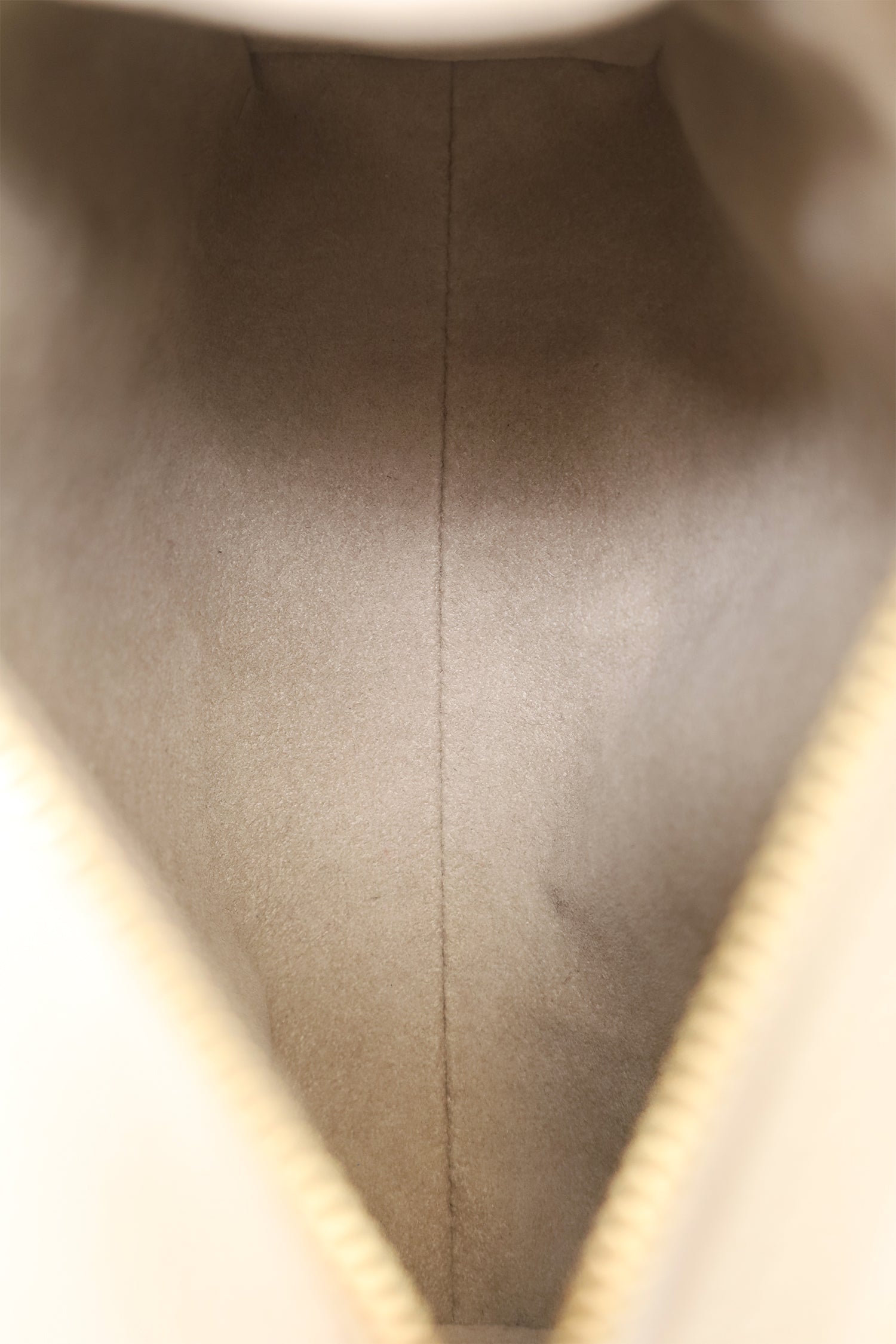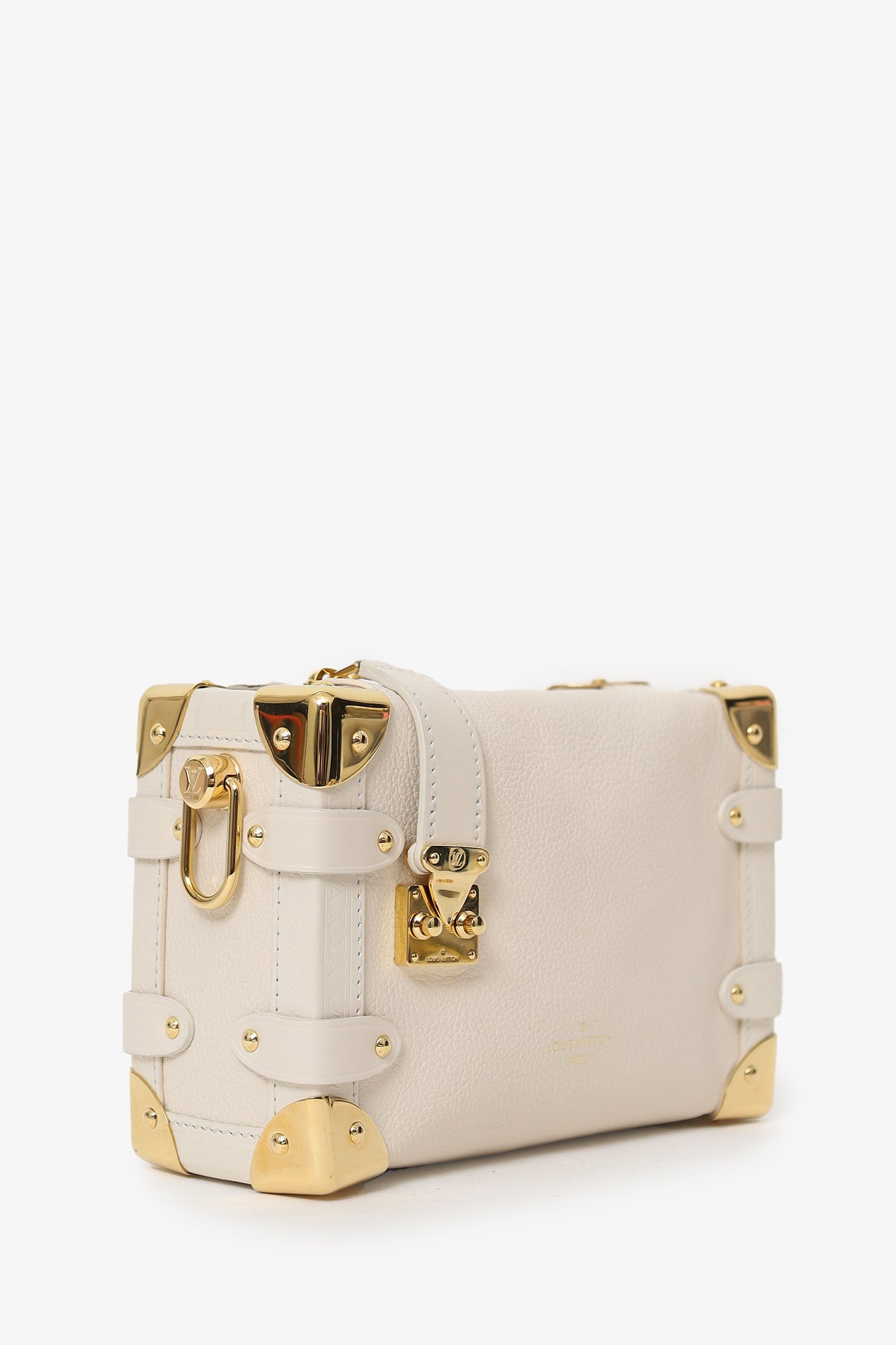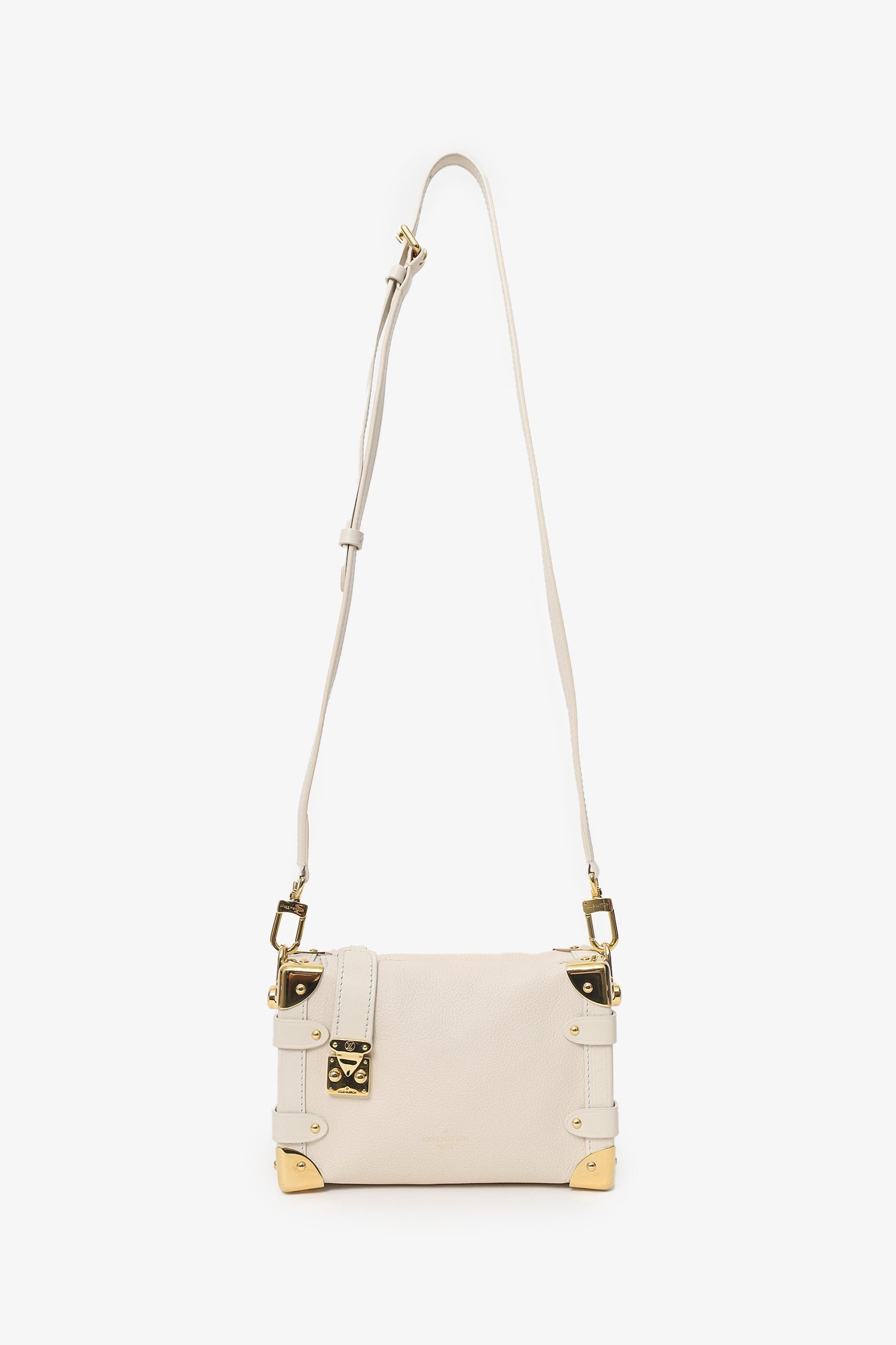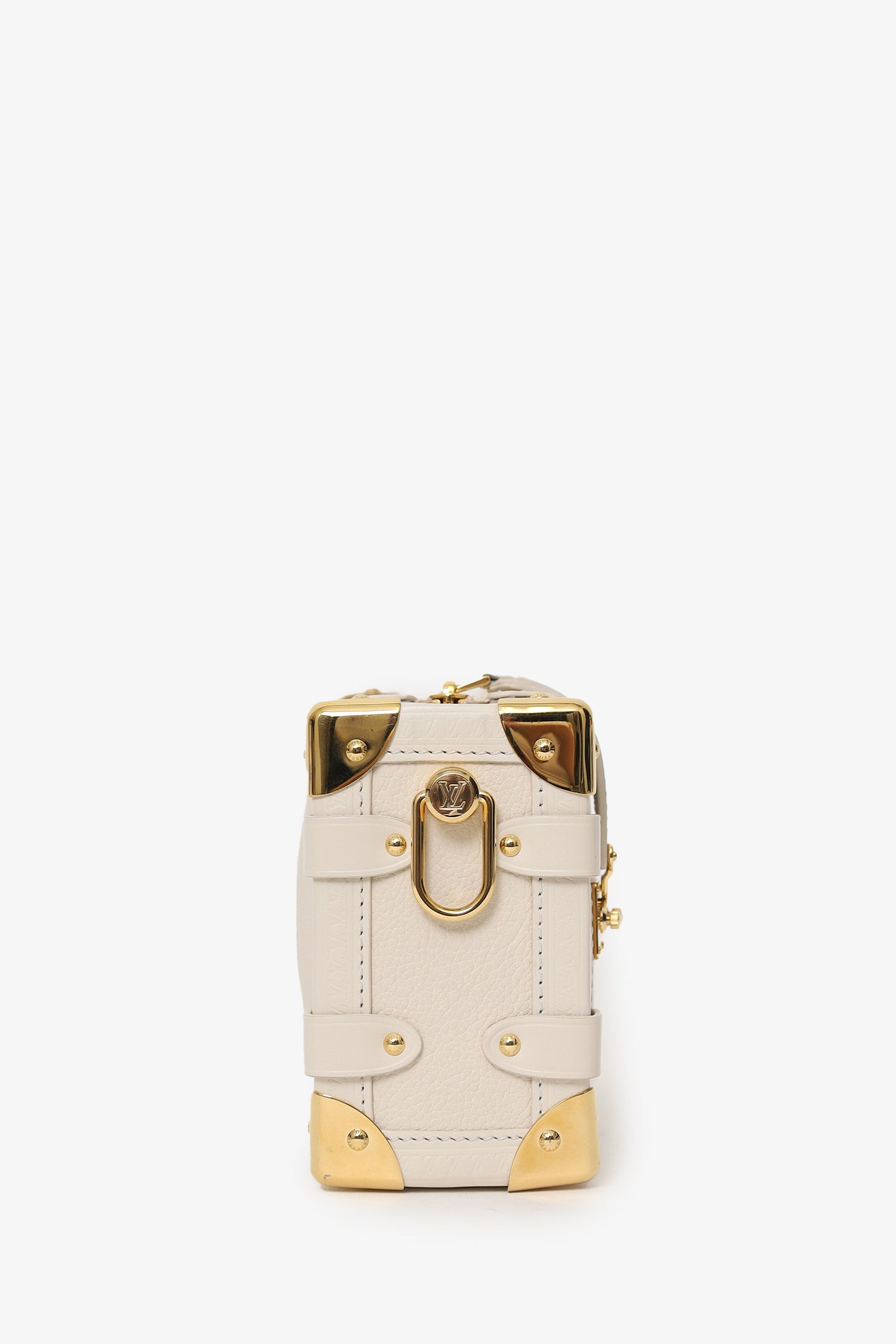 Louis Vuitton Beige Leather Side Trunk PM. Top zip-up closure with push-lock closure. Removable top handle with clasp closure. Adjustable and removable shoulder strap with clasp closure. Lined interior. Gold-tone hardware. Tonal stitching.