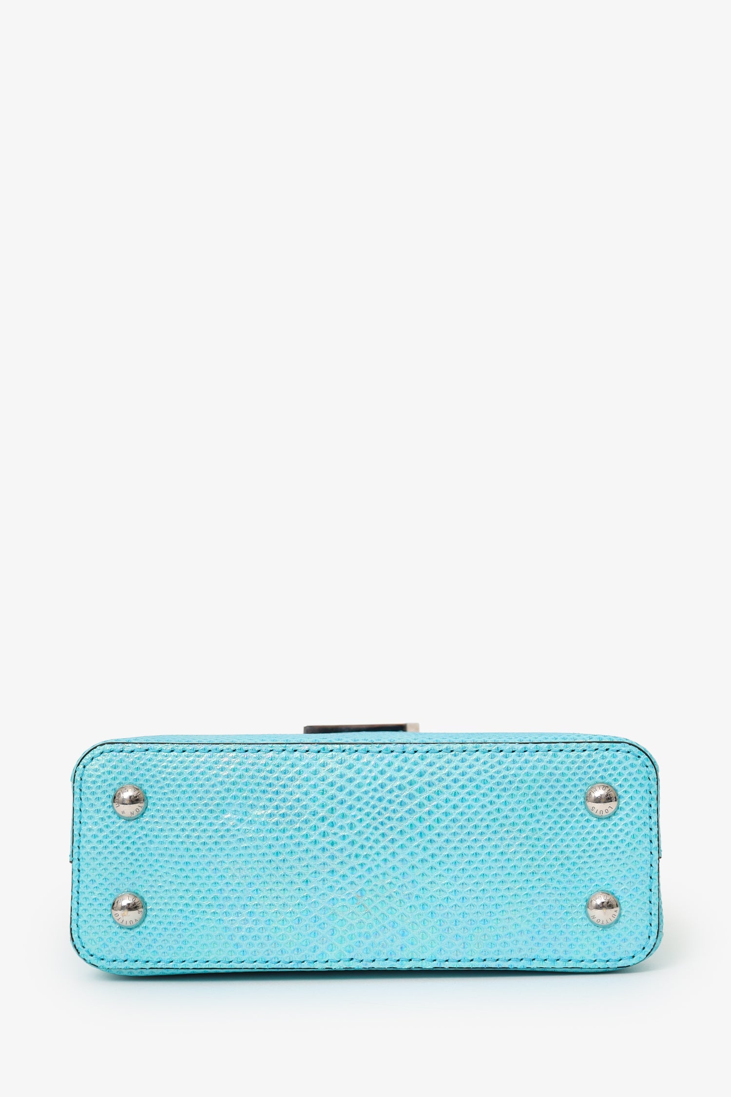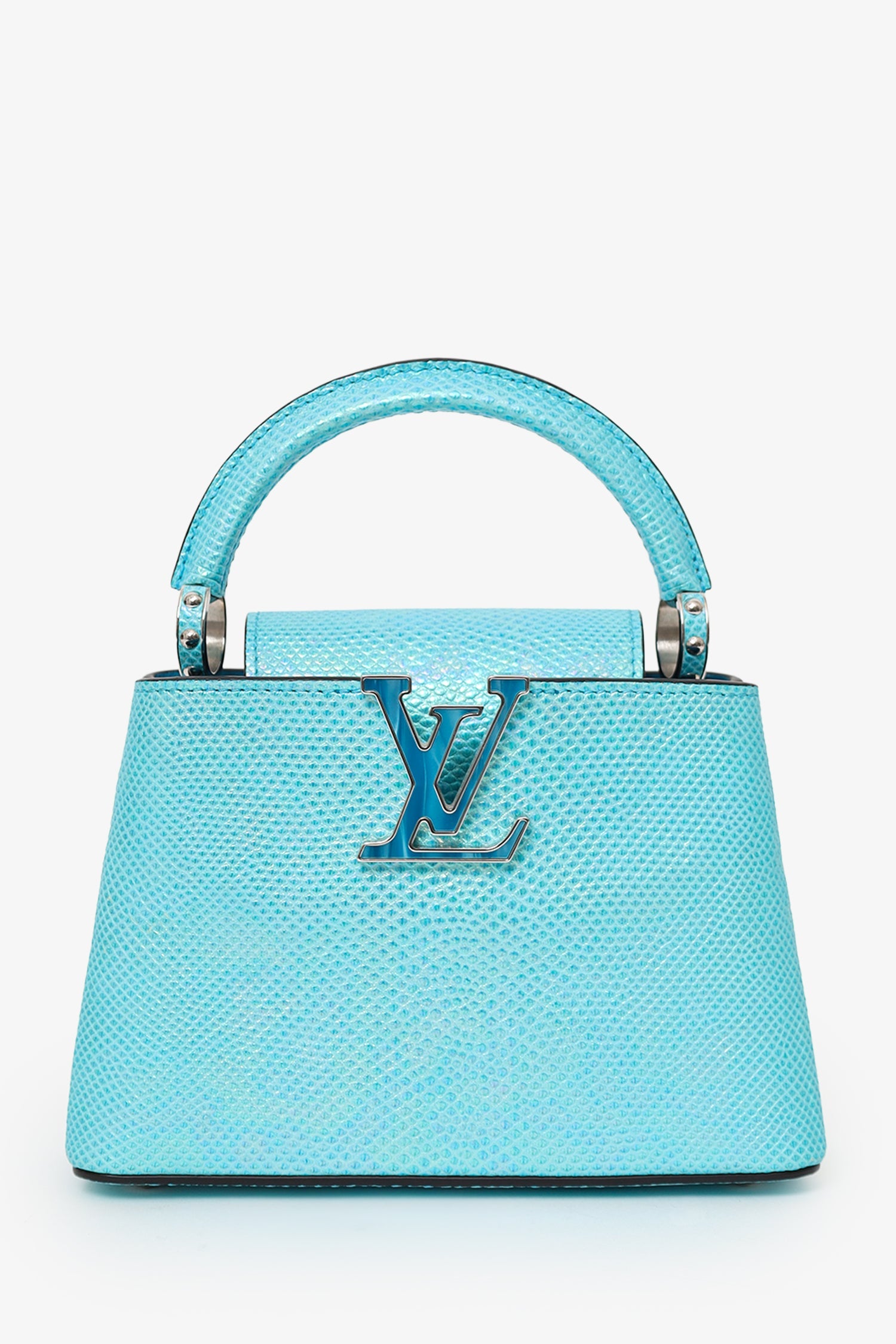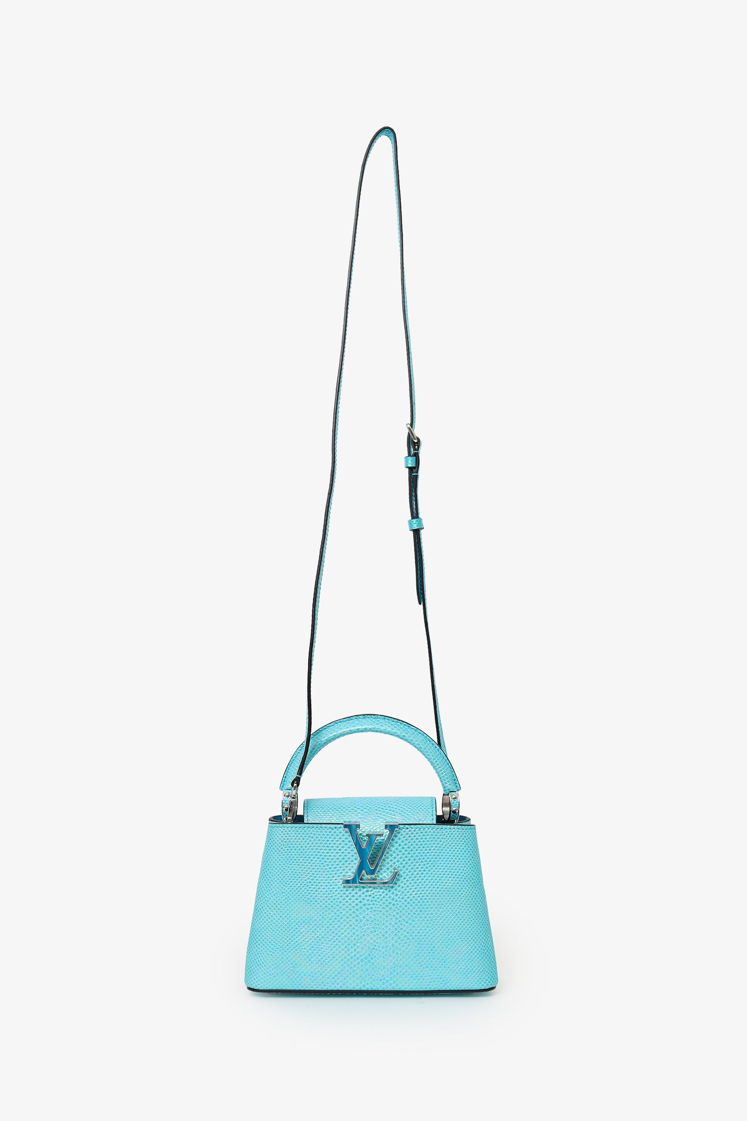 Louis Vuitton Blue Metallic Python Leather Mini Capucines with Strap. Front-fold-over-flap. Top handle. Removable and adjustable crossbody strap with clasp closure. Protective base studs. Lined interior with 2 large open pockets and 1 rear slip pocket. Silver-tone hardware. Tonal stitching.