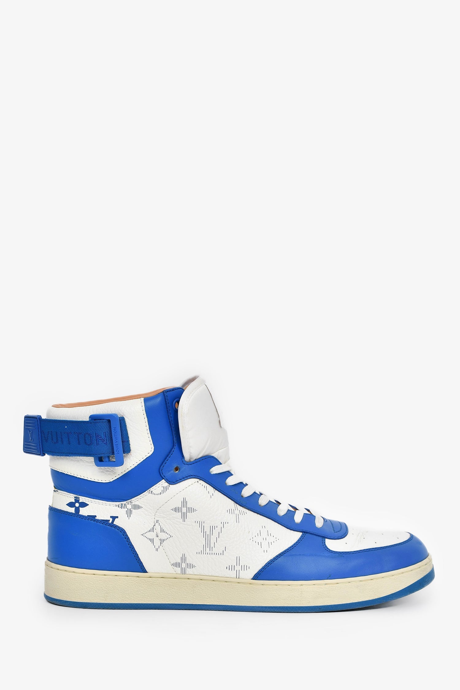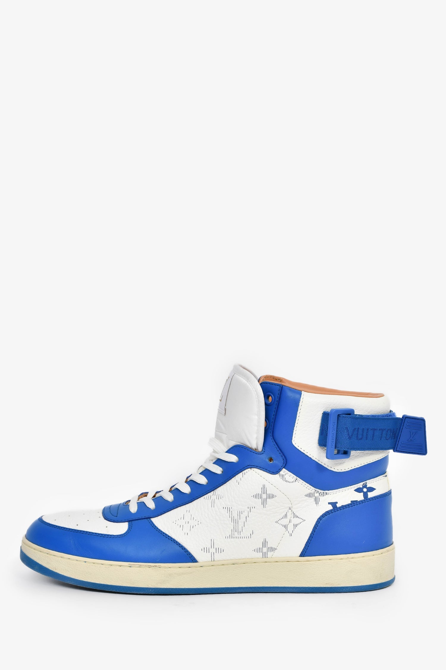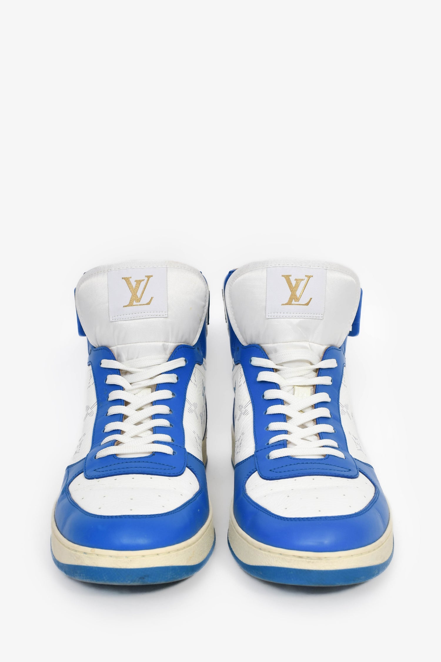 Louis Vuitton Blue/White Leather High Top Sneakers. Round-toe. Lace closures. Rubber soles. Leather interior. Tonal stitching.