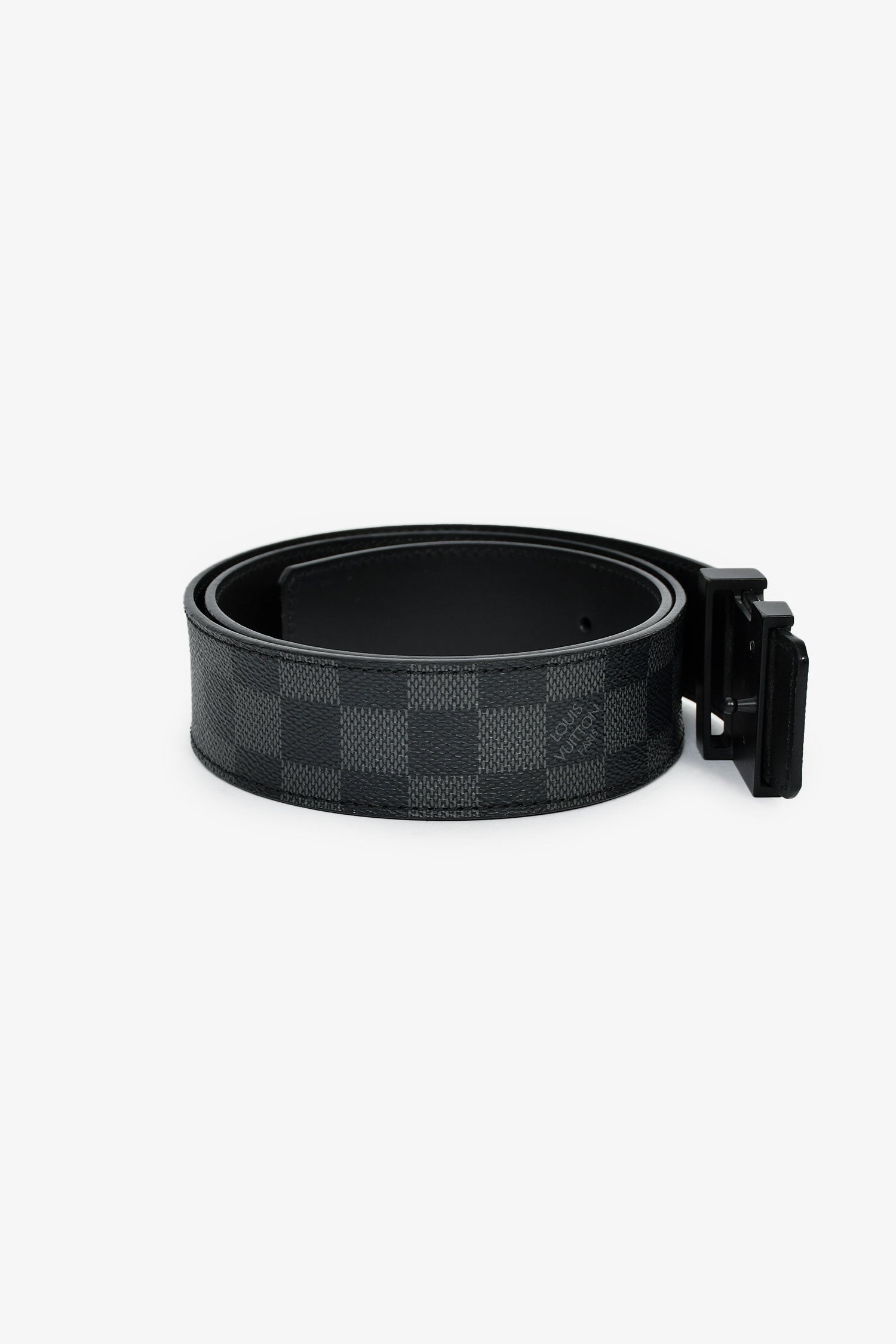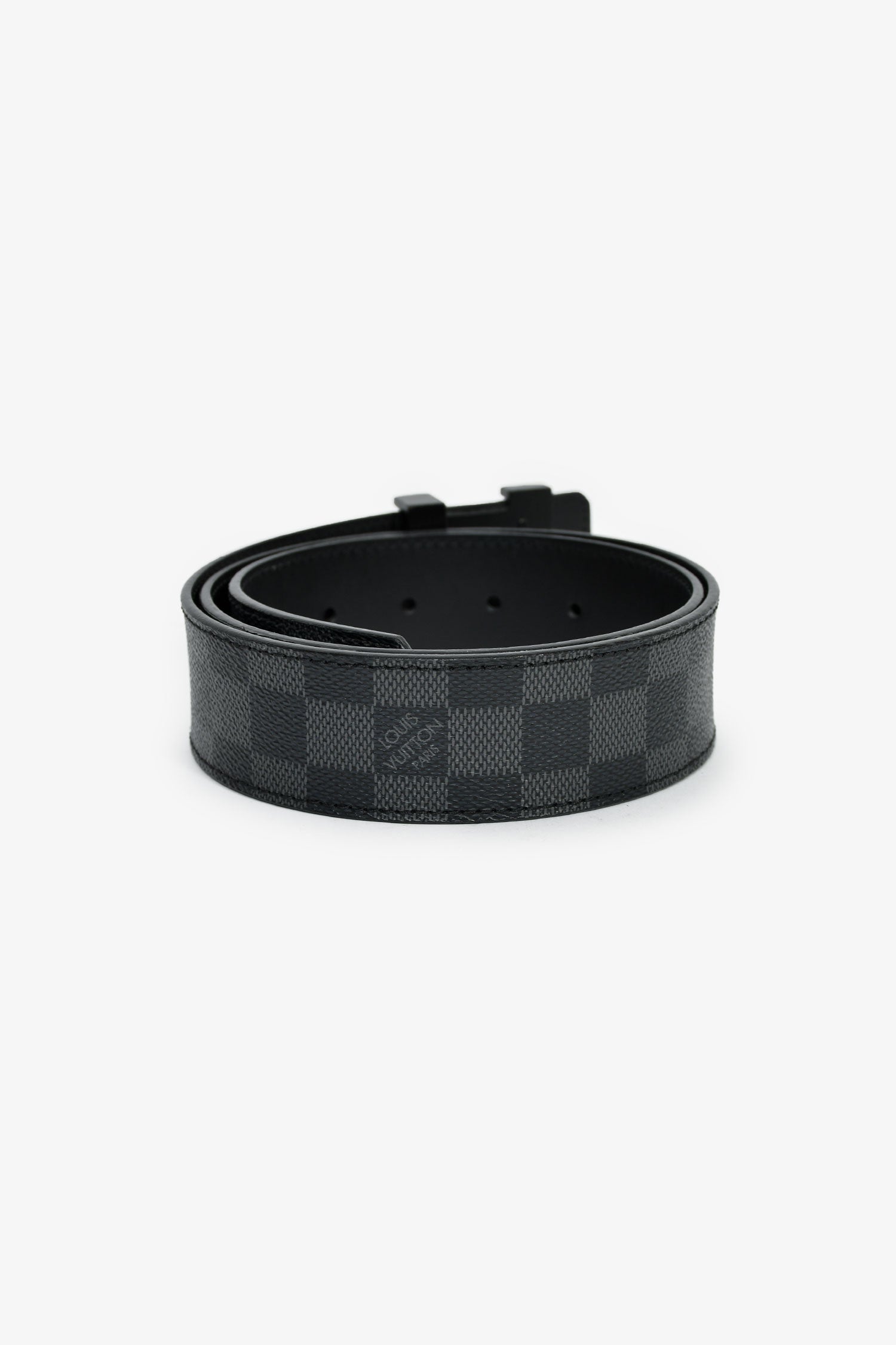 Louis Vuitton Damier Graphite LV Initiales Belt. Adjustable push-pin closure. Black-tone hardware. Tonal stitching.