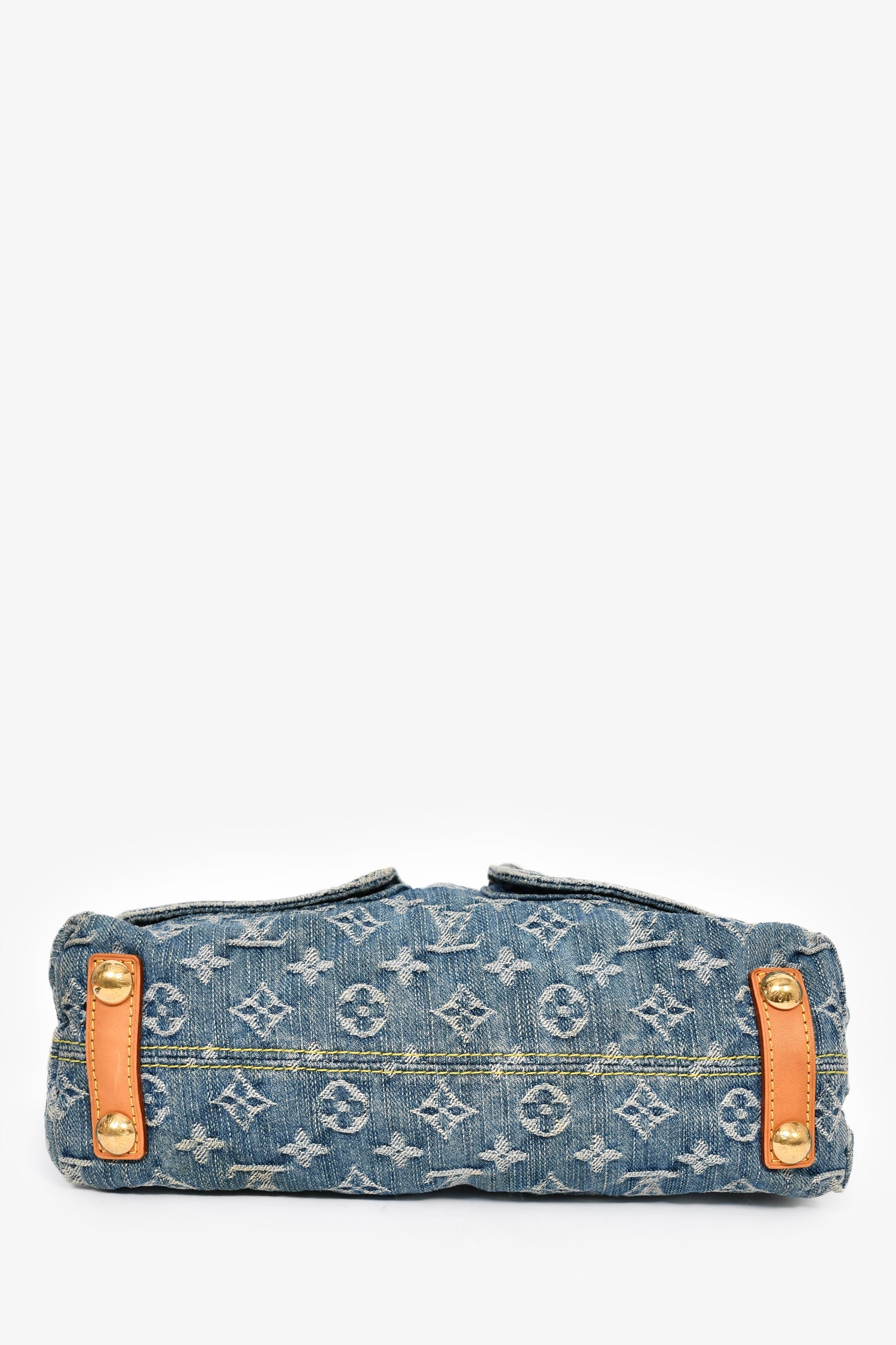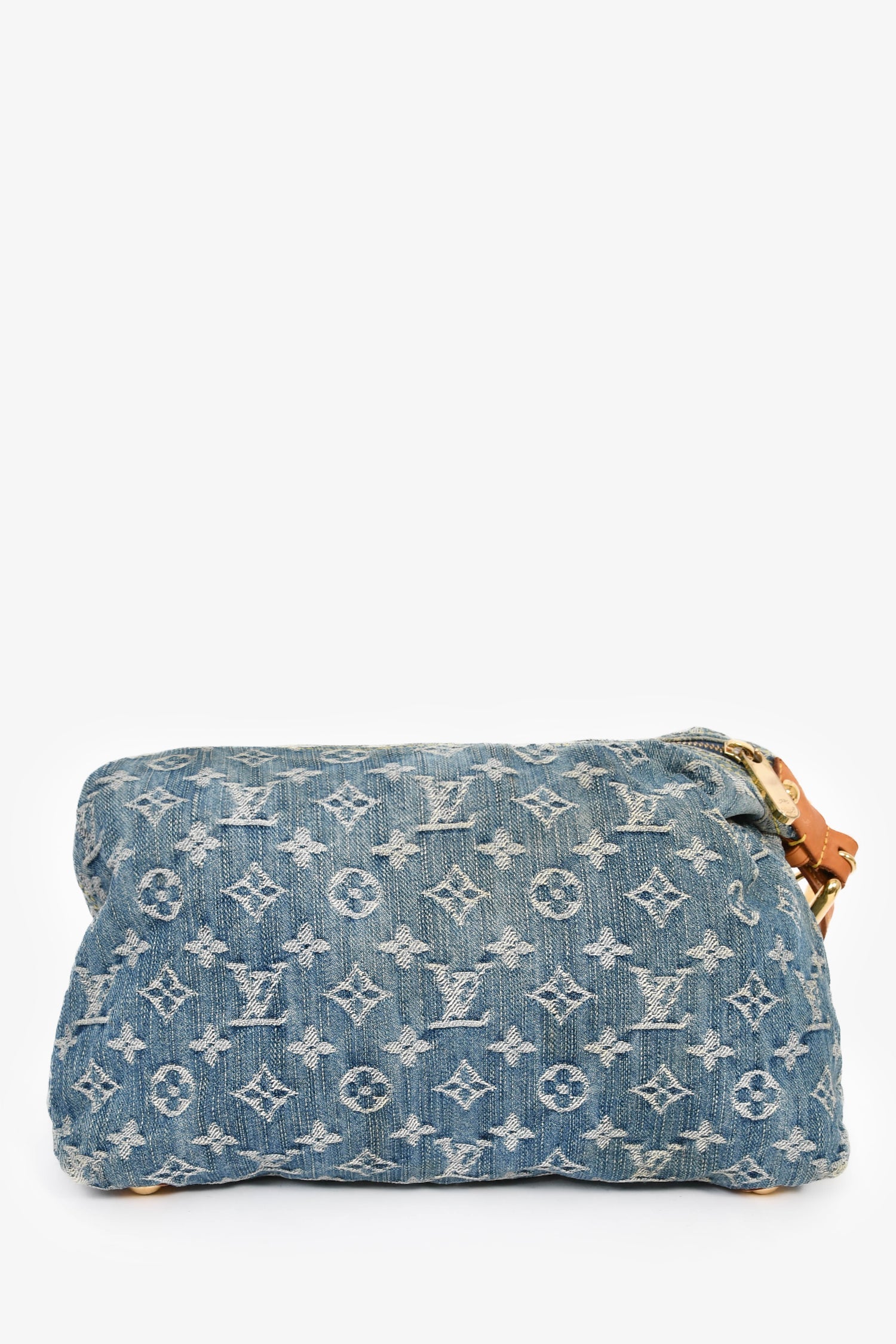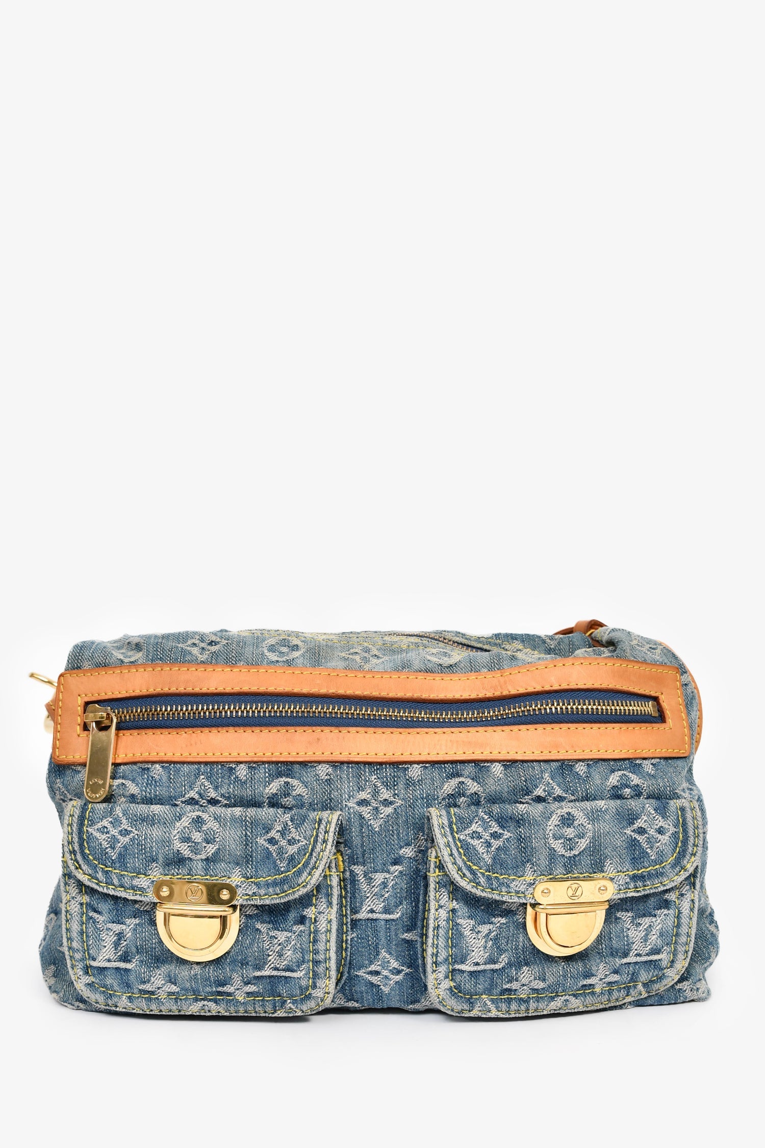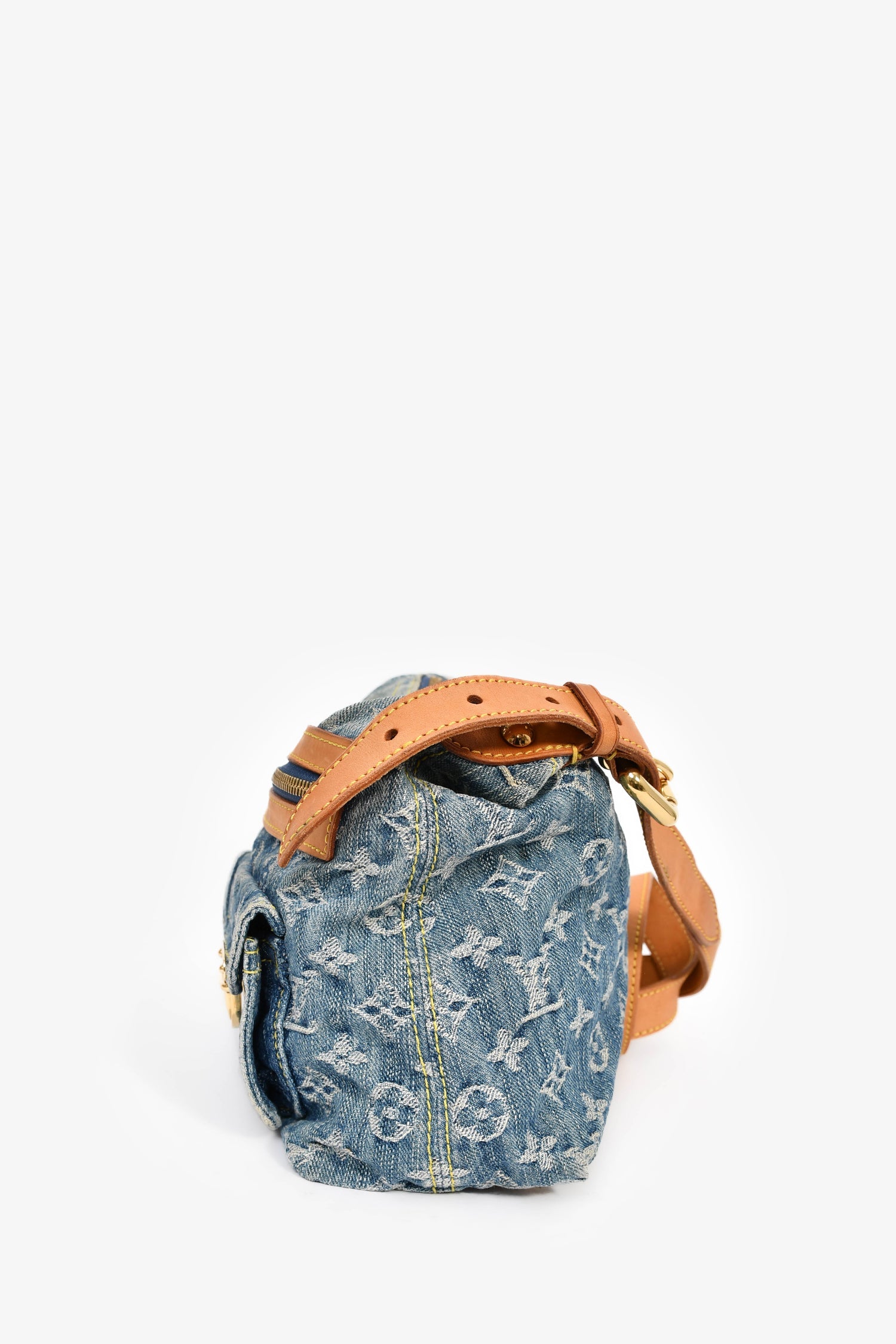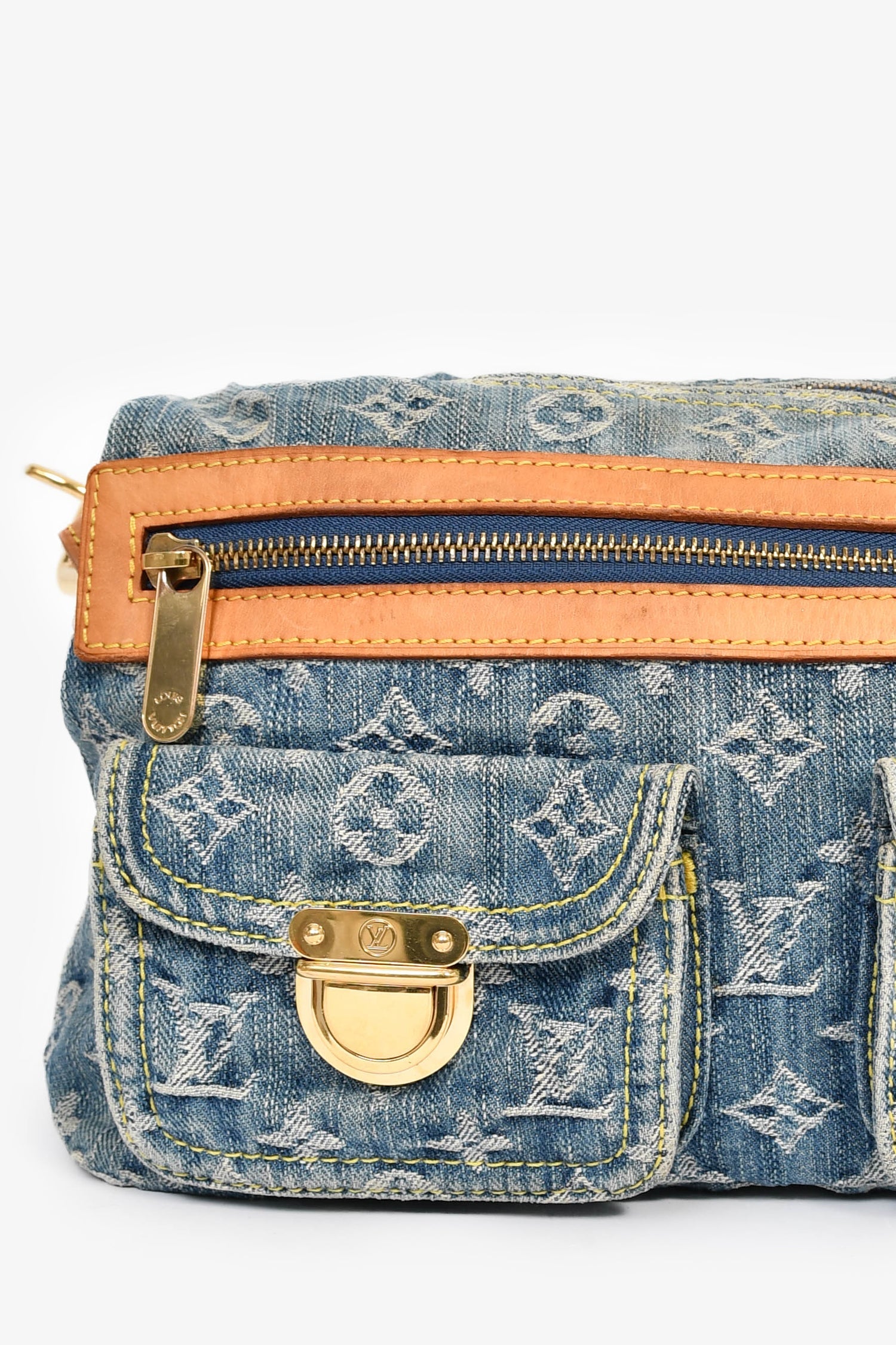 Louis Vuitton Denim Baggy PM Crossbody Bag. Double zip openings. Adjustable crossbody strap. 2 exterior compartments. Suede-lined interior with 1 slip compartment. Comes with additional strap. Gold-tone hardware. Contrast stitching.