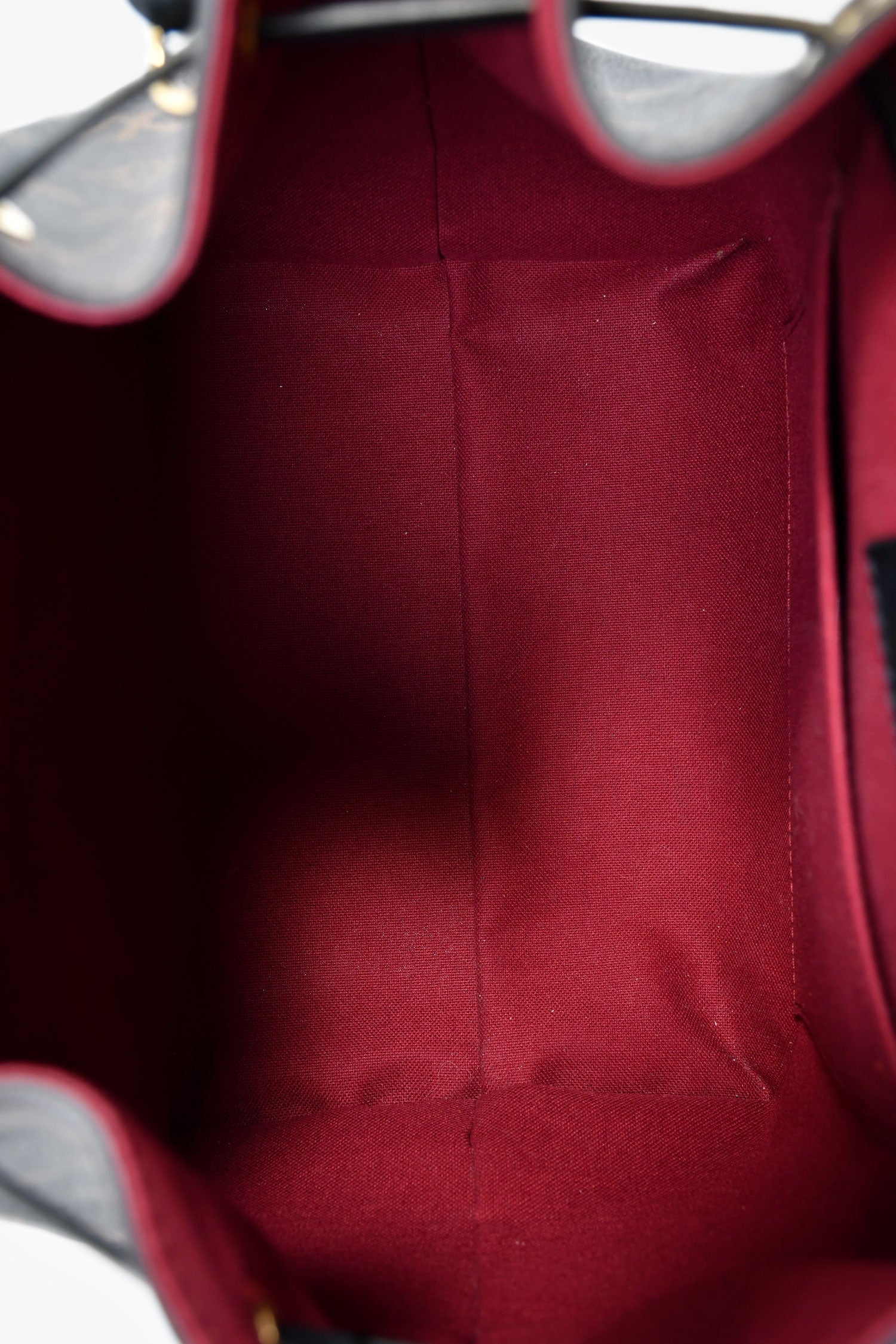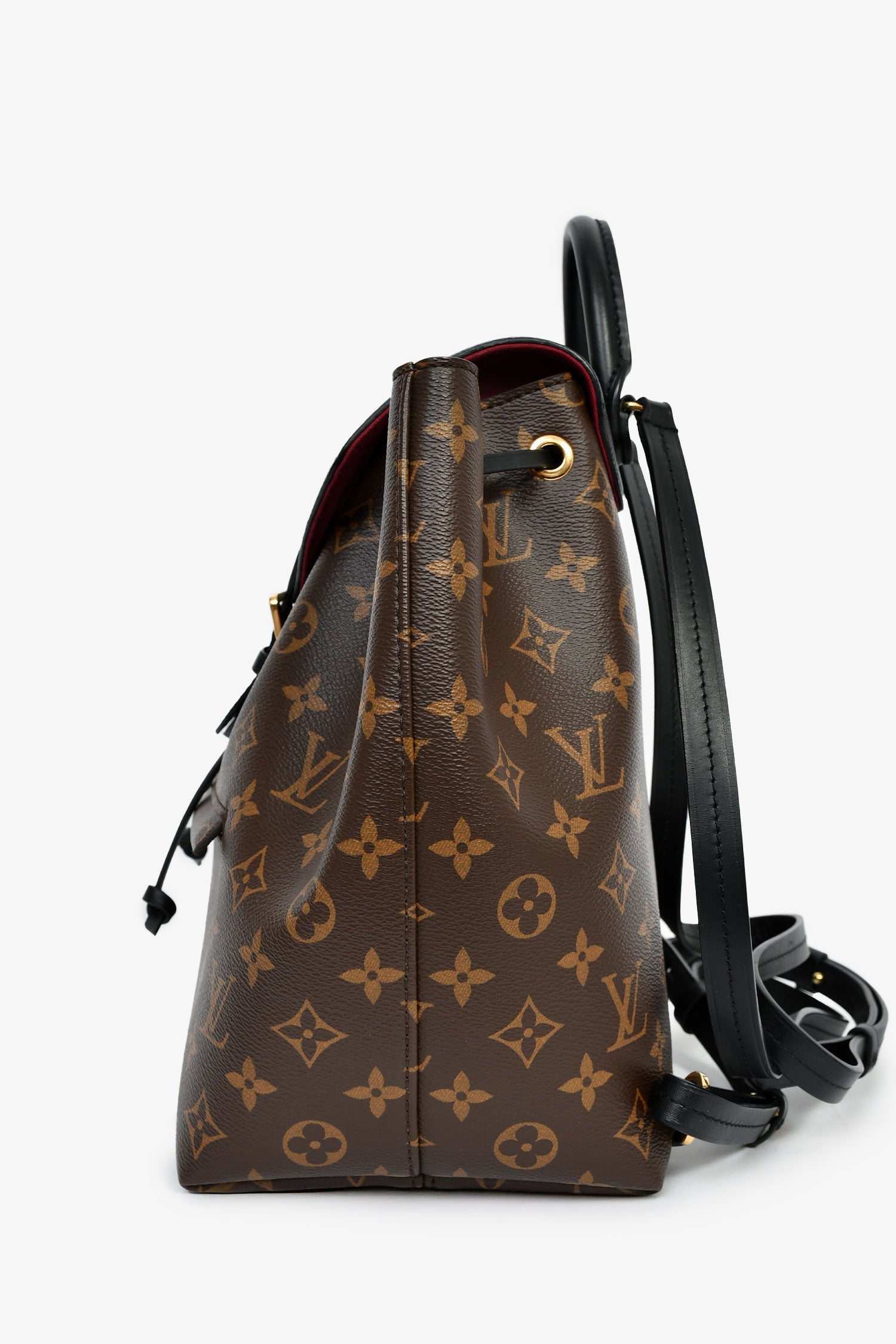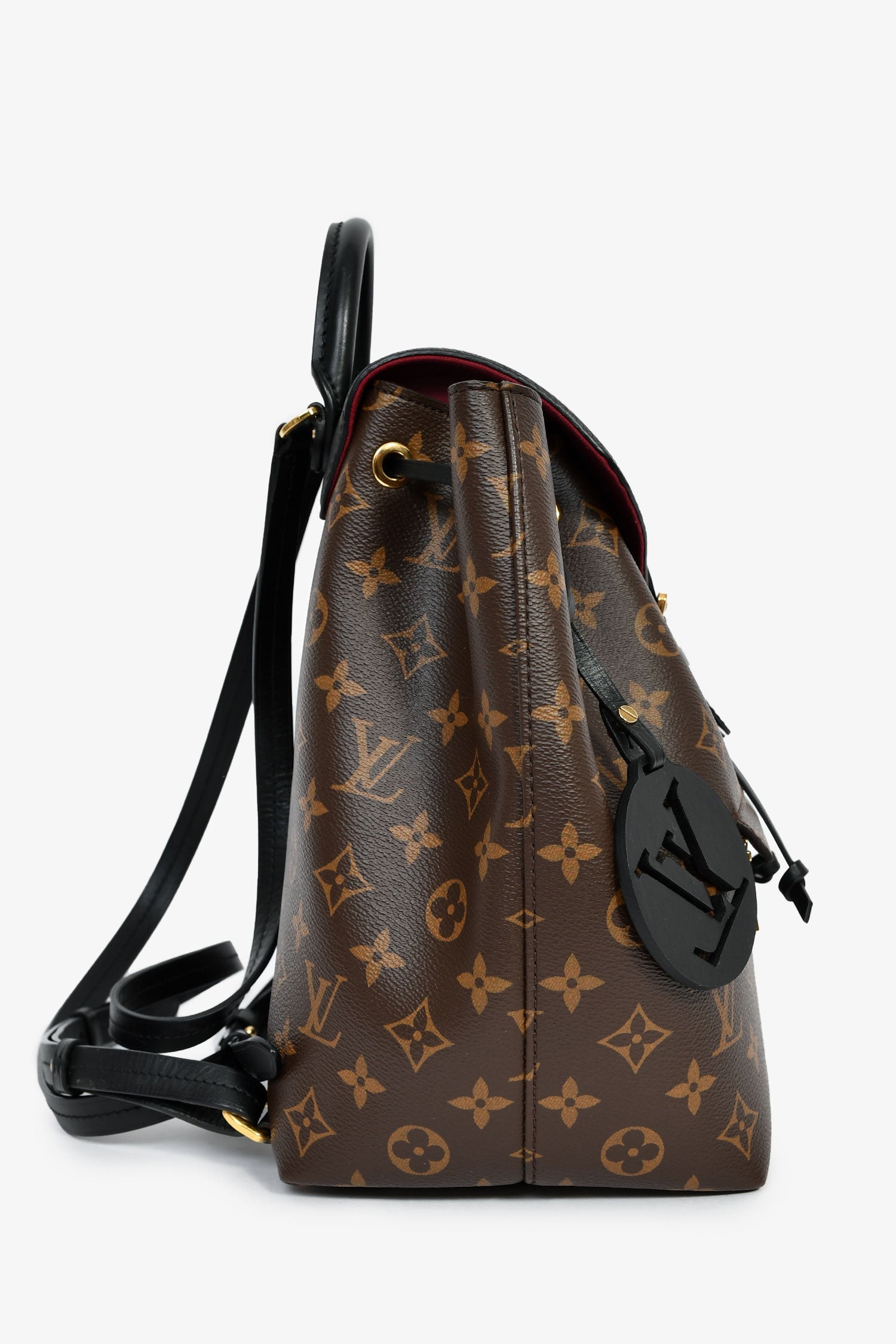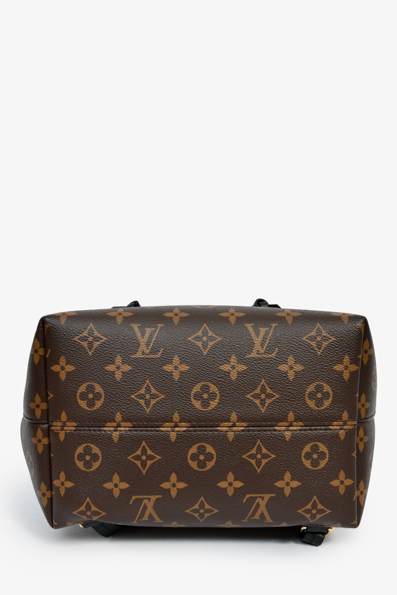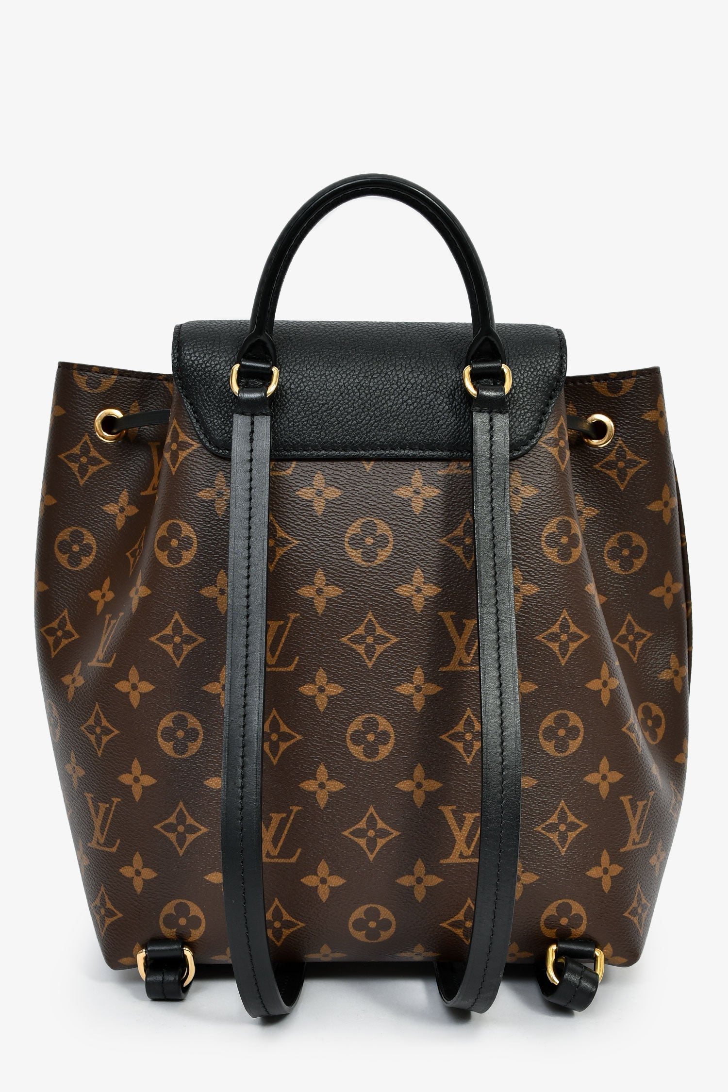 Louis Vuitton Monogram/Black Leather Montsouris PM Backpack. Front fold-over flap with magnetic button closure and strap + buckle detail. Top handle. Adjustable straps. Single front zip pocket. Lined interior. Single interior wall slip pocket. Detachable "LV" initial charm. Gold-tone hardware. Tonal stitching.