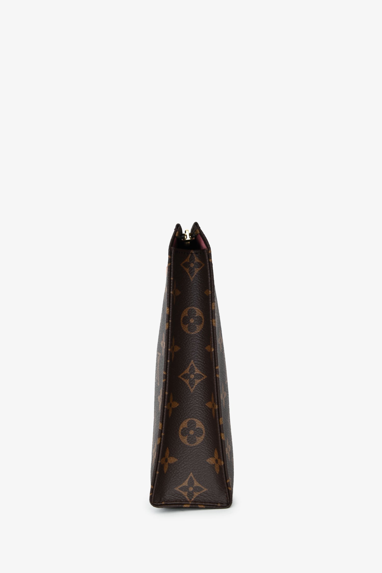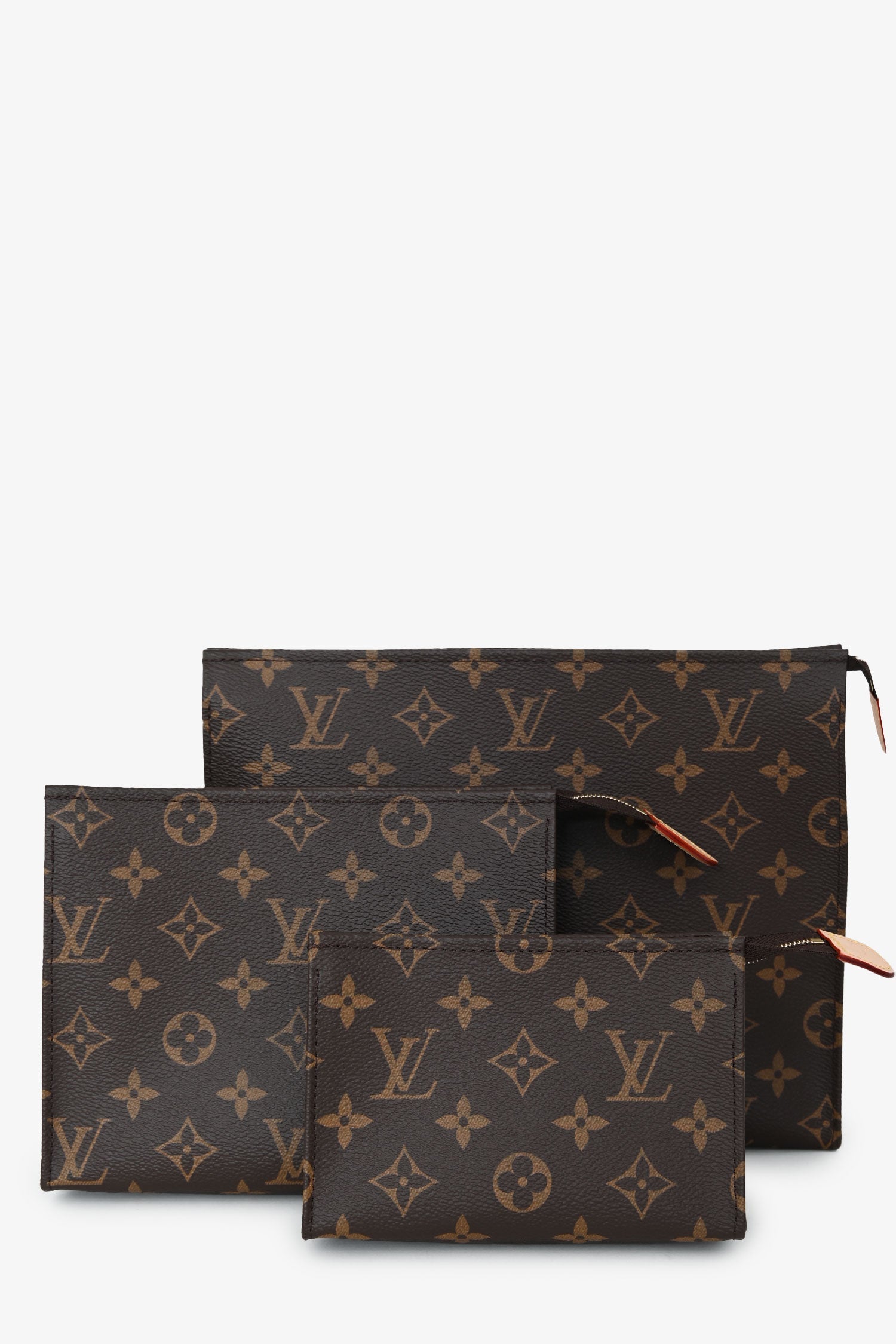 Louis Vuitton Monogram Coated Canvas Trio Toilet Pouch. Top zip closures. Open interiors. Gold-tone hardware. Tonal stitching.
