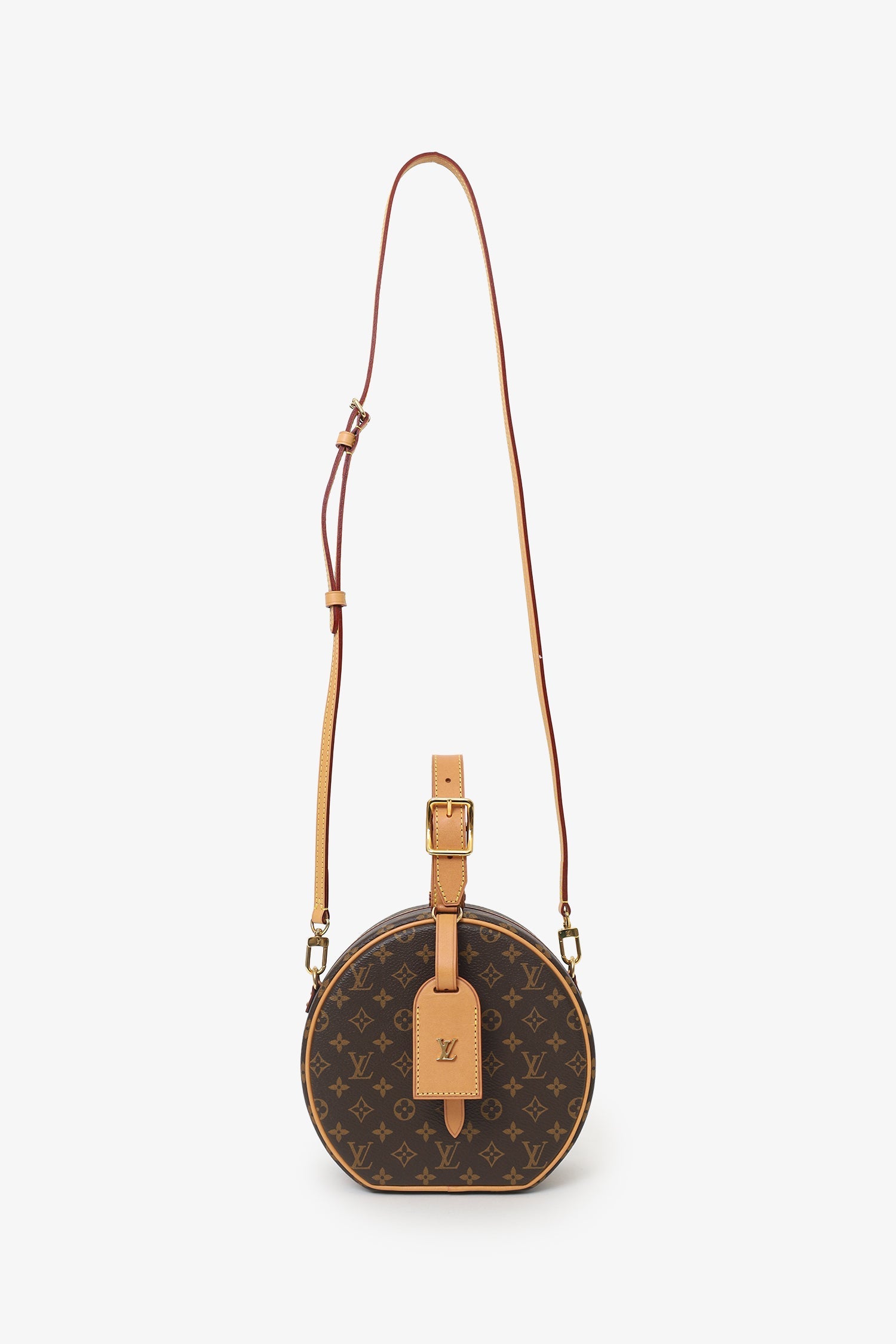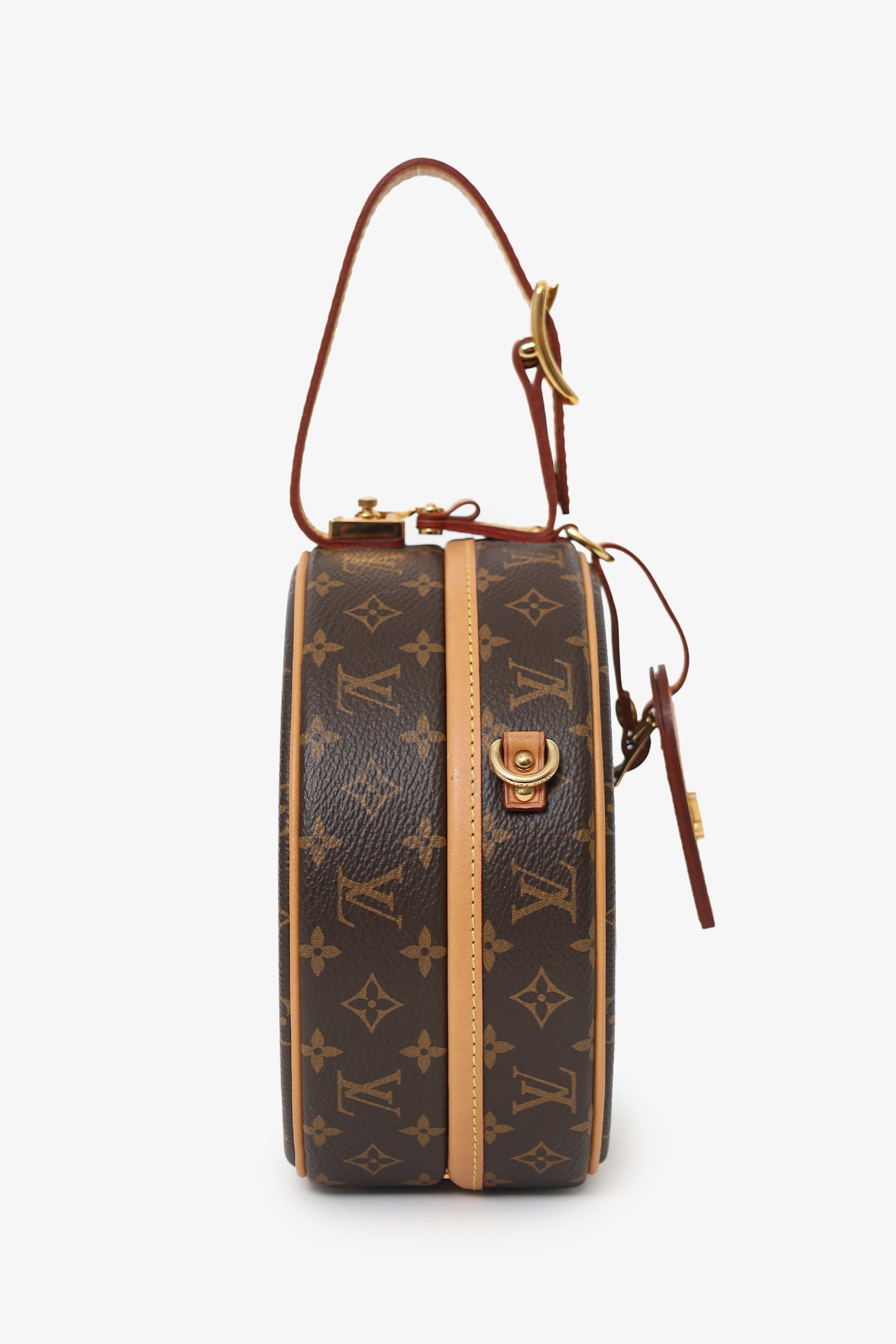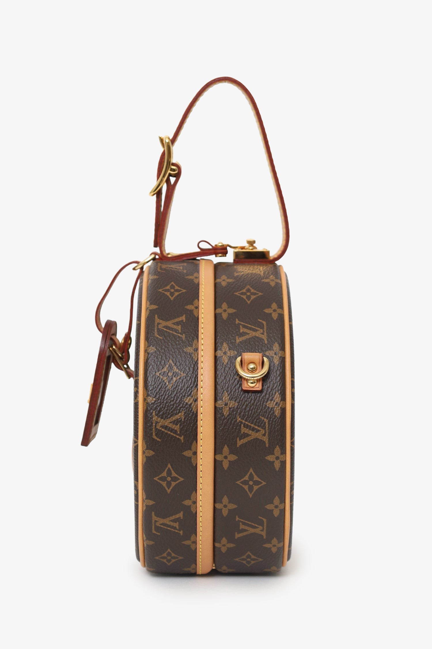 Louis Vuitton Monogram Petite Boite Chapeau With Strap. Top push-clasp closure. Top handle with adjustable pull-through buckle closure. Adjustable and removable shoulder strap with clasp closure. Protective base studs. Leather-lined interior with single rear slip pocket. Removable bag tag. Gold-tone hardware. Tonal stitching.