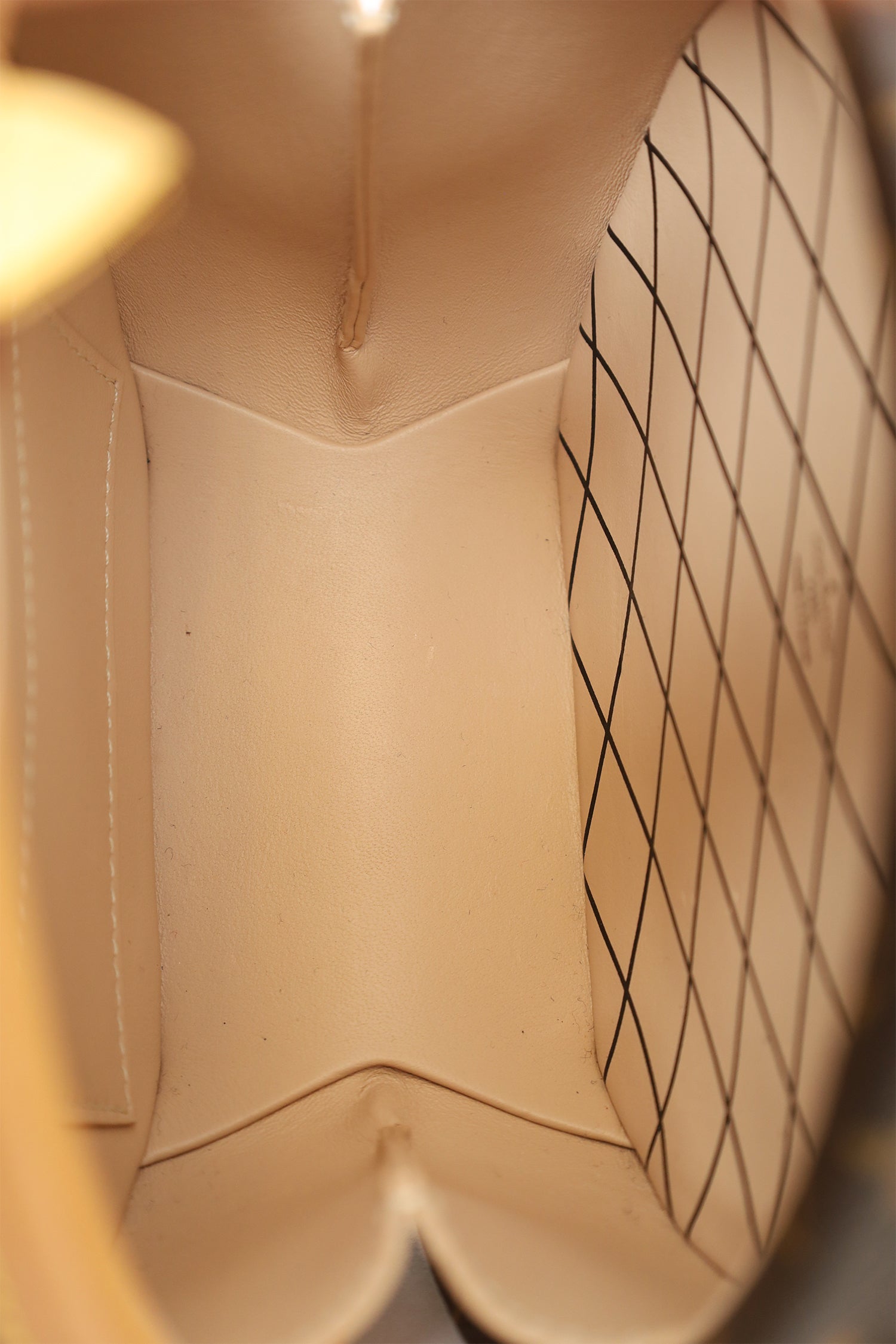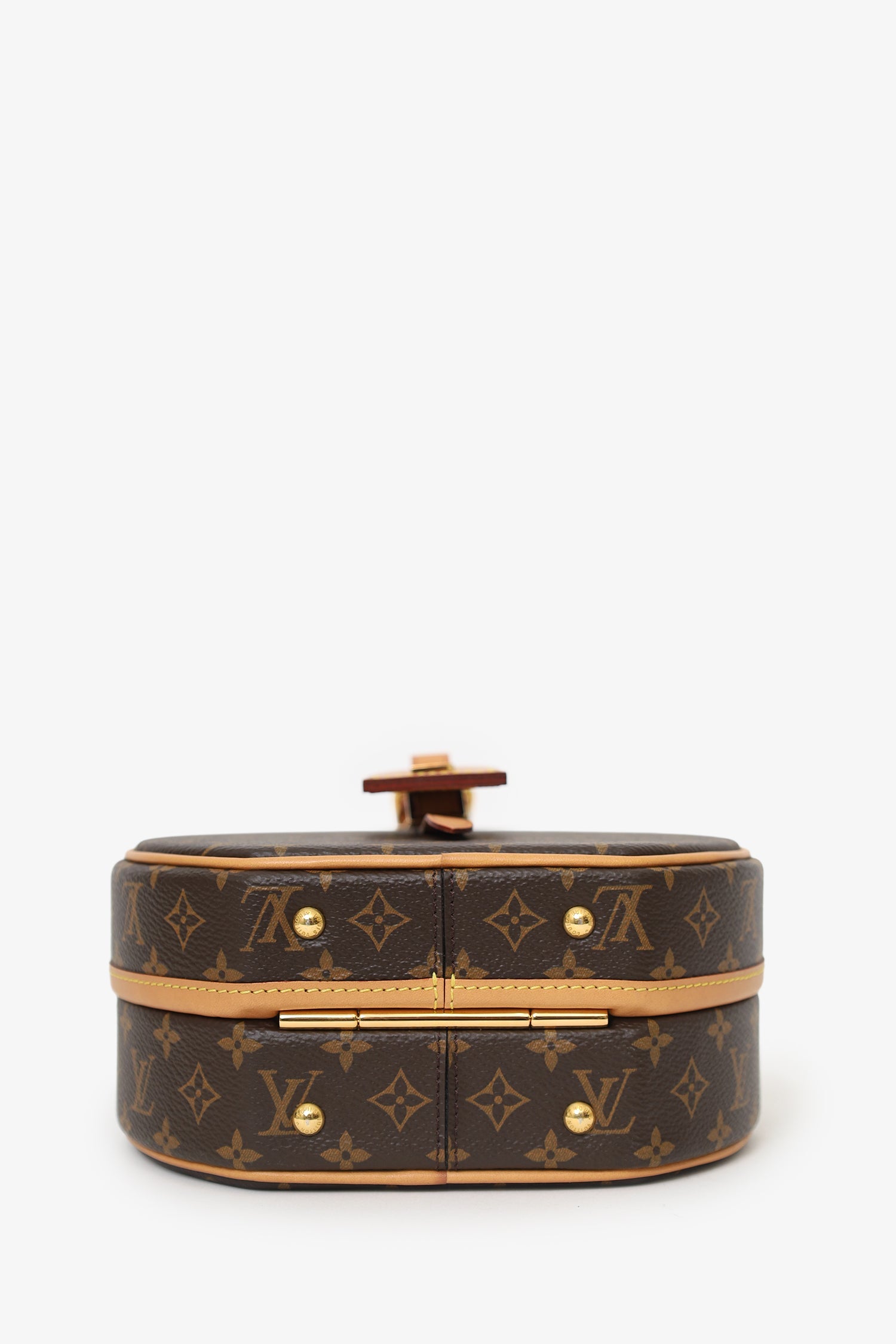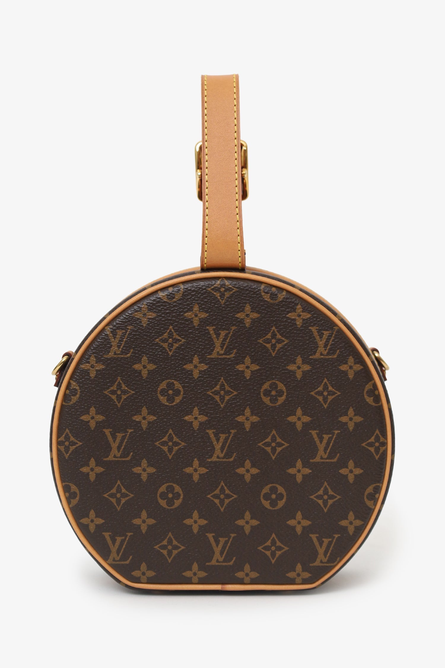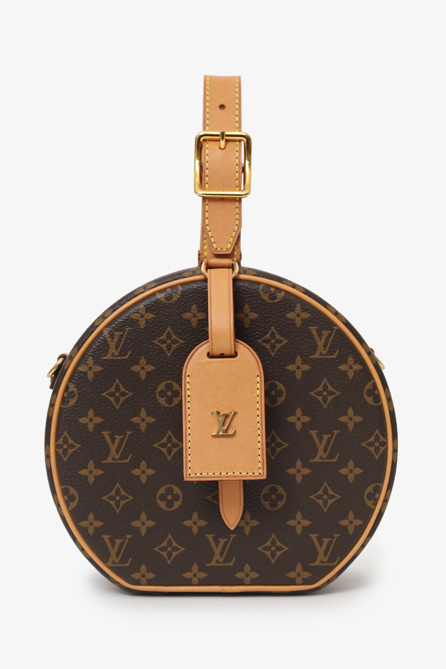 Louis Vuitton Monogram Petite Boite Chapeau With Strap. Top push-clasp closure. Top handle with adjustable pull-through buckle closure. Adjustable and removable shoulder strap with clasp closure. Protective base studs. Leather-lined interior with single rear slip pocket. Removable bag tag. Gold-tone hardware. Tonal stitching.