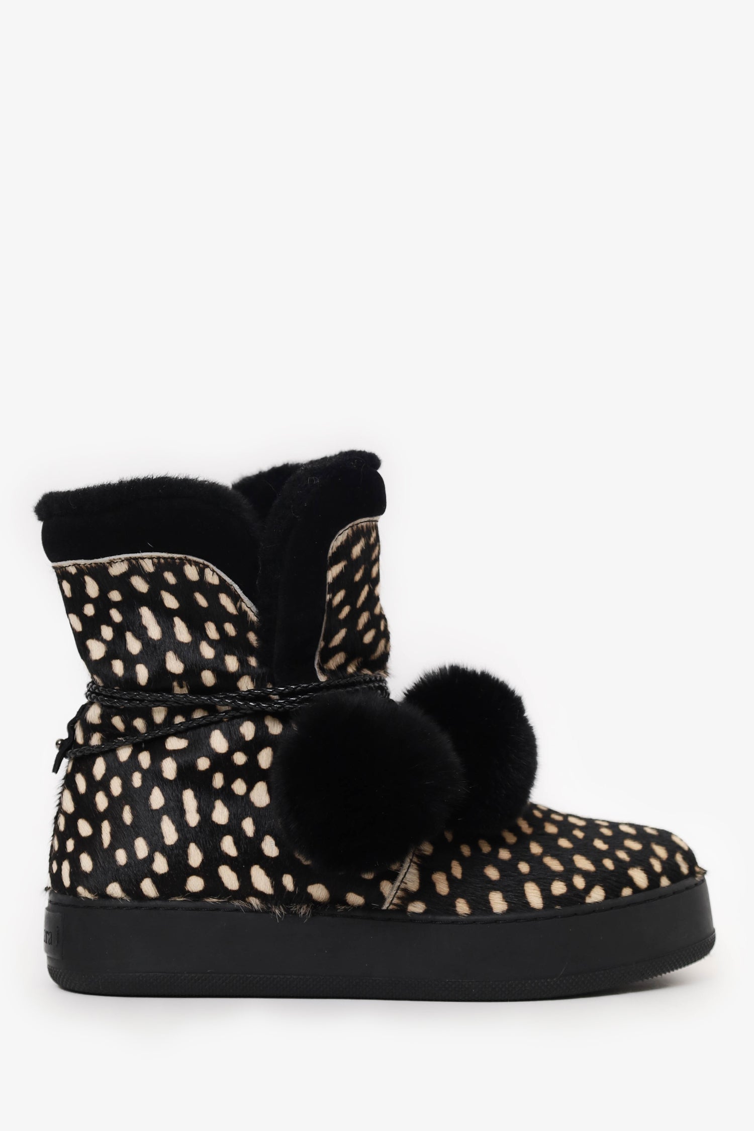 Max Mara Black/White Animal Print Pony Hair Pom Pom Winter Boots. Pull on. Round toe. Tonal stitching.