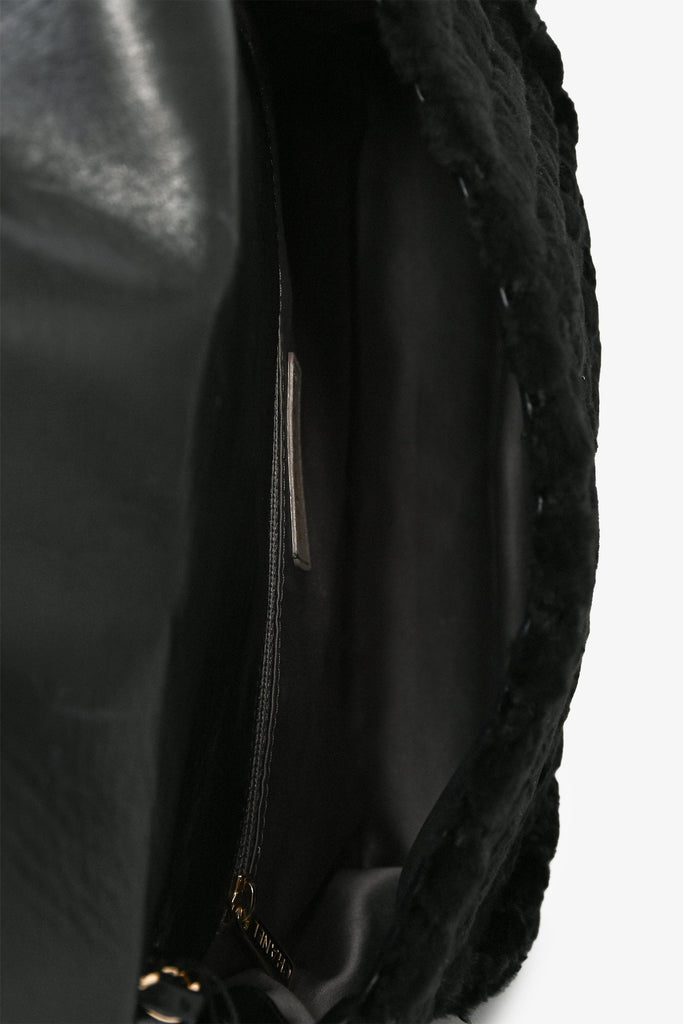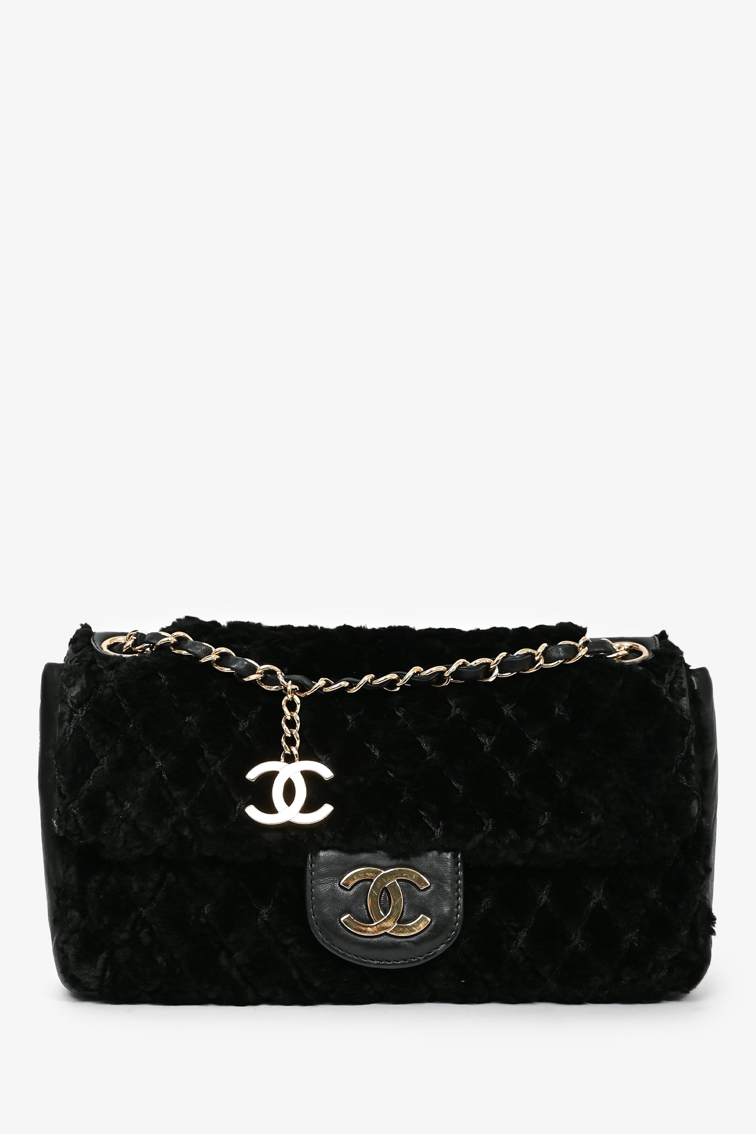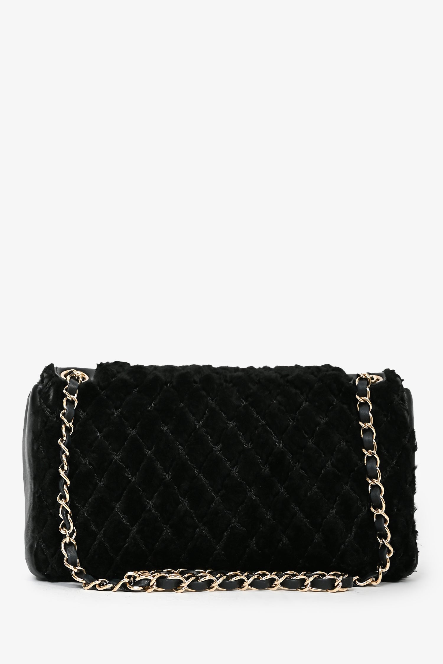 Pre-loved Chanel™ 2008/09 Black Rabbit Fur/Calfskin Leather Flap Bag. Front flap with magnetic closure. A single open compartment includes a wall pocket with zipper closure. Double chain strap. Gold-tone hardware. Tonal stitching.