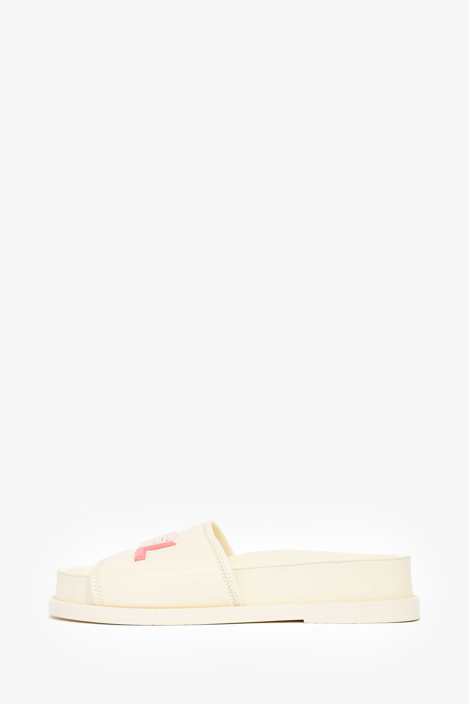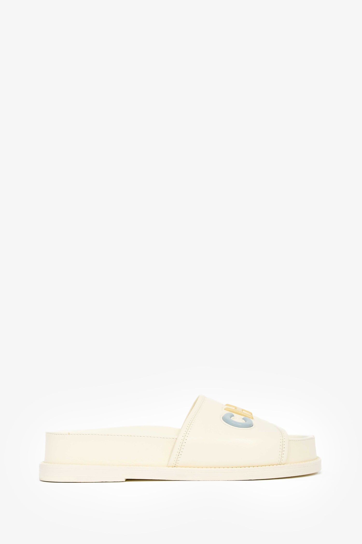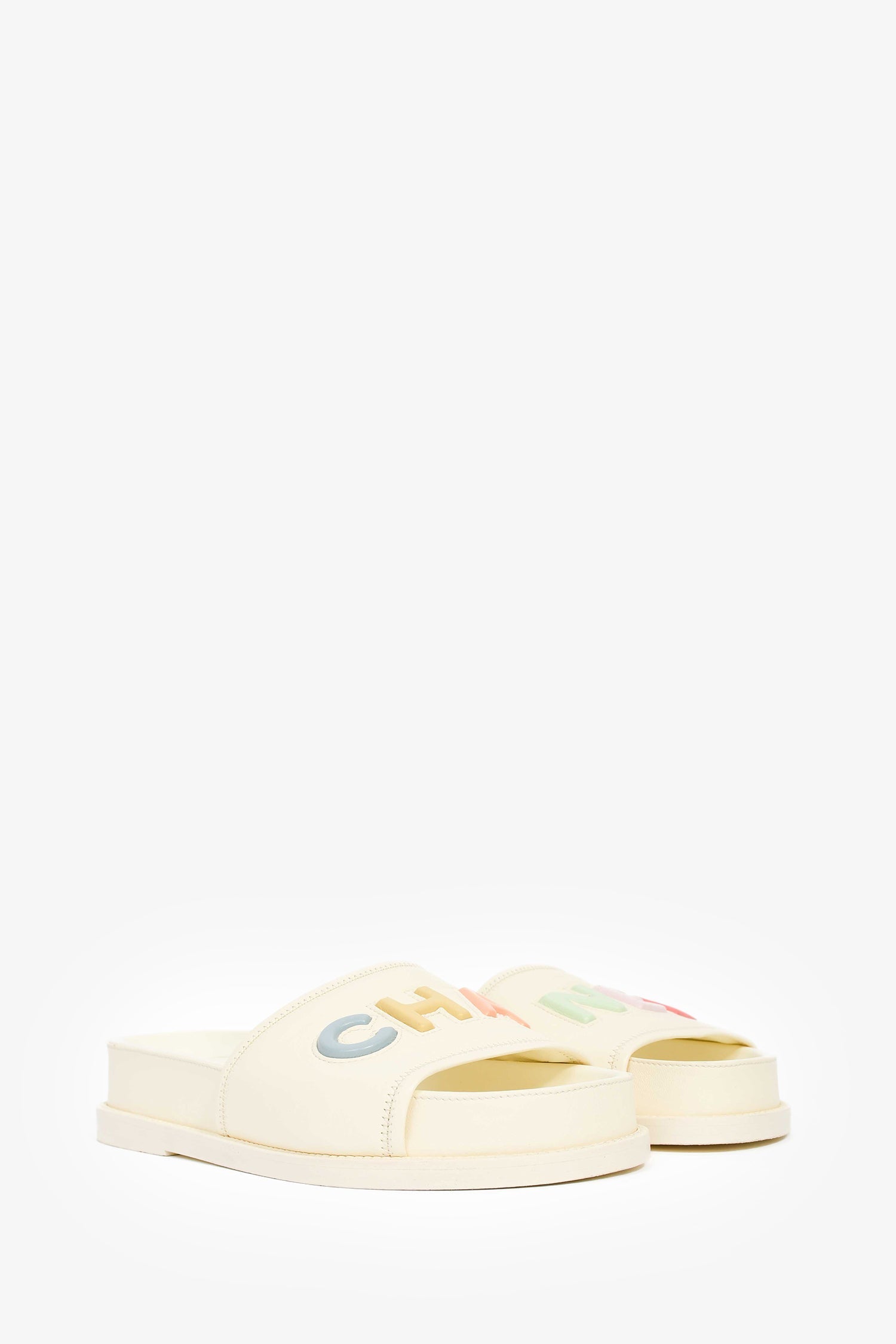 Pre-Loved Chanel™ 2022 Cream Leather Pastel 'CHANEL' Slides. Round, open toe. Slip-on. Platform soles.